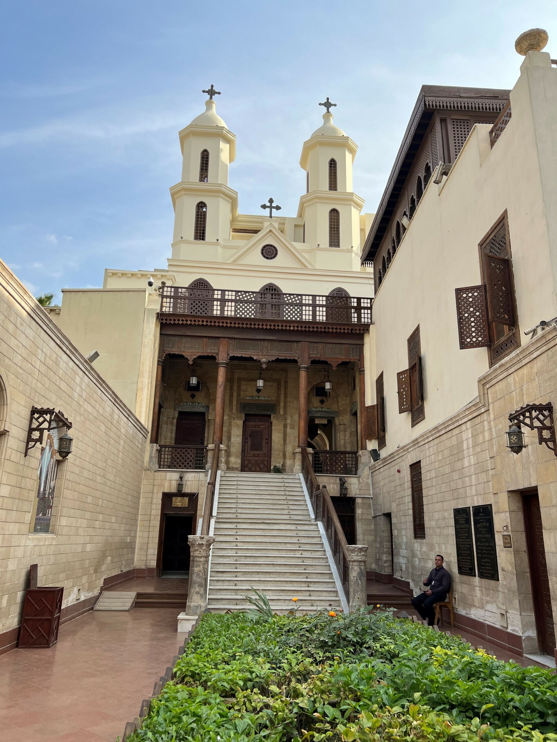 Η Ιερά Πατριαρχική Μονή του Αγίου Γεωργίου που ομολόγησε την πίστη του και βασανίστηκε ο ομώνυμος Άγιος βρίσκεται στο παλαιό Κάιρο. Εκεί υπάρχει μέχρι σήμερα η κρύπτη και το πηγάδι της Παναγίας όπου η παράδοση λέει ότι κρύφτηκε για αρκετό διάστημα η Παναγία με το Χριστό. Σήμερα είναι ένα από τα πλέον πυκνοκατοικημένα προάστια του Καΐρου, με μοναστήρια, ναούς και Κοιμητήρια. Εκεί, σώζεται το αναφερόμενο από τον Στράβωνα και άλλους συγγραφείς ρωμαϊκό φρούριο της Βαβυλώνας. Ο ηγούμενος της εκκλησίας πάτερ, Δαμασκηνός Αλαζράη μάς λέει «Το Μοναστήρι είναι πόλος έλξης, όχι μόνο για τους Ορθοδόξους, αλλά και για τους Κόπτες, Καθολικούς και Μουσουλμάνους. Άνθρωποι απ’ όλα τα μέρη της Αιγύπτου και του υπόλοιπου κόσμου συρρέουν στο Μοναστήρι, προκειμένου να προσευχηθούν στην εικόνα του Αγίου. Η εικόνα αυτή διασώθηκε από την καταστροφική πυρκαγιά του 1904, η οποία κατέκαψε το ναό». Παρατηρήστε τον τρούλο του ναού που ζωγράφισε ο Παρθένης. Λίγο πιο κάτω με τα πόδια θα δείτε και τη κρεμαστή εκκλησία.