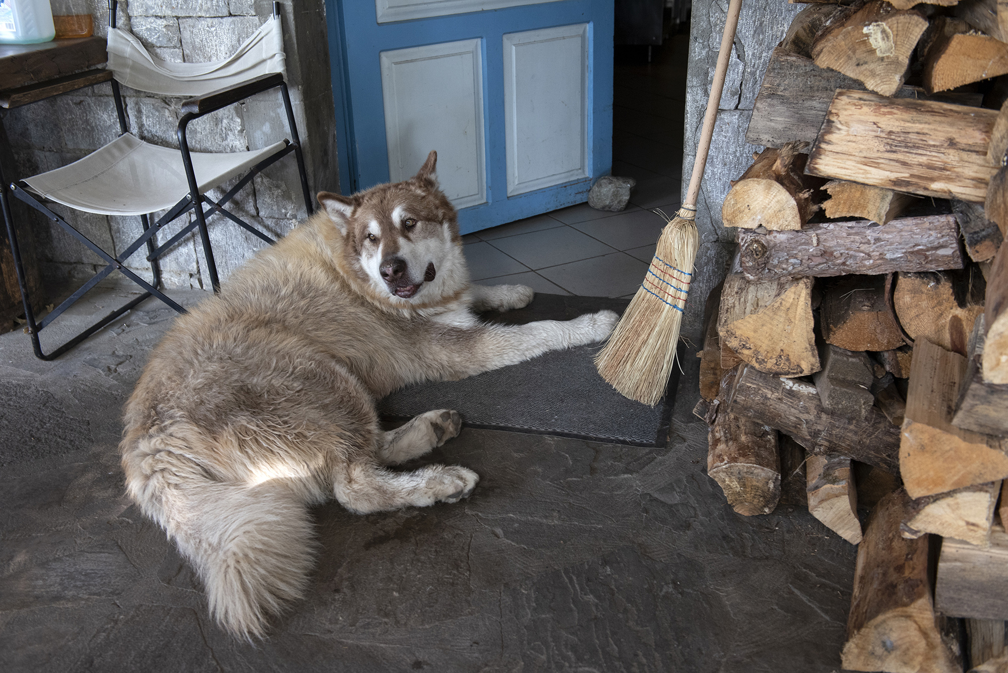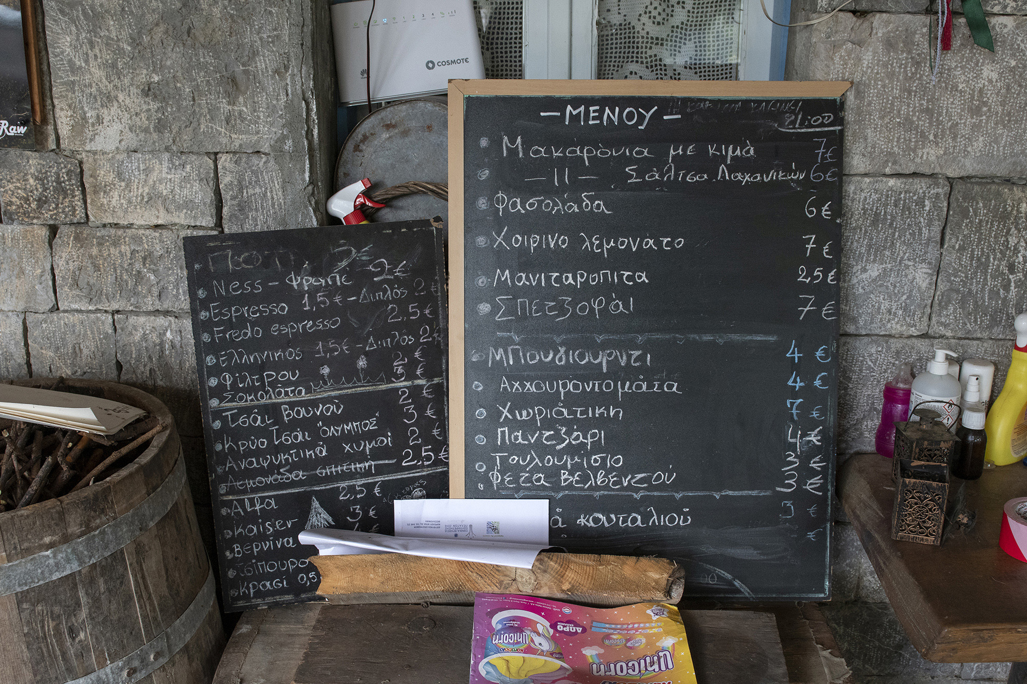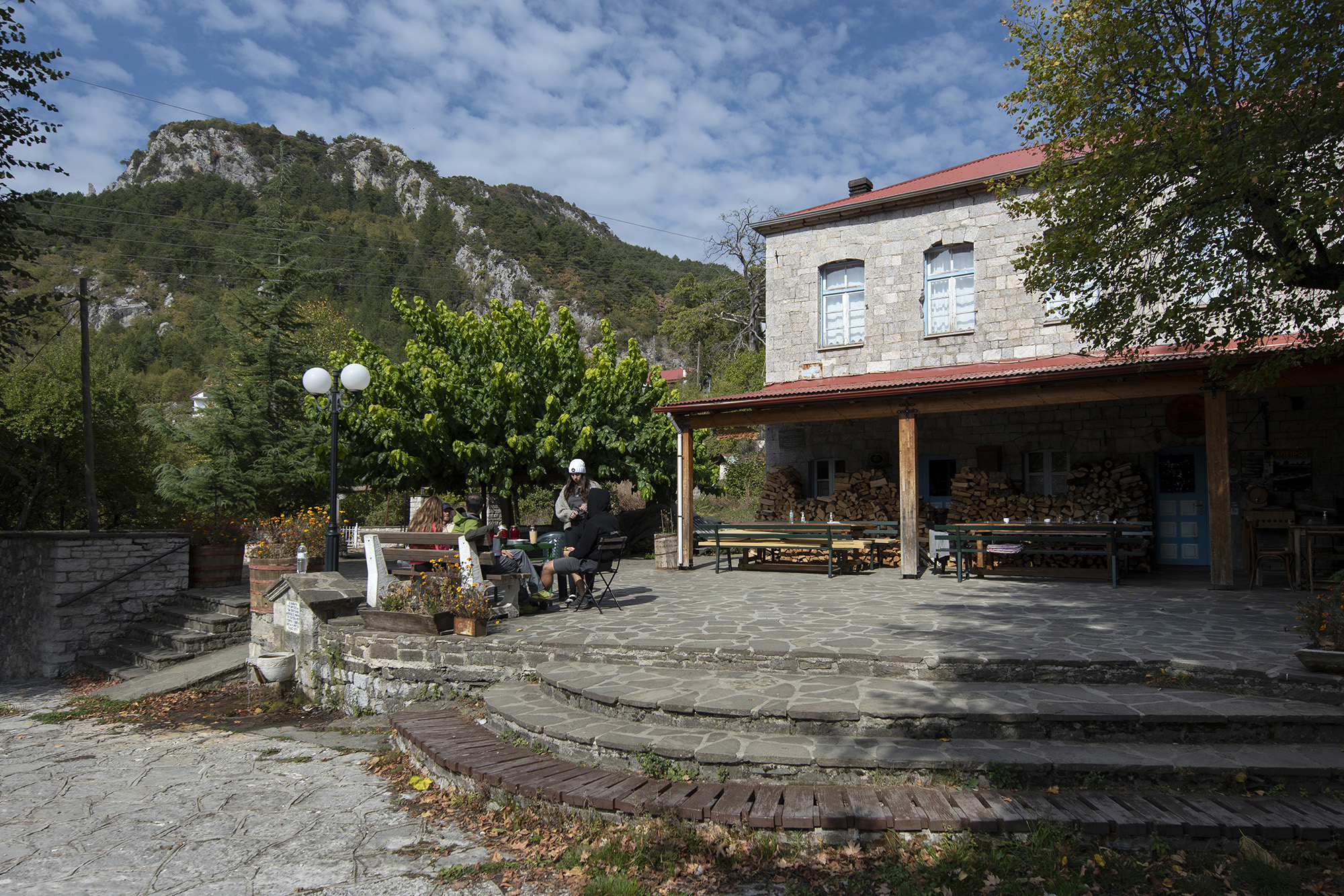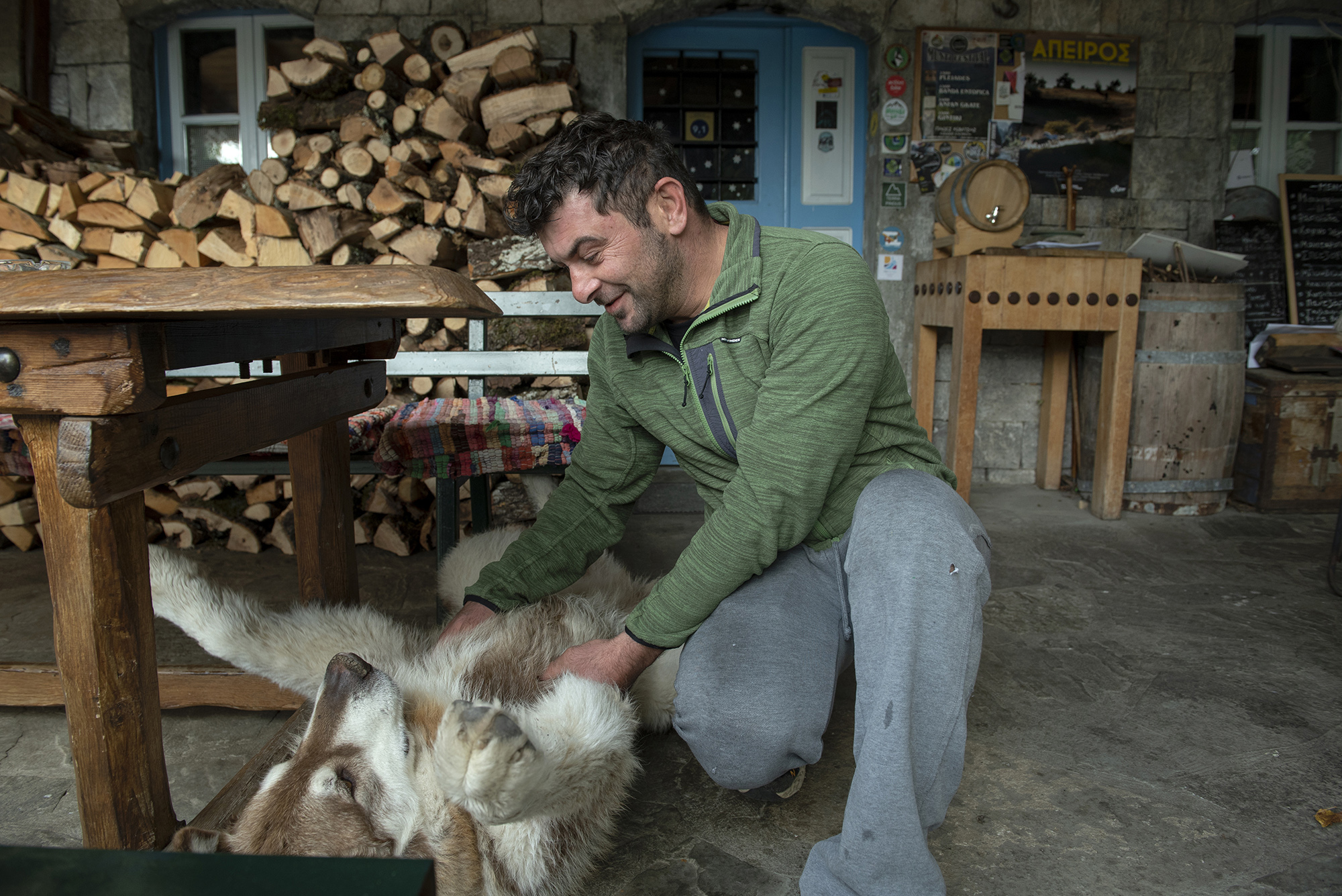 Είμαστε στο πρώτο δεκαήμερα του Οκτωβρίου. Η θερμοκρασία είναι κάτω από τους 10 βαθμούς με το υψόμετρο στα 1140 μέτρα. Καθόμαστε με τον Δημήτρη στην αυλή του ξενώνα που είναι πάνω ακριβώς στην πλατεία του χωριού. «Αρκετοί από τους λιγοστούς κατοίκους, μου είχαν προτείνει να ασχοληθώ με τον ξενώνα και το καφενείο. Μία μέρα έμαθα ότι βγαίνει σε δημοπρασία. Δεν χρειάστηκε να το σκεφτούμε δεύτερη φορά». Παρατηρώ τον Δημήτρη όσο εκείνος μιλάει. Είναι ήρεμος, χαλαρός και αντιλαμβάνεται την πραγματική αξία του χρόνου. Κάθεται μπροστά σε μία τεράστια στοίβα από ξύλα που φτάνουν σχεδόν μέχρι τη σκεπή, και μάλιστα σε απόσταση αναπνοής από την πόρτα ώστε να είναι προσβάσιμα ακόμη και εκείνες τις μέρες που το χιόνι δεν θα επιτρέπει πολλές μετακινήσεις.