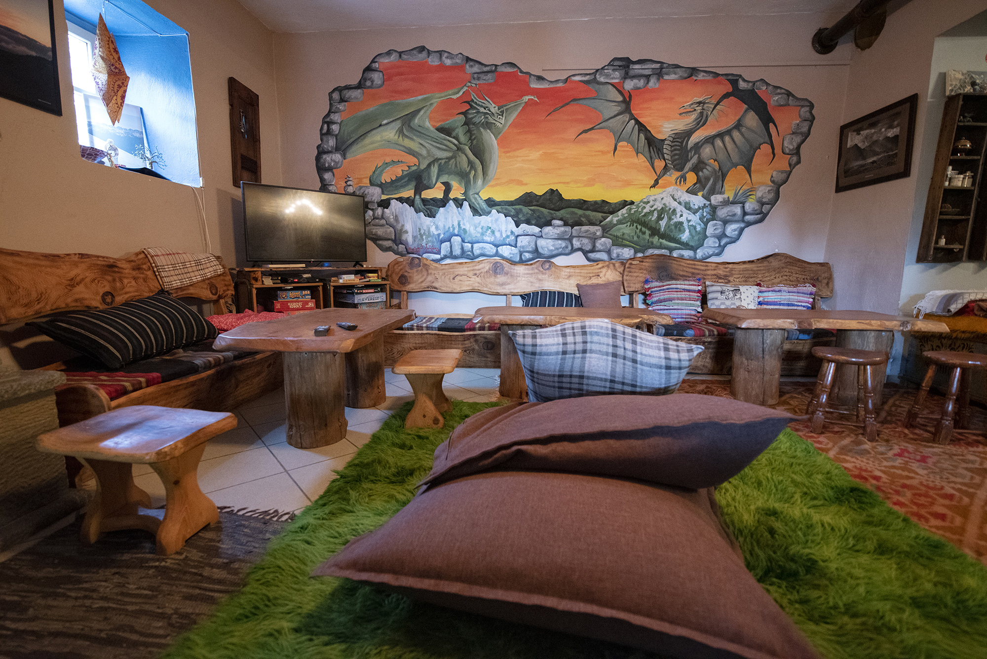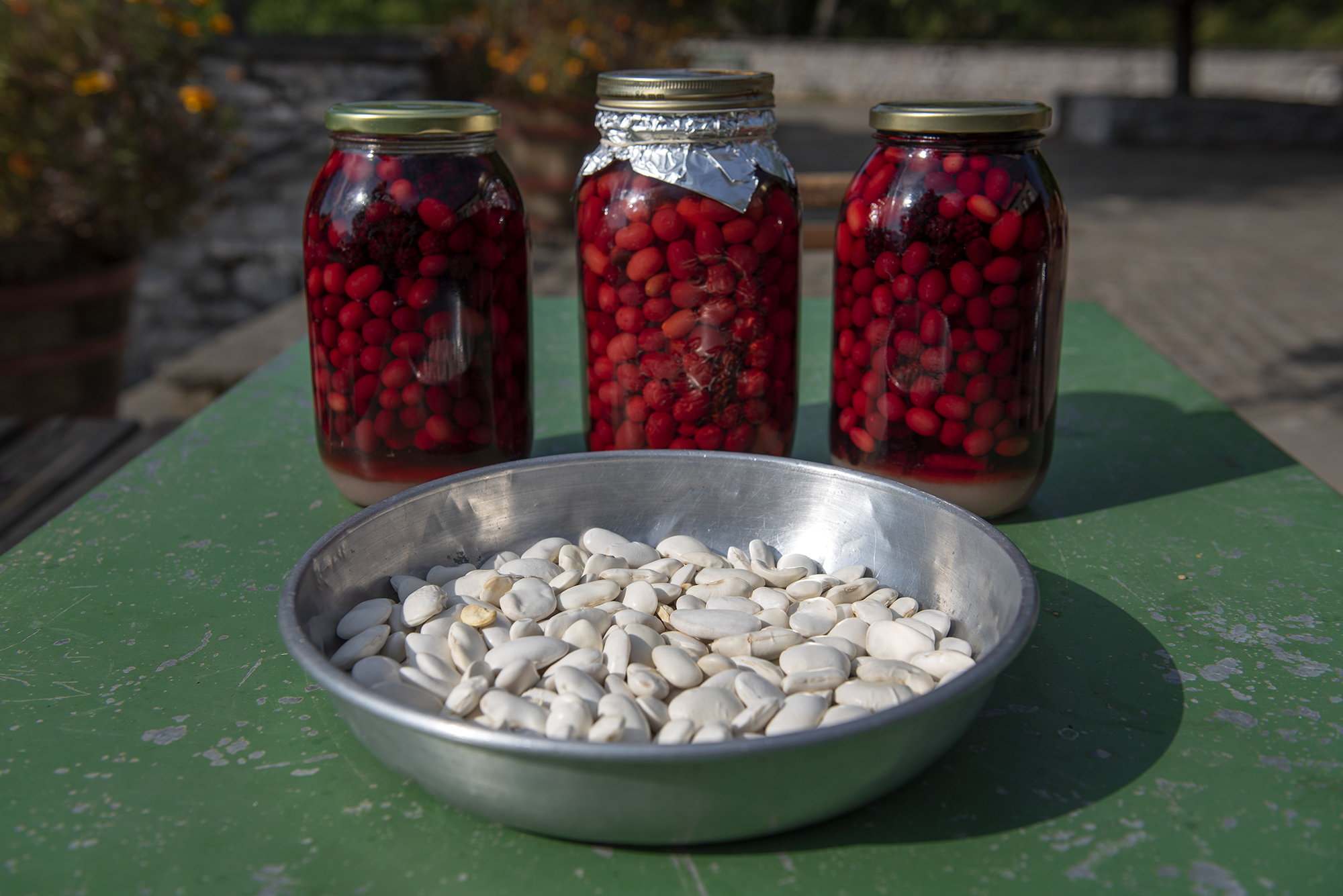 Λίγο πιο πέρα βλέπουμε μία λεκάνη γεμάτη με ολόλευκα φασόλια γίγαντες αλλά και μερικά μεγάλα γυάλινα βάζα με κράνα τα οποία αξιοποιούνται για να φτιαχτεί το περίφημο λικέρ. Όσο περνάει η ώρα, ο καιρός κρυώνει περισσότερο. Ρίχνω μία κλεφτή ματιά στη πανέμορφη ζεστή σάλα και η Αγγελική, φίλη του Δημήτρη η οποία έχει επισκεφτεί τον ξενώνα, μας κερνάει ένα pancake με μέλι, που μόλις βγήκε από την κουζίνα.
