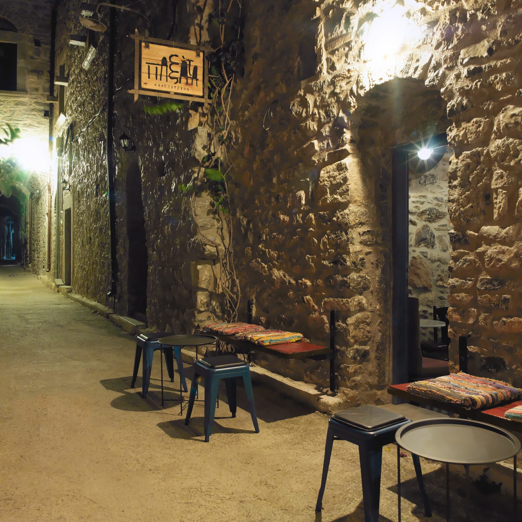 Απέναντι από την εκκλησία του Παλαιού Ταξιάρχη θα συναντήσετε ένα ατμοσφαιρικό καφέ-μπαρ που έχει διατηρήσει τη μεσαιωνική γοητεία και τον αρχιτεκτονικό χαρακτήρα της περιοχής. Η ειδυλλιακή βεράντα του είναι το ιδανικό μέρος για να χαλαρώσετε και να απολαύσετε τον πρωινό σας καφέ, γλυκά, σνακ ή ένα ποτό το βράδυ.