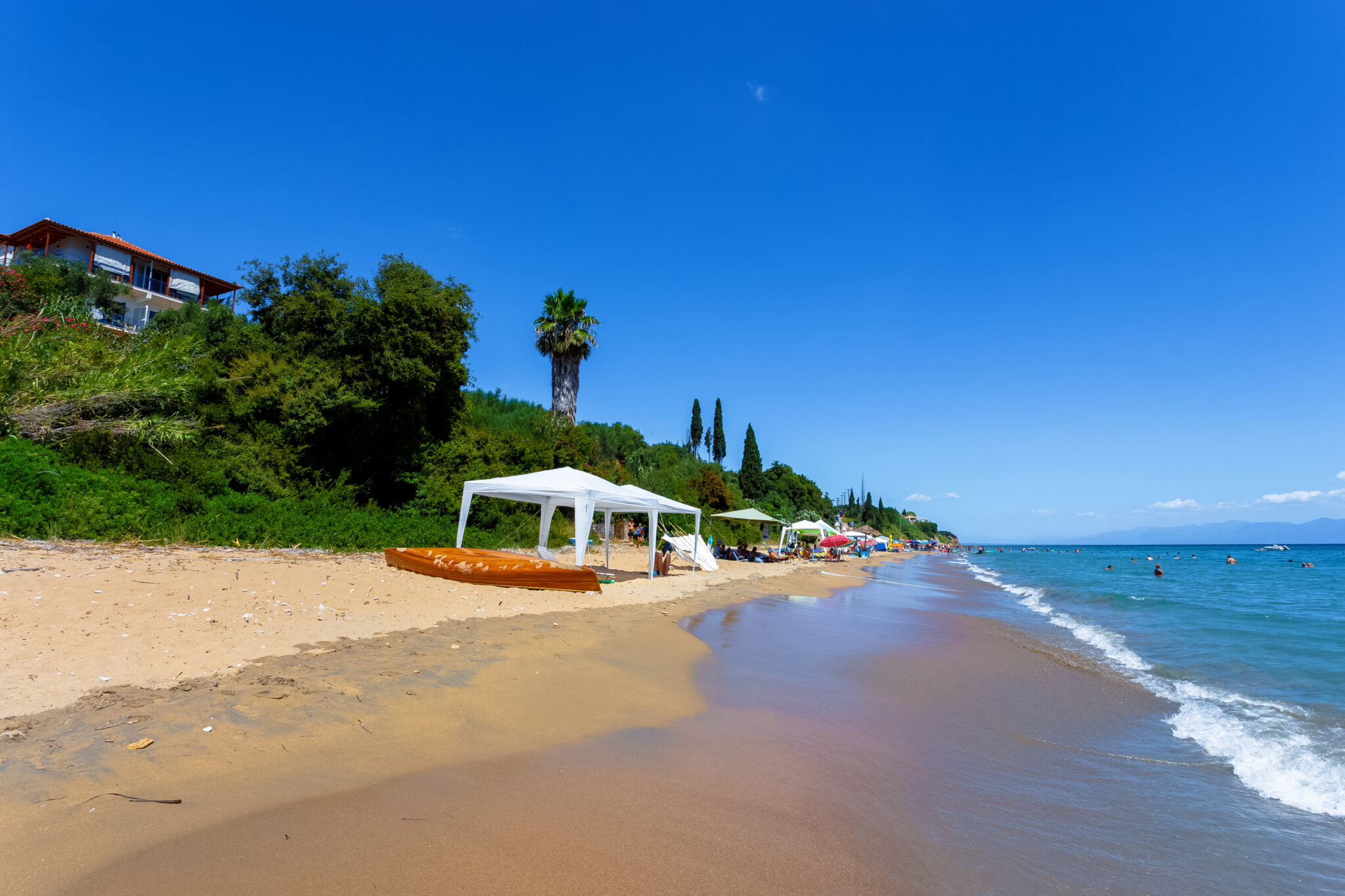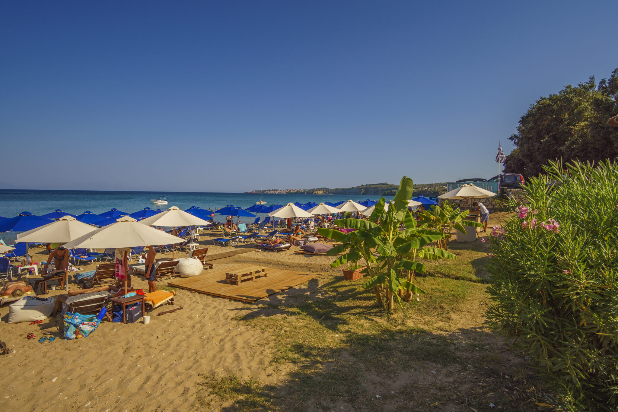 Μία χρυσαφένια αμμουδιά που εκτείνεται για περίπου 1300 μέτρα και μια πραγματικά διάφανη θάλασσα αλλά και πολύ πράσινο με τα φυτά και τα δέντρα, ανάμεσα τους κυπαρίσσια και φοίνικες να μοιάζουν να θέλουν να «εισβάλλουν» στη θάλασσα.