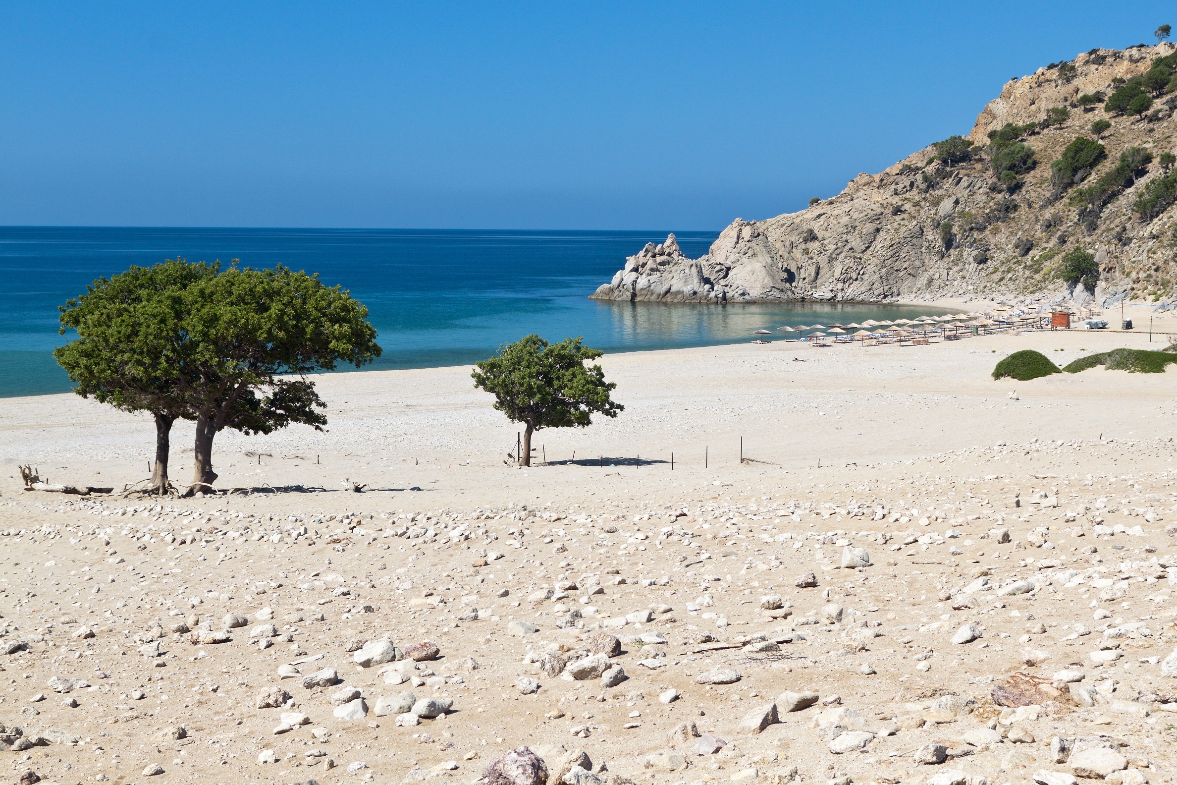 Βάτος: Βρίσκεται ανατολικά της Παχιάς Άμμου, με λευκή άμμο και πέτρες να ξεπροβάλουν από το νερό. Ο πιο εύκολος τρόπος για να προσεγγίσετε την παραλία είναι με πλοιάριο. Εδώ καταλήγουν τα νερά του καταρράκτη Κρεμαστού και τα βράχια που ονομάζονται «Της Γριάς τα Πανιά». Αν έχετε εμπειρία στην πεζοπορία, μπορείτε να φτάσετε στην παραλία διασχίζοντας το δύσβατο φαράγγι του Βάτου, από τις πιο δύσκολες διαδρομές του όρους Σάος και γι’ αυτό συνίσταται προσοχή.