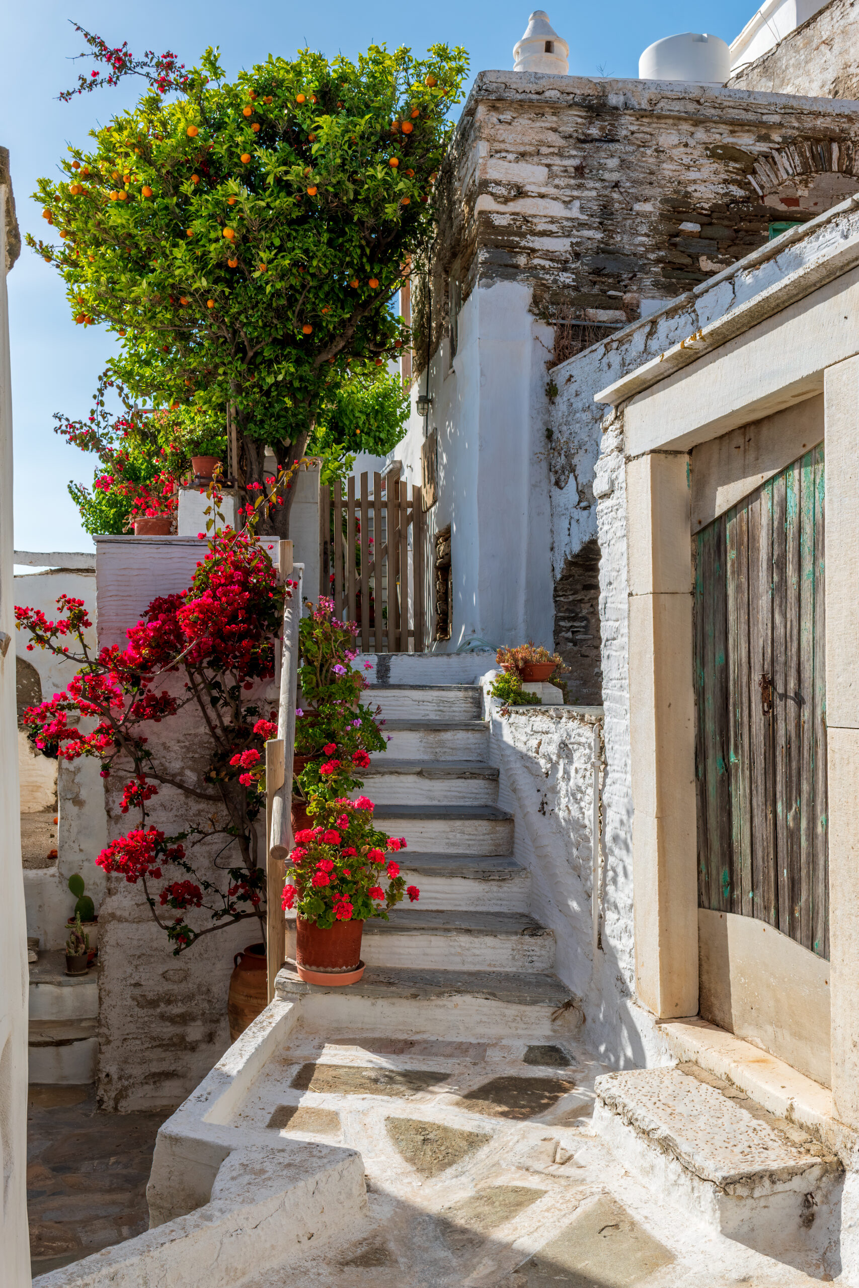 Κάτι περισσότερο από 20 χιλιόμετρα βόρεια της Χώρας της Τήνου, χτισμένα αμφιθεατρικά στην πλαγιά του λόφου Μεροβίγλια, τα Υστέρνια φάνηκαν μπροστά μας σύντομα. Αφήσαμε το αυτοκίνητο στον υπαίθριο χώρο στάθμευσης και, με μια βαθιά ανάσα που γέμισε τα ρουθούνια μας αρώματα από μοσχοσίταρο, βουτήξαμε στα στενυγρά μαρμαρόστρωτα δρομάκια του ολόλευκου αυτού χωριού που υπήρξε κάποτε ένα από τα μεγαλύτερα και πιο ακμαία χωριά του νησιού. Το χωριό γνώρισε μεγάλη αίγλη κυρίως κατά τον 18ο και 19ο αιώνα χάρη στην αφθονία της περιοχής σε κοιτάσματα μαρμάρου και έφτασε το 1834 – σύμφωνα με την τότε απογραφή – να μετρά 1.021 μόνιμους κατοίκους. Σήμερα δεν ξεπερνούν τους 150.