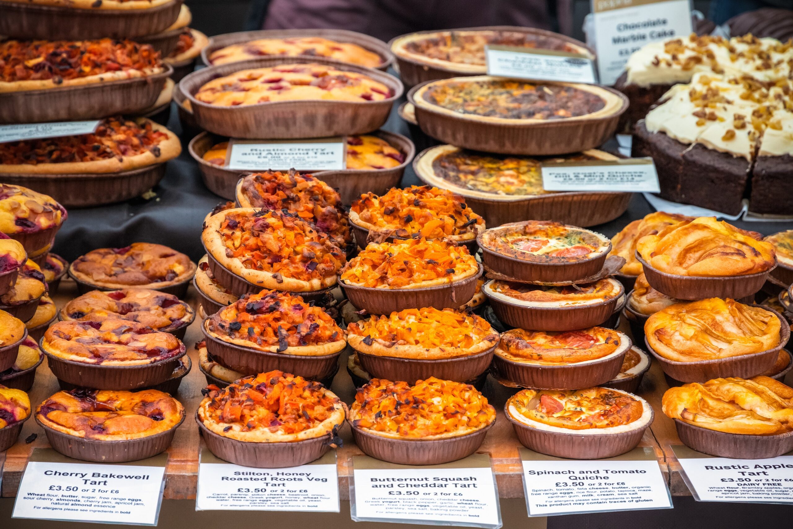 Μη χάσετε: τις φρεσκοψημένες βρετανικές πίτες του Pieminister –με γλυκοπατάτα και κατσικίσιο τυρί ή με μοσχάρι μαγειρεμένο σε μπύρα-, τις ισπανικές εμπανάδας του Portena, τα θρυλικά σάντουιτς με τριπλό τυρί και χειροποίητο ψωμί του Kappacasein και τα απίθανα ντόνατ του Bread Ahead με τη γέμιση που ξεχειλίζει.