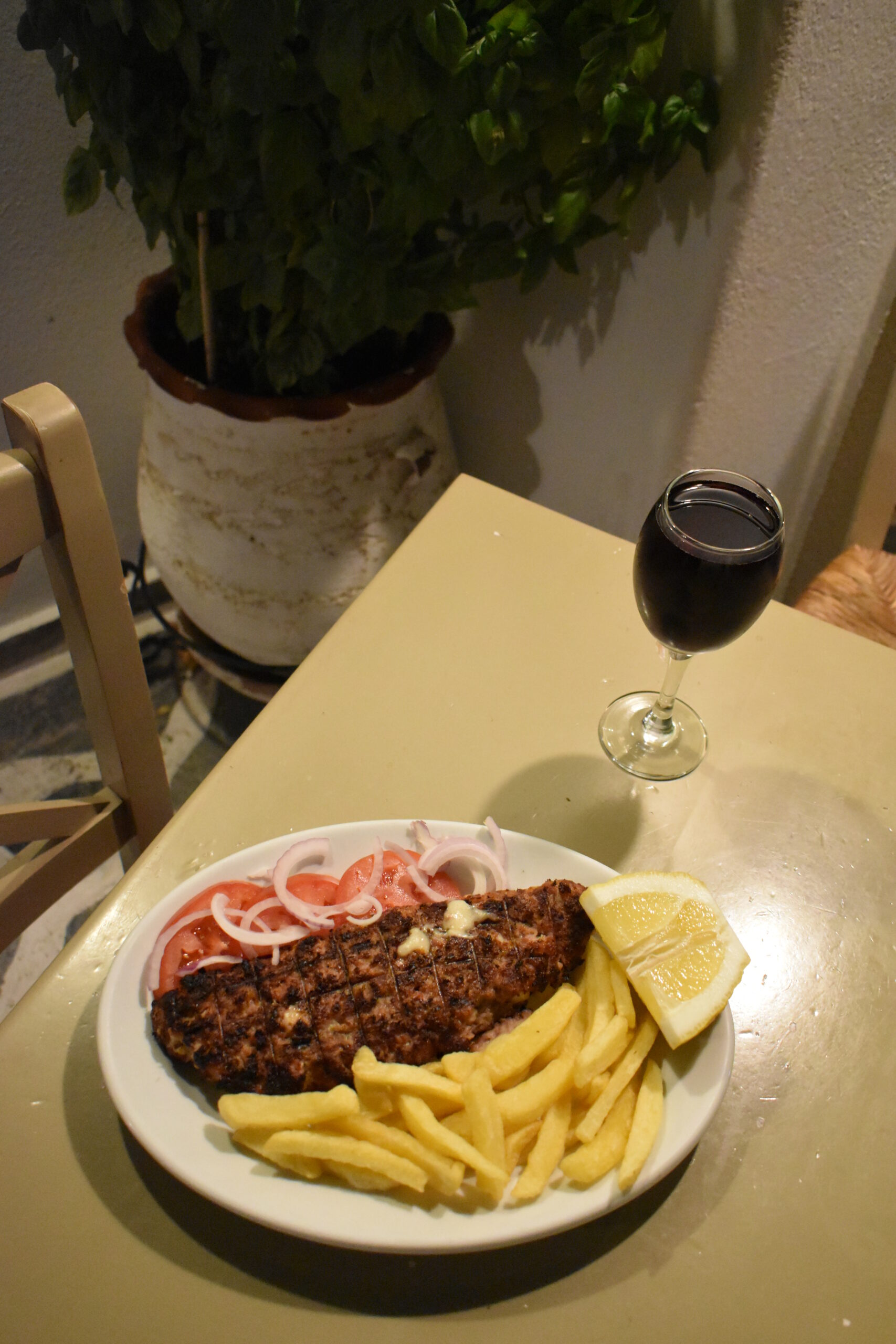 Το must έδεσμα εδώ είναι το αφράτο και ζουμερό γεμιστό μπιφτέκι με φρέσκια ντομάτα και τυρί – προτιμήστε το με γραβιέρα Νάξου αντί με φέτα -, υπερμέγεθες, ζυμωμένο από χοιρινό κιμά, καλοψημένο και πλαισιωμένο από χρυσαφένιες, φρεσκοτηγανισμένες πατάτες. Όσο κι αν είναι δύσκολο, προσπαθήστε να αφήσετε χώρο για τη σπιτική πορτοκαλόπιτα, εγκάρδιο κέρασμα από τα χέρια της κυρίας Μαρίνας, που θα κλείσει γλυκά το γεύμα σας.
