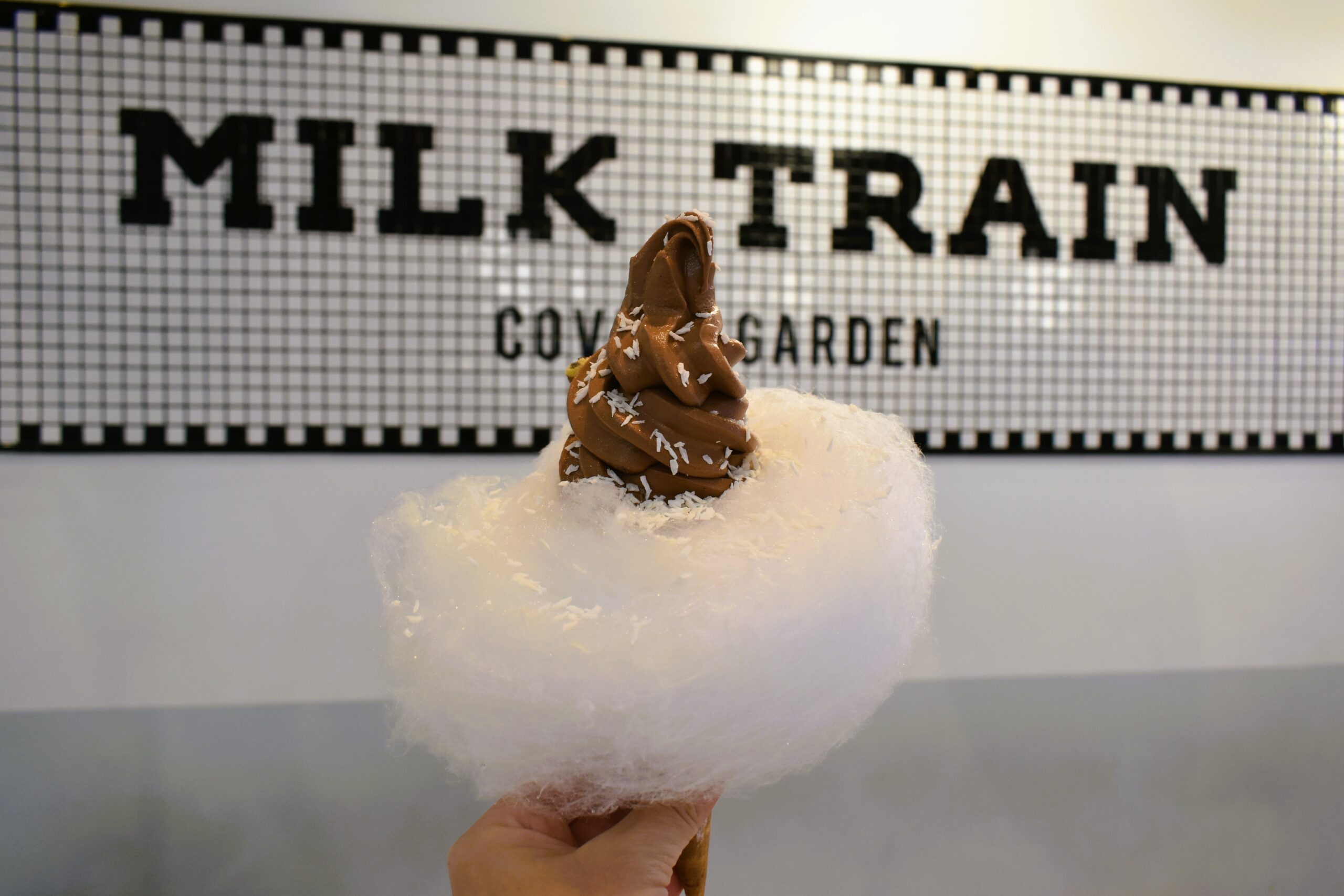 Με αφετηρία την αγορά του Covent Garden και όχημα το Milk Train ξεκινάμε για ένα παιχνιδιάρικο ταξίδι στον κόσμο της δροσερής απόλαυσης. Μας συντροφεύει ωραιότατο, πυκνό σε υφή παγωτό μηχανής, που μπορούμε να απολαύσουμε στον υπέροχο, διαμορφωμένο σαν συρμό του μετρό, ρετρό χώρο. Αυτό που που κάνει τις ουρές να σχηματίζονται δεν είναι τόσο οι ιαπωνικής φιλοσοφίας γεύσεις, τρεις στάνταρ-βανίλια, τσάι matcha και το χαρακτηριστικό του Κιότο πράσινο καβουρδισμένο τσάι hojicha- και δύο επιπλέον αναλόγως εποχής, όπως σοκολάτα-πορτοκάλι και butterscotch, αλλά τα εντυπωσιακά toppings.