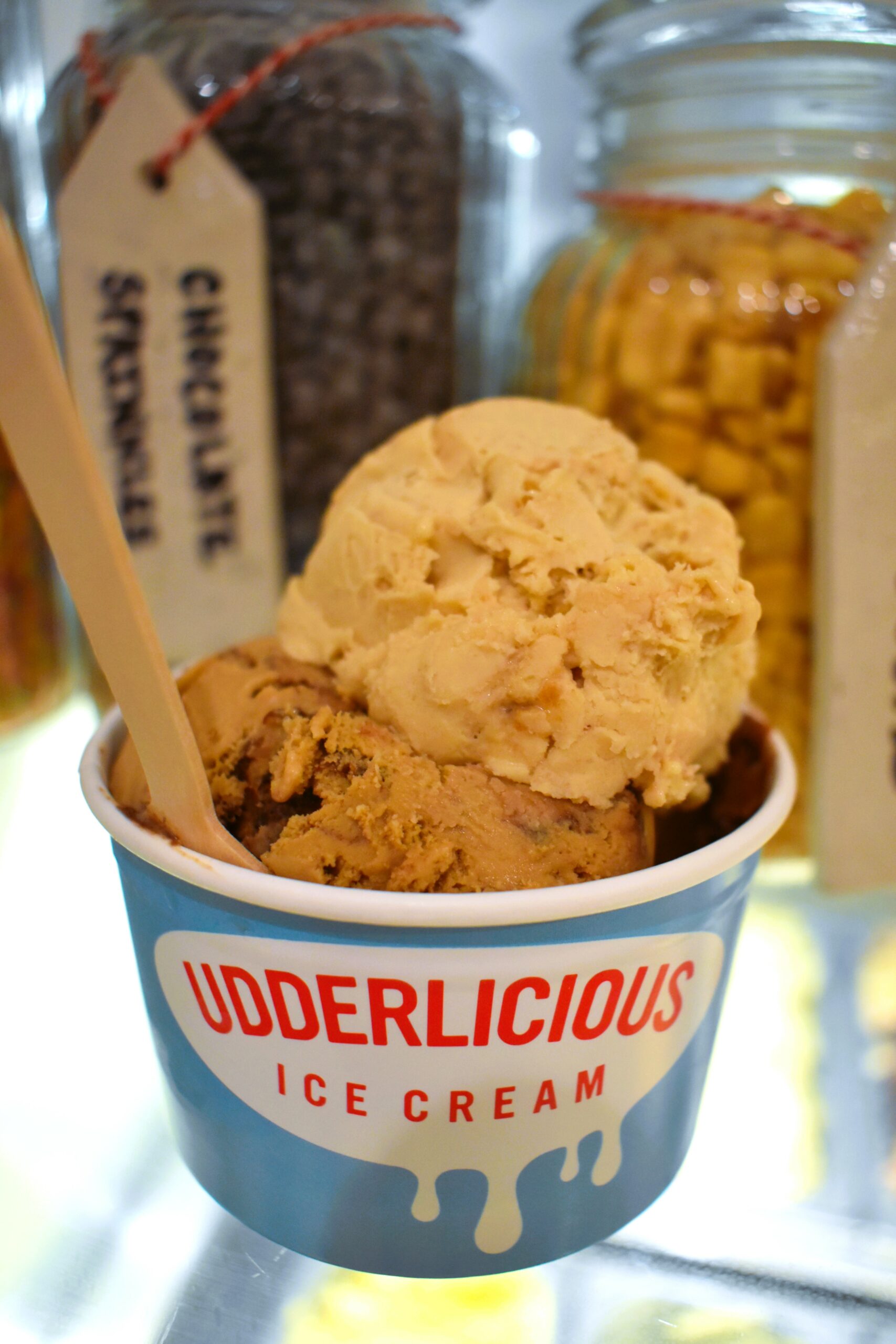 Ίδια περιοχή, εντελώς διαφορετική φιλοσοφία, όμως εξίσου απολαυστικό παγωτό. Το γωνιακό Udderlicious με τη ζωηρόχρωμη γαλάζια πρόσοψη είναι από τα πιο χαρούμενα παγωτατζίδικα του Λονδίνου, με τα γεμάτα toppings βάζα, τα φρέσκα λουλούδια και την κούνια που μαζί με το πλουσιότατο παγωτό μας μεταφέρουν κατευθείαν στην παιδική μας ηλικία. Τότε μετρούσαμε παγωτά, τώρα μετράμε γεύσεις. Συγκεκριμένα, πάνω από 20 προτάσεις που ετοιμάζονται επί τόπου καθημερινά, όπως Gingerbread, Τούρτα γενεθλίων, Σκούρα σοκολάτα με θαλασσινό αλάτι, Espresso με σοκολατένια μπισκότα, Φυστικοβούτυρο-σοκολάτα, Brownie, Αλατισμένη βανίλια με κομμάτια ζύμης μπισκότων, Μπανάνα-καραμέλα, Λευκή σοκολάτα-σμέουρο και επιπλέον δύο γεύσεις κάθε μήνα μεταξύ των οποίων καλούνται να ψηφίσουν στην ιστοσελίδα του Udderlicious οι φανατικοί του φίλοι. Ο κατόπιν κλήρωσης νικητής κερδίζει καθημερινά για όλο το μήνα, μια μπάλα από την «Flavour of the month» κι αν κι αυτό δεν ξυπνά τον παιδικό σας ενθουσιασμό, σκεφτείτε απλά ότι μπορείτε να συνοδεύσετε το παγωτό σας με ένα κομμάτι brownie και toppings όπως καραμελωμένο φουντούκι, marshmallows, νιφάδες σοκολάτες και πολύχρωμη τρούφα.