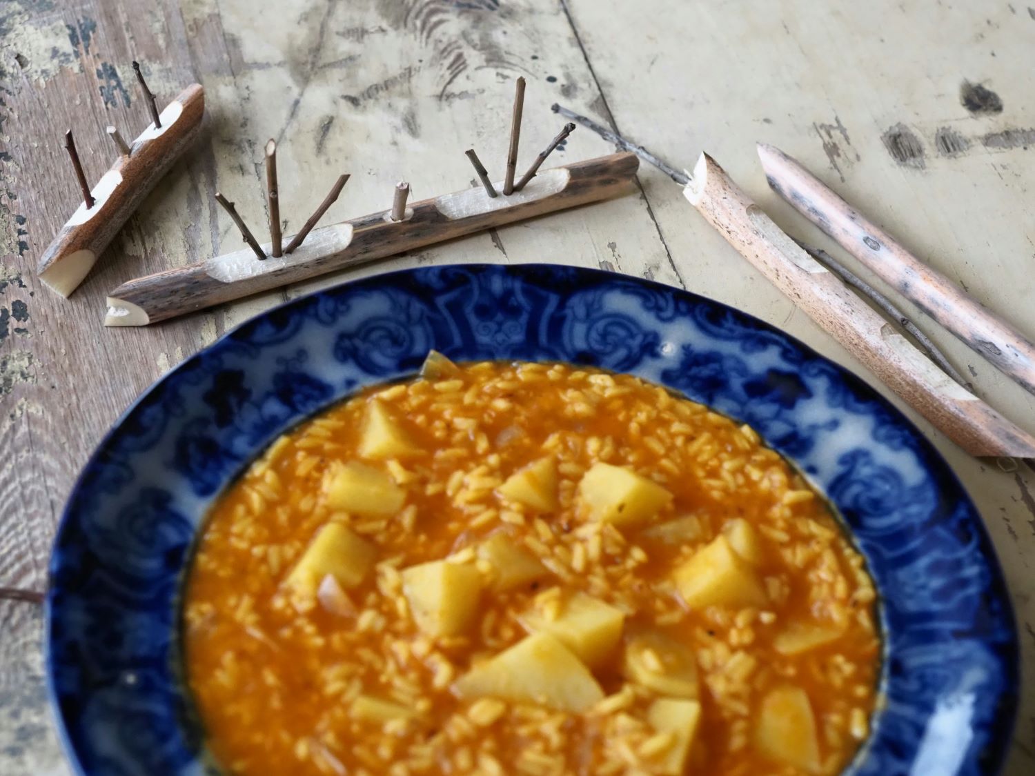 Σύμφωνα με αυτό το αυθεντικό πνεύμα της παράδοσης μαγείρεψα το δικό μου πατατόρυζο με τον τρόπο που αντιλαμβανόμαστε σήμερα τα στοιχειώδη. Τσιγάρισα στο ελαιόλαδο δύο μεγάλα ξερά κρεμμύδια ψιλοκομμένα και τρεις σκελίδες σκόρδο. Τα έσβησα με το χυμό από τρεις μεγάλες ντομάτες και ξύδι αρκετό, και καρύκευσα το φαγητό με φρεσκοτριμμένα πιπέρια μαζί με ξερό κόλιαντρο, ένα ξύλο κανέλας, τρία φύλλα δάφνης, πέντε-έξι μπαχάρια, νησιώτικο θυμάρι ανθισμένο, κουρκουμά και κάρυ. Το άφησα να βράσει, πάντα, σε χαμηλή φωτιά και το κοκκίνισα ακόμη πιο πολύ με ένα τριγωνάκι (70 γραμμάρια) ντοματοπελτέ. Πρόσθεσα όσο νερό χρειάζεται για να δέσει η σάλτα. Αφού έβρασε μια ώρα, πολτοποίησα να υλικά και διόρθωσα τη γεύση της σάλτσας με αλάτι και καυτερή, καπνιστή, πάπρικα. Μέσα σε αυτήν έβαλα τρεις μέτριες πατάτες κομμένες κύβους, δέκα λεπτά πριν βάλω ένα τέταρτο ρύζι «νυχάκι» και το νερό που χρειάζεται να έρθει στα ίσια με το ριζότο. Και ω του θαύματος, όταν «κοίνωσα» το πατατόρυζο για να το φωτογραφίσω, δεν είχα ένα απλό φαγητό μέσα στο παλιό πιάτο όπως αυτά που έφερναν από τη Λόντρα στην Κάσο, αλλά την αλήθεια της φτωχικής, διαχρονικής, κουζίνας και την αενάως επίκαιρη ιδεολογία της, ανέπαφης από τον πληθωρισμό των αγαθών και της υπερκατανάλωσης.