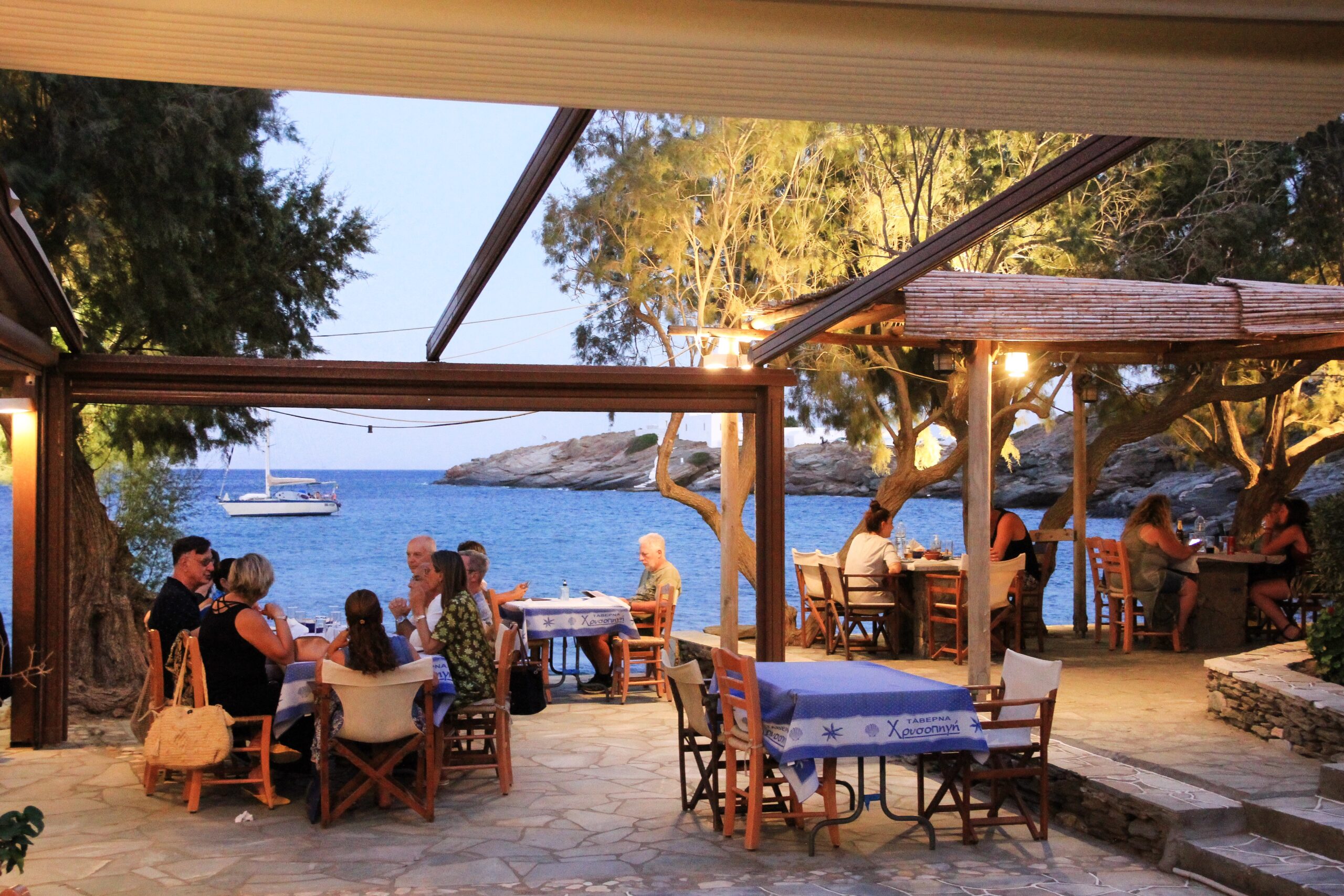 Η ταβέρνα παραδοσιακή, με άνετη πλακόστρωτη αυλή και δέντρα που χαρίζουν δροσιά. Χτισμένη δίπλα στην παραλία, προσφέρει ανεπανάληπτη θέα στα καταγάλανα νερά του κόλπου αλλά και στο πανέμορφο μοναστήρι της Παναγίας Χρυσοπηγής, της πολιούχου του νησιού, που δεσπόζει πάνω στο βράχο. Το απόλυτα χαλαρό σκηνικό δημιουργεί έντονα ευχάριστη διάθεση ενώ η οικογενειακή φιλοξενία αποπνέει σπιτική θαλπωρή. Η, δε, κουζίνα προσφέρει γευστικές συγκινήσεις με τις ποιοτικές και καλομαγειρεμένες λιχουδιές της. «Έχω μεγαλώσει στις παραλίες, τα χωράφια και τα μποστάνια του νησιού. Αγαπώ τον τόπο και το φαγητό του γι’ αυτό και η κουζίνα μας είναι καθαρά παραδοσιακή, με οικογενειακές συνταγές. Στόχος μας είναι να προσφέρουμε στους καλεσμένους μας γεύσεις της Σίφνου», λέει ο Γιώργος ενώ τονίζει «δεν κάνει κανείς μάγια στην κουζίνα, χρειάζεται άριστη πρώτη ύλη. Άμα δεν βάλεις καλό προϊόν στην κατσαρόλα δεν βγάζεις και καλό πιάτο. Η πηγή των προϊόντων μας είναι κάτι που προσέχω πάρα πολύ».