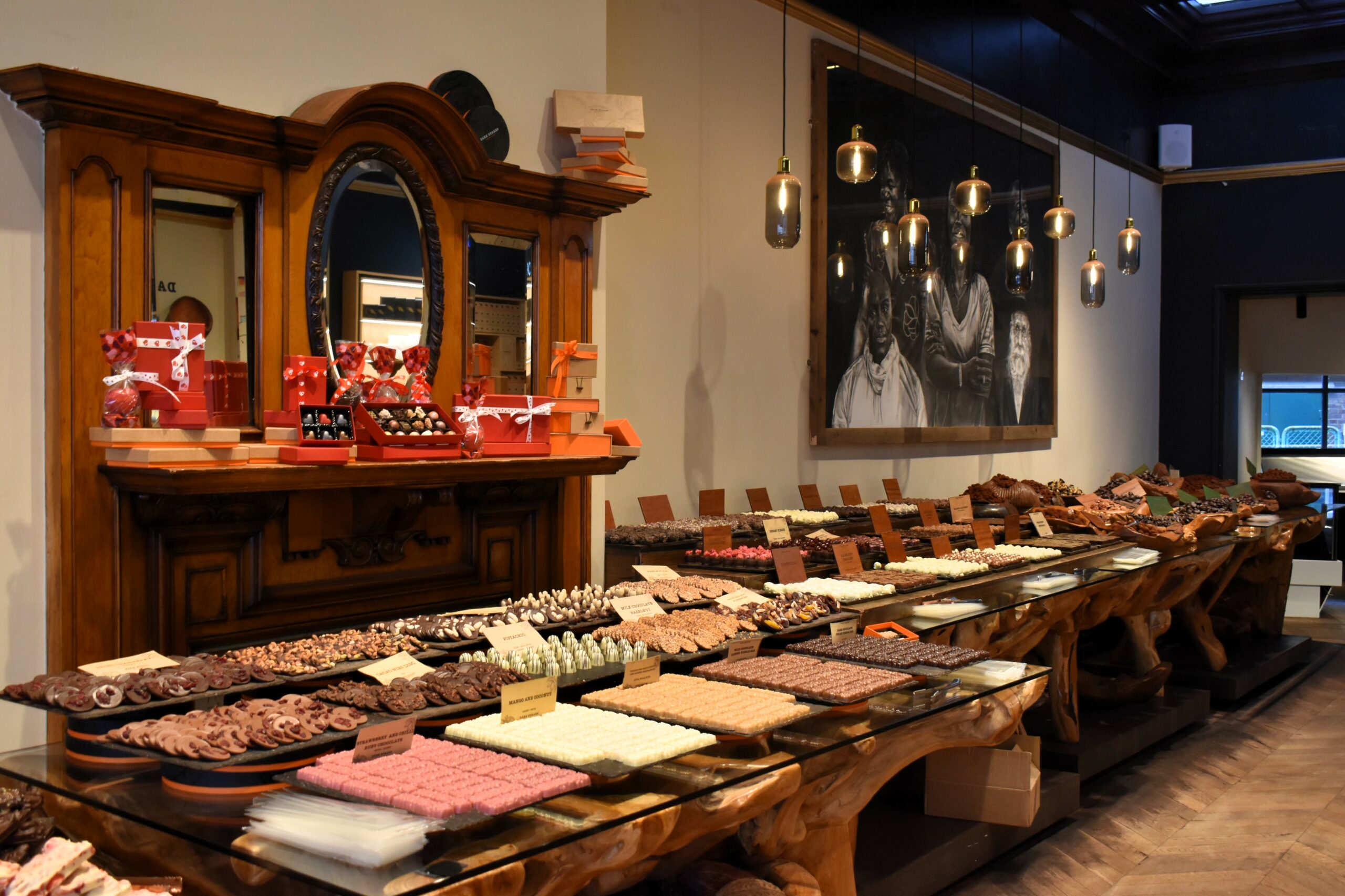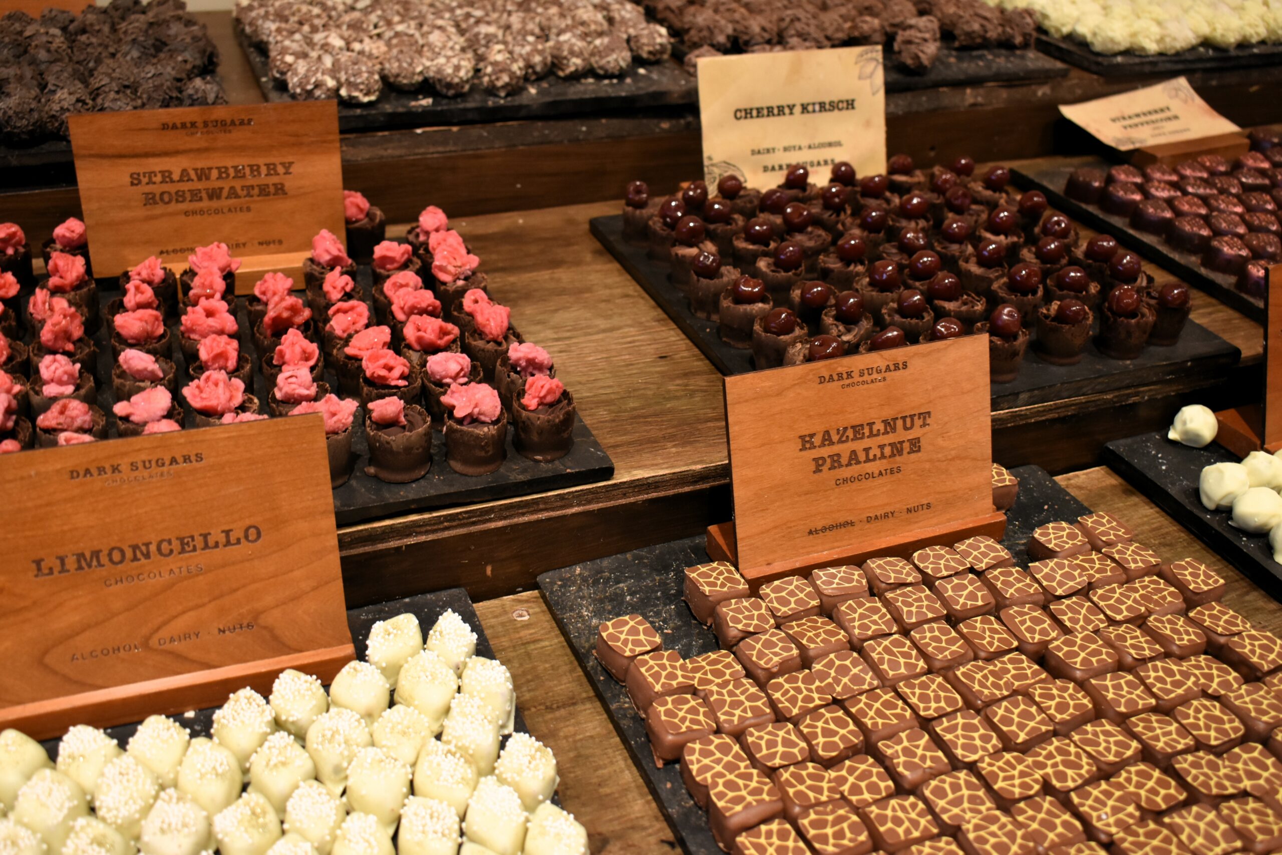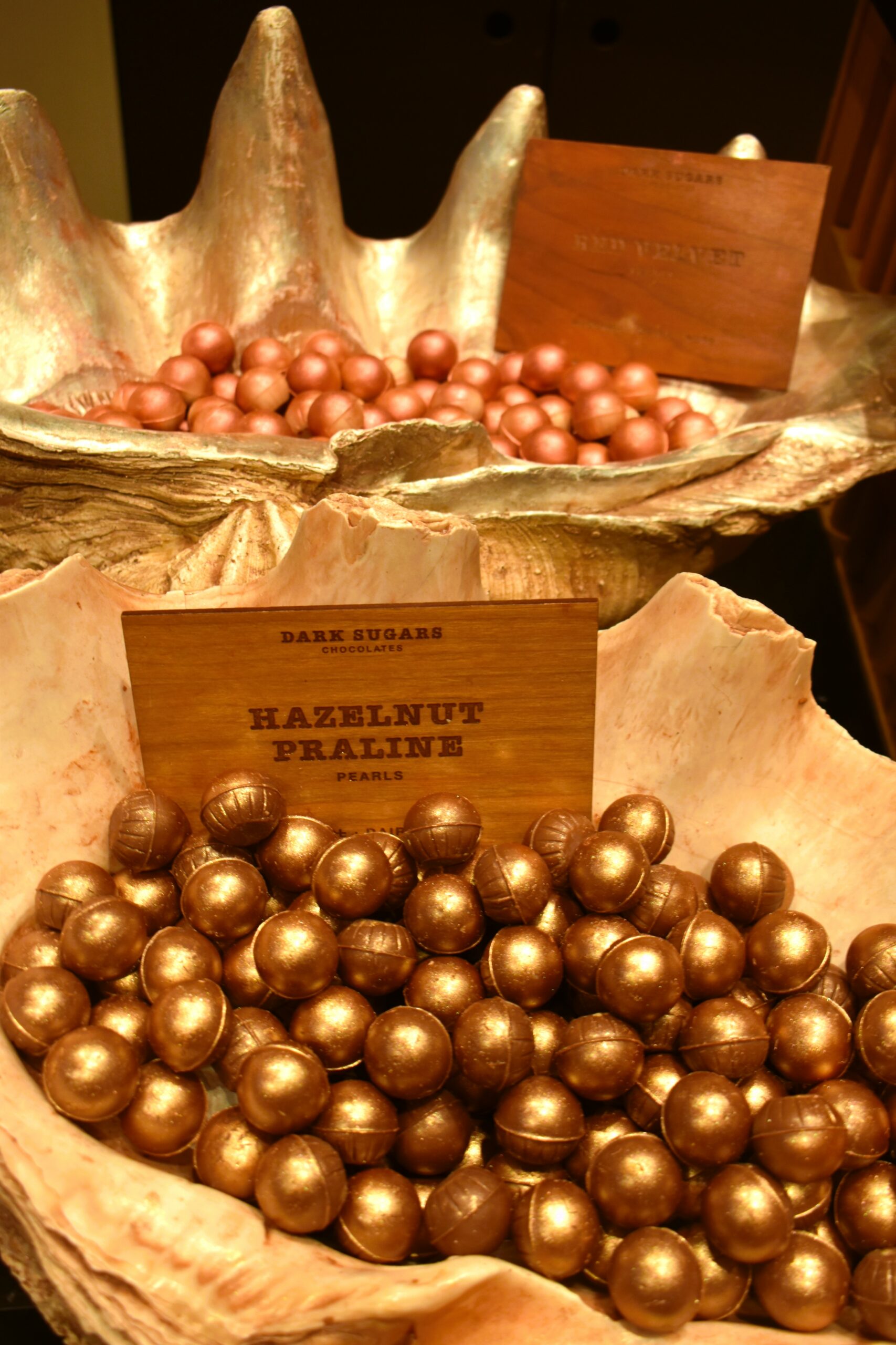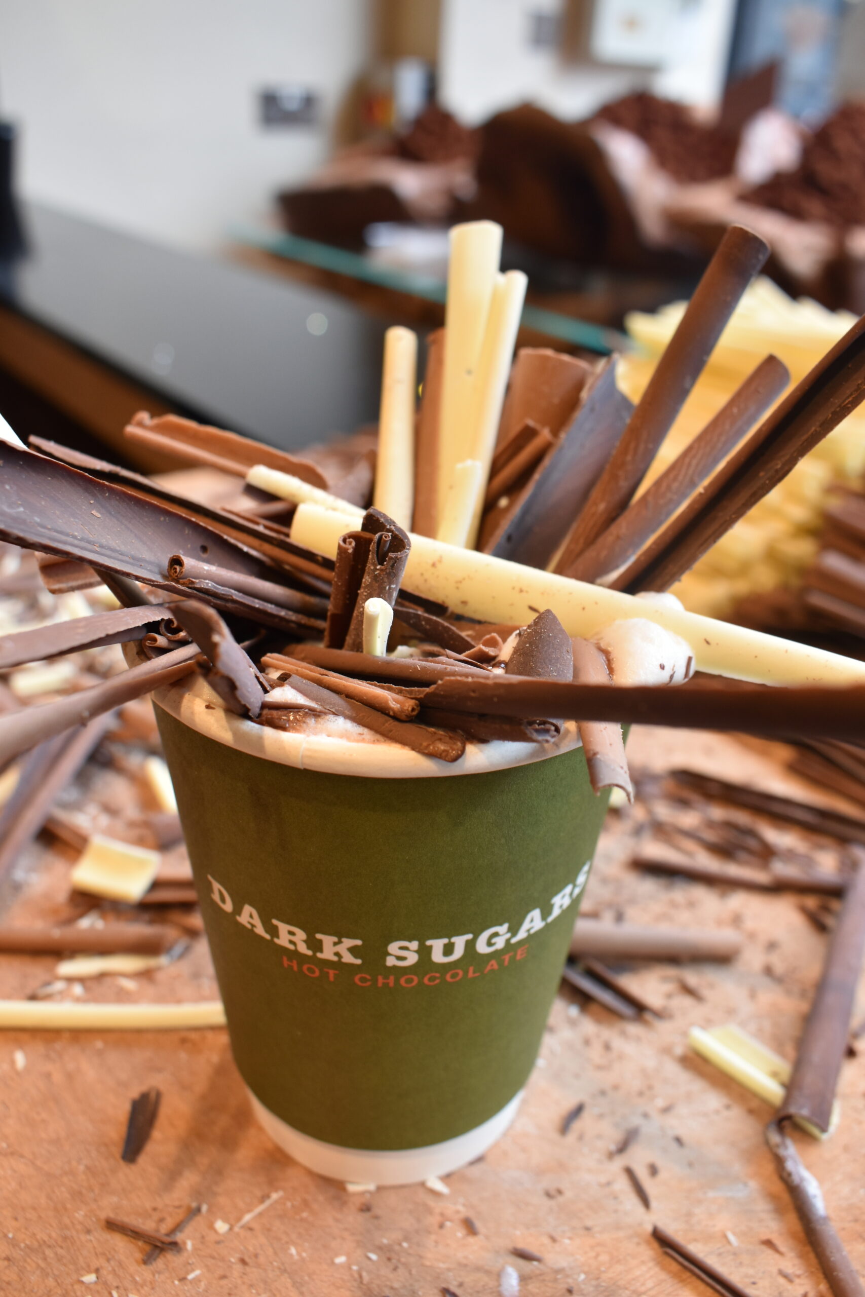 Είτε στο ίδιο αυτό κατάστημα, είτε στη νέα τετραώροφη ναυαρχίδα στο Greenwich, πλησιάζοντας το Dark Sugars το μεθυστικό άρωμα των κόκκων κακάο που καβουρδίζονται σε ξεμυαλίζει, κάνοντας υποχρεωτική τη στάση σε αυτόν τον σοκολατένιο παράδεισο. Επιλέξτε μερικά από τα εξαιρετικά σοκολατάκια που μοιάζουν με σατινέ μεγάλες πέρλες και παρουσιάζονται μέσα σε αληθινά τεράστια όστρακα ή χειροποίητα ξύλινα αφρικανικά μπολ, κι έπειτα κατευθυνθείτε στον πάγκο για να παραγγείλετε ένα ζεστό σοκολατένιο ρόφημα. Η παρασκευή του είναι ένα θέαμα από μόνη της: καταρχήν τρίμματα γνήσιας σοκολάτας λειώνουν σε λίγο βραστό νερό σχηματίζοντας μια πλούσια πάστα, αυτή αραιώνεται με ζεστό γάλα και με έντονο ανακάτεμα σχηματίζεται ένα αφράτο μείγμα που συμπληρώνεται με επιπλέον γάλα. Στο δεύτερο στάδιο, μεγάλα κομμάτια σοκολάτας -γάλακτος, κουβερτούρας και λευκής- τεμαχίζονται με επιδεξιότητα και ταχύτητα μπροστά σας και τα μεγάλα ξύσματα μπαίνουν πάνω στο ποτήρι σας. Καθώς λιώνουν και πέφτουν μέσα στη ζεστή σοκολάτα, αυτή γίνεται ακόμη πιο πλούσια κι αποκτά εντονότερη επίγευση.
