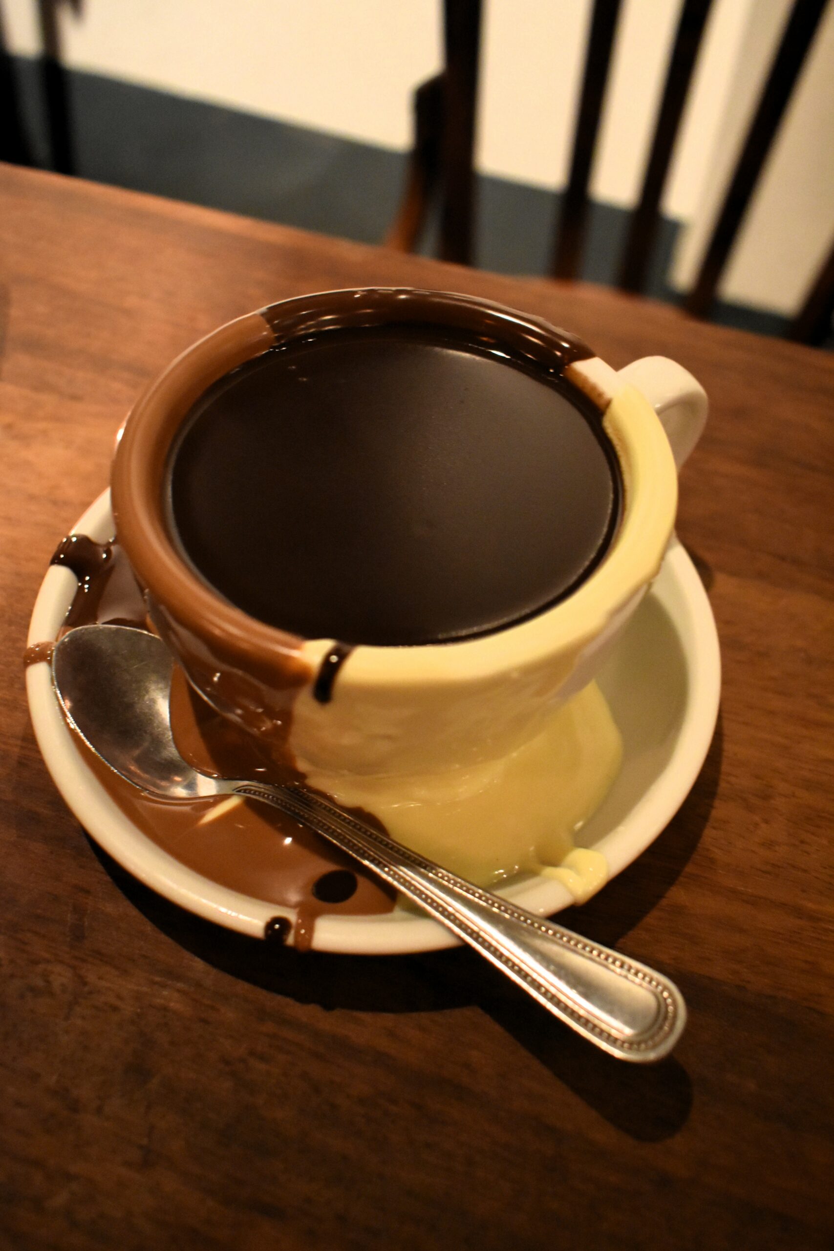 Ξεκινώντας από τα βασικά, καταρχήν επιλέγετε μεταξύ σοκολάτας γάλακτος, σκούρας ή της αγαπημένης ιταλικής γεύσης gianduja, κατόπιν ένα από τα τρία μεγέθη και σαν τελική πινελιά μπορείτε να προσθέσετε τζίντζερ, κανέλα, κάρδαμο, τσίλι ή μαύρο πιπέρι. Κι εδώ να μείνετε, είναι βέβαιο ότι θα ευχαριστηθείτε ένα πηχτό, πλούσιο ρόφημα από πραγματική σοκολάτα, που όσο μένει στερεοποιείται. Αν όμως θέλετε να δοκιμάσετε τη signature, viral εκδοχή που δικαίως κάνει θραύση στο TikTok, ζητήστε την «Triple Chocolate» εμπειρία, ανεξαρτήτως γεύσης και μεγέθους. Όταν φτάσει στο τραπέζι σας πιθανόν να νομίζετε ότι ο σερβιτόρος έχυσε τη σοκολάτα σας, αλλά στην πραγματικότητα ολόκληρο το φλιτζάνι καλύπτεται προηγουμένως πλουσιοπάροχα μέσα αλλά και έξω με λευκή, σκούρα και σοκολάτα γάλακτος. Το πώς θα πιάσετε την κούπα σας είναι δύσκολο να απαντηθεί, το σίγουρο είναι ότι και εδώ θα λερωθείτε, αλλά έτσι γίνεται με τη σοκολάτα: χάνεσαι στη μαγική της γεύση χωρίς να σε απασχολεί οτιδήποτε άλλο.