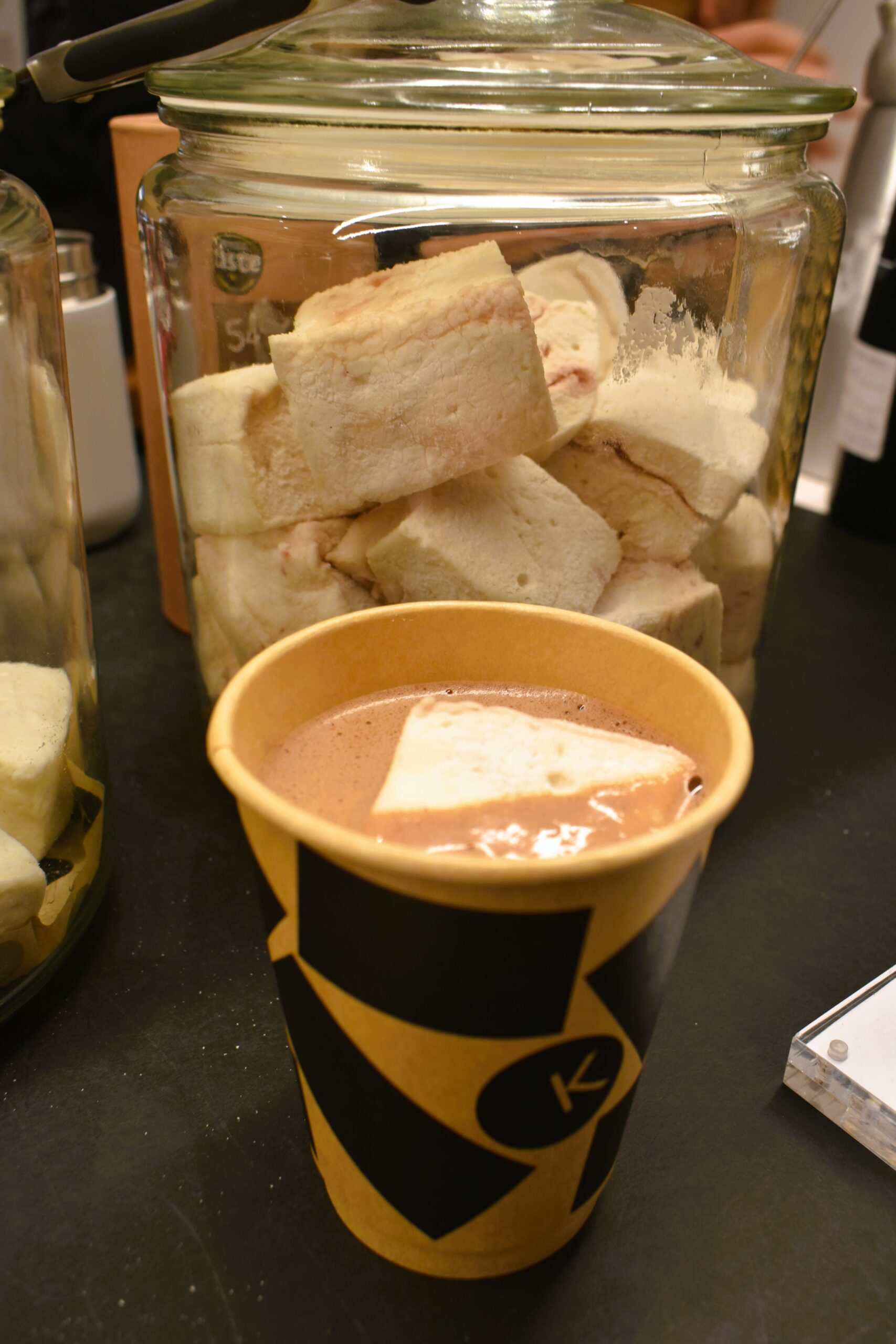 Εξηγούμε: μεταλλιζέ γυαλιστερό ποτήρι γεμίζεται με αχνιστή σοκολάτα –υπάρχει και vegan επιλογή- κι από πάνω μπαίνει μια γενναιόδωρη δόση μαστιχωτού marsmallow, σχηματίζοντας μια μπάλα που ξεχύνεται από το ποτήρι. Η συνέχεια ανήκει στο φλόγιστρο, με γρήγορες κινήσεις το marshmallow καψαλίζεται, παραμένοντας αφράτο στο εσωτερικό. Με το που βυθίζετε το κουτάλι σας στη σοκολάτα, το ποτήρι ξεχειλίζει, η ζεστή σοκολάτα χύνεται στο συνοδευτικό μπολάκι και κάθε κουταλιά σας κάνει να νοιώσετε σαν παιδί που δεν το νοιάζει αν θα λερωθεί, αρκεί να χαρεί τη σοκολάτα του. Εμείς σας προειδοποιήσαμε.