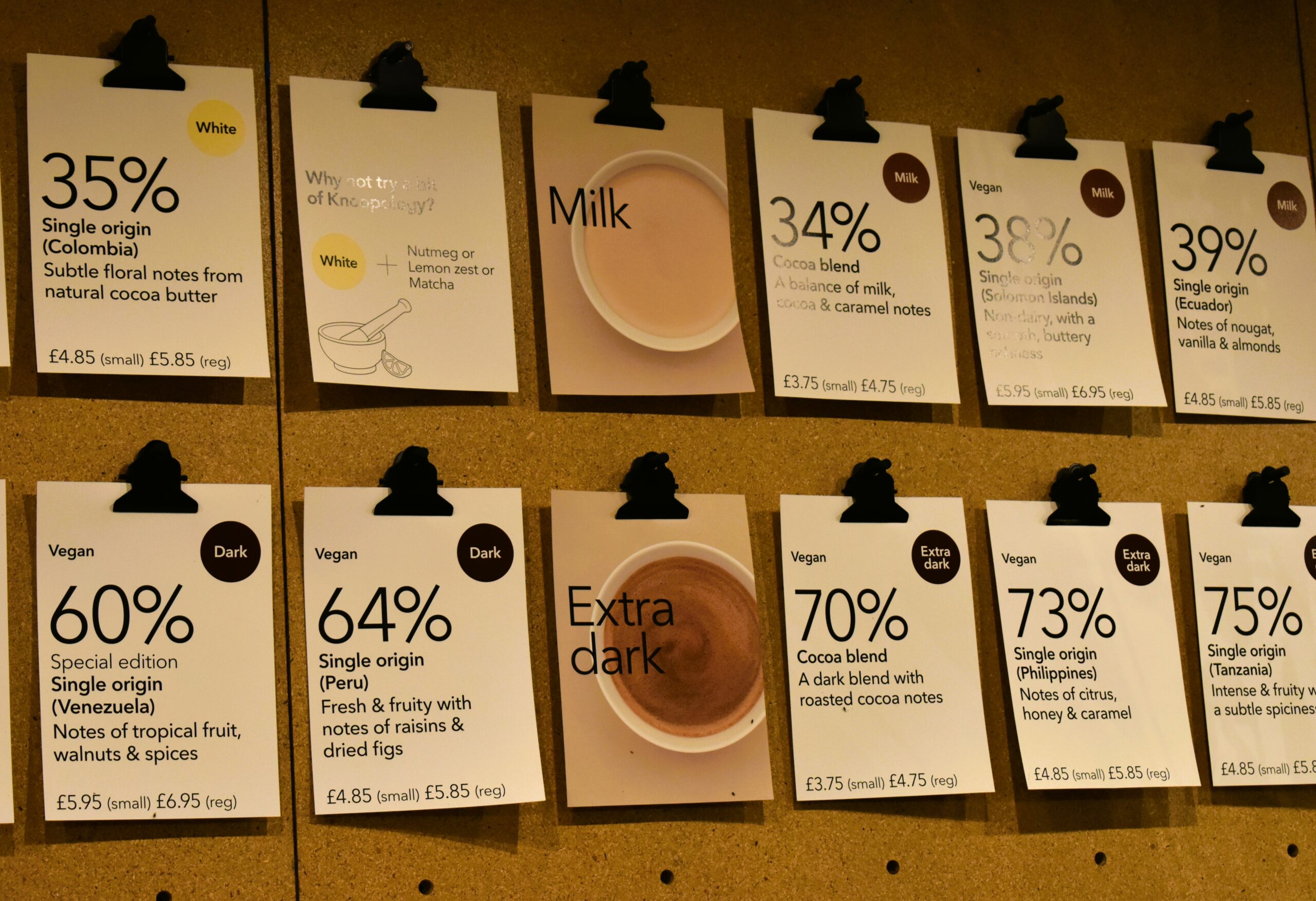 Αν οι λέξεις «εκλεκτοί κόκκοι» και «μονοποικιλιακό» σας φέρνουν στο μυαλό μόνο τον ποιοτικό καφέ, ξανασκεφτείτε το. Ο εκ Γερμανίας καταγόμενος Jens Knoop είχε σαν όνειρο να αλλάξει τα χαμηλά στάνταρ όσον αφορά τα ροφήματα σοκολάτας –σκόνη με αρκετή ζάχαρη που διαλύεται σε νερό ή γάλα- και από το 2013 που ξεκίνησε με ένα μικροσκοπικό κατάστημα στο Rye του East Sussex, τα καταφέρνει περίφημα. Στα πέντε πλέον καταστήματά του στο Λονδίνο -μας αρέσει ιδιαίτερα αυτό στο χαριτωμένο πεζόδρομο New Row στο Covent Garden-, δεν γίνεται η παραμικρή υποχώρηση όσον αφορά την ποιότητα των προσφερόμενων ποικιλιών και η καίρια ερώτηση που θα κληθείτε να απαντήσετε είναι «Τι τύπος σοκολάτας είστε;». Εννοούν φυσικά ποιο από τα 22 διαφορετικά ροφήματα σοκολάτας που διαθέτουν πιστεύετε ότι ταιριάζει στο γούστο σας, εκτός αν προτιμάτε κάποιο από τα 6 είδη κρύας σοκολάτας ή τα 6 διαφορετικά σοκολατένια milkshake.