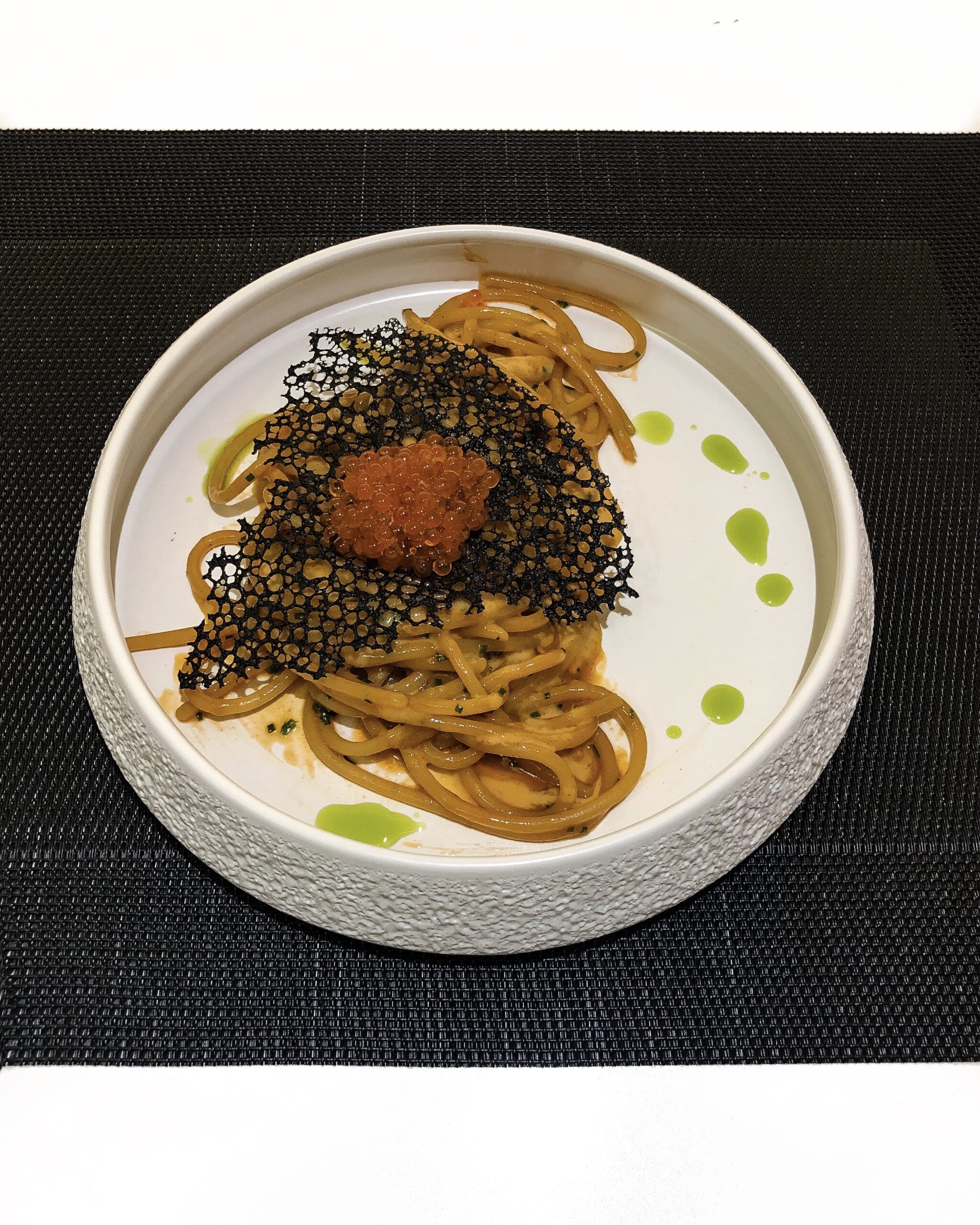 Η επιλογή γευσιγνωσίας 9 σταδίων παρέχει στους επισκέπτες τη δυνατότητα να διαλέξουν πιάτα σε ορισμένα στάδια ενώ στην “travelling” επιλογή των 11 σταδίων λαμβάνουν τη συνολική και ολοκληρωμένη γαστρονομική εμπειρία που έχουν οραματιστεί οι σεφ. Άκρως δημιουργικά τα amuse bouche, όπως η μίνι μόστρα και η μυκονιάτικη κρεμμυδόπιτα. Γεμάτο χρώματα και αρώματα το μαριναρισμένο σε παλαιωμένο ξύδι παντζάρι με κρέμα από βολάκι Άνδρου, πίκλες παντζαριού και ζωμό από περγαμόντο και πορτοκάλι. Θεσπέσιο και ευφάνταστο το onion cappelletti με γέμιση από τυροβολιά (τοπικό τυρί) και κρεμμύδι, πούδρα καμένου κρεμμυδιού και αφρό από μυρώνια και τυροβολιά. Εξαιρετικής νοστιμιάς το σιγομαγειρεμένο αρνάκι με καπνιστή μελιτζάνα, κενέλ από σάλσα καλοκαιρινών λαχανικών και μυρωδικών, κρέμα από γιαούρτι και jus αρνιού που δένει ιδανικά το πιάτο. Η επιμέλεια της εξαιρετικής λίστας κρασιών, από τον ελληνικό και το διεθνή αμπελώνα, βρίσκεται στα χέρια του περίφημου MasterofWine Γιάννη Καρακάση. Τα επιδόρπια, δια χειρός Αναστάση Λύκου υπό την επιμέλεια των ταλαντούχων pastry chef Ευγένιου Βαρδακαστάνη και Γιάννη Κίκιρα, έρχονται να κλείσουν εντυπωσιακά το γεύμα. Ανεπανάληπτης νοστιμιάς το Vibrato με σοκολάτα bitter 70%, παγωτό σουσάμι και compote φραγκοστάφυλο.
