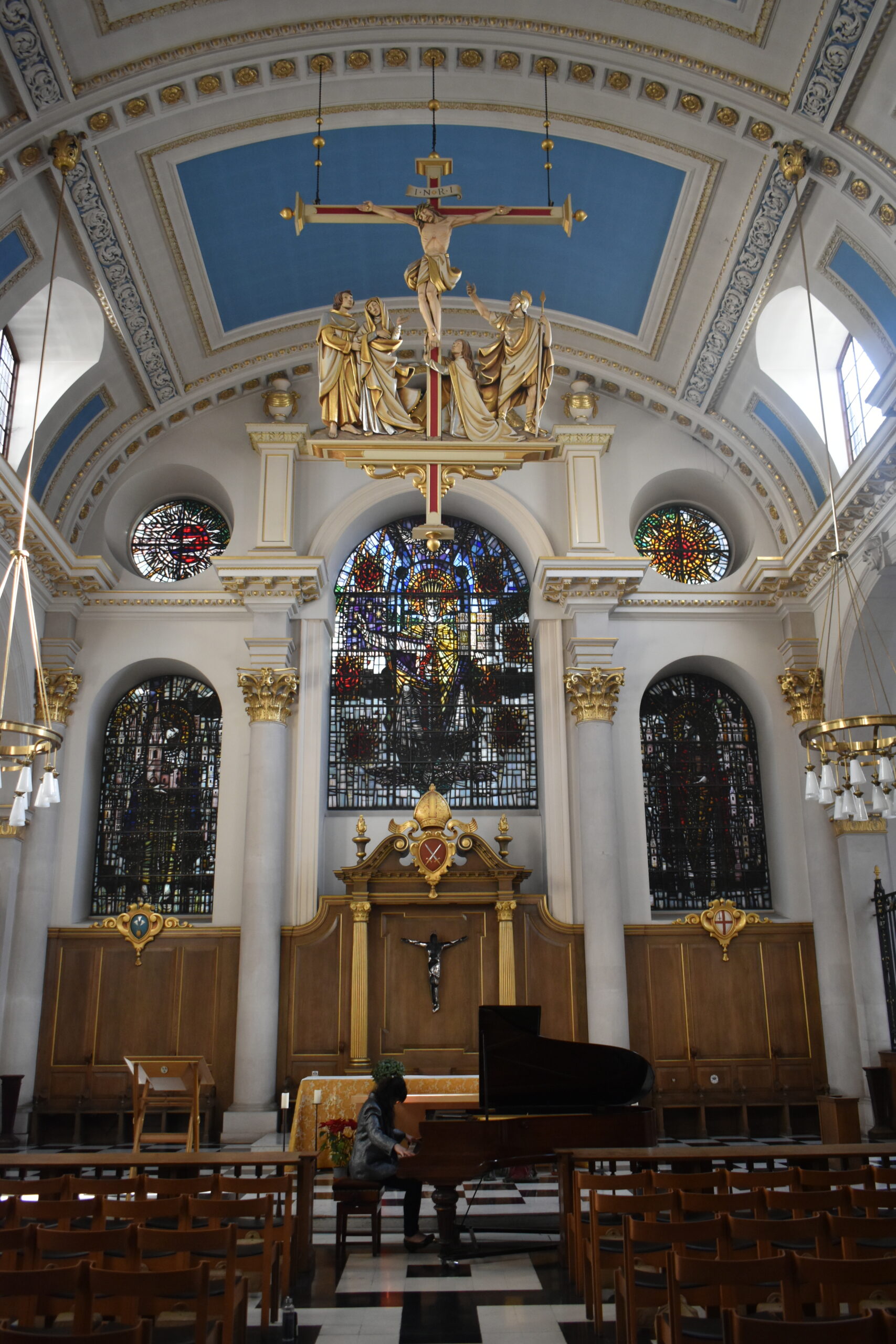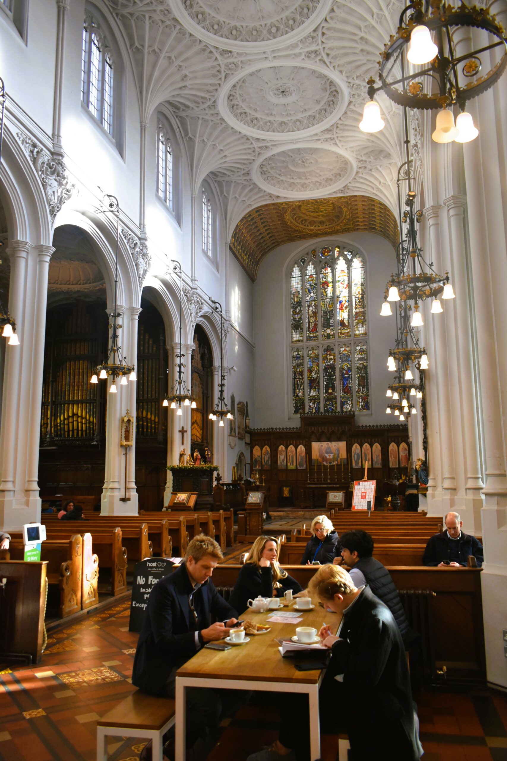 Οι βομβαρδισμοί του Β΄ Παγκοσμίου Πολέμου άφησαν πίσω τους ένα κουφάρι και ο τετράγωνος χώρος του ναού σήμερα παραμένει λιτός αλλά ζεστός χάρη στην επένδυση από ξύλο, το άπλετο φως που μπαίνει από τα μοντέρνα βιτρό των παραθύρων και τη χαλαρή ατμόσφαιρα του καφέ The Wren Coffee, που τιμά με το όνομά του το σπουδαίο αρχιτέκτονα. Οι όλων των ηλικιών θαμώνες έρχονται για να δουλέψουν με ησυχία κάτω από το μεγάλο βασιλικό θυρεό, να ξεφυλλίσουν κάποιο από τα διαθέσιμα βιβλία ή απλά να απολαύσουν τις εκλεκτές ποικιλίες καφέ της Caravan Coffee από baristas που εκπαιδεύονται στα καφεκοπτεία της εταιρίας. Εκτός από τον καφέ, συσκευασίες του οποίου μπορείτε και να αγοράσετε, σερβίρεται αρωματικό ινδικό τσάι και ολόφρεσκα κρουασάν, κέικ ή μπισκότα για ένα χορταστικό διάλειμμα. Οι λιγοστές αλλά νόστιμες επιλογές του μεσημεριανού μενού -σάντουιτς, wraps, bagels και σαλάτες- κάνουν το χώρο να γεμίζει από καλοντυμένους υπαλλήλους των γύρω γραφείων, που συνδυάζουν χαλαρά meetings με ελαφρύ γεύμα.