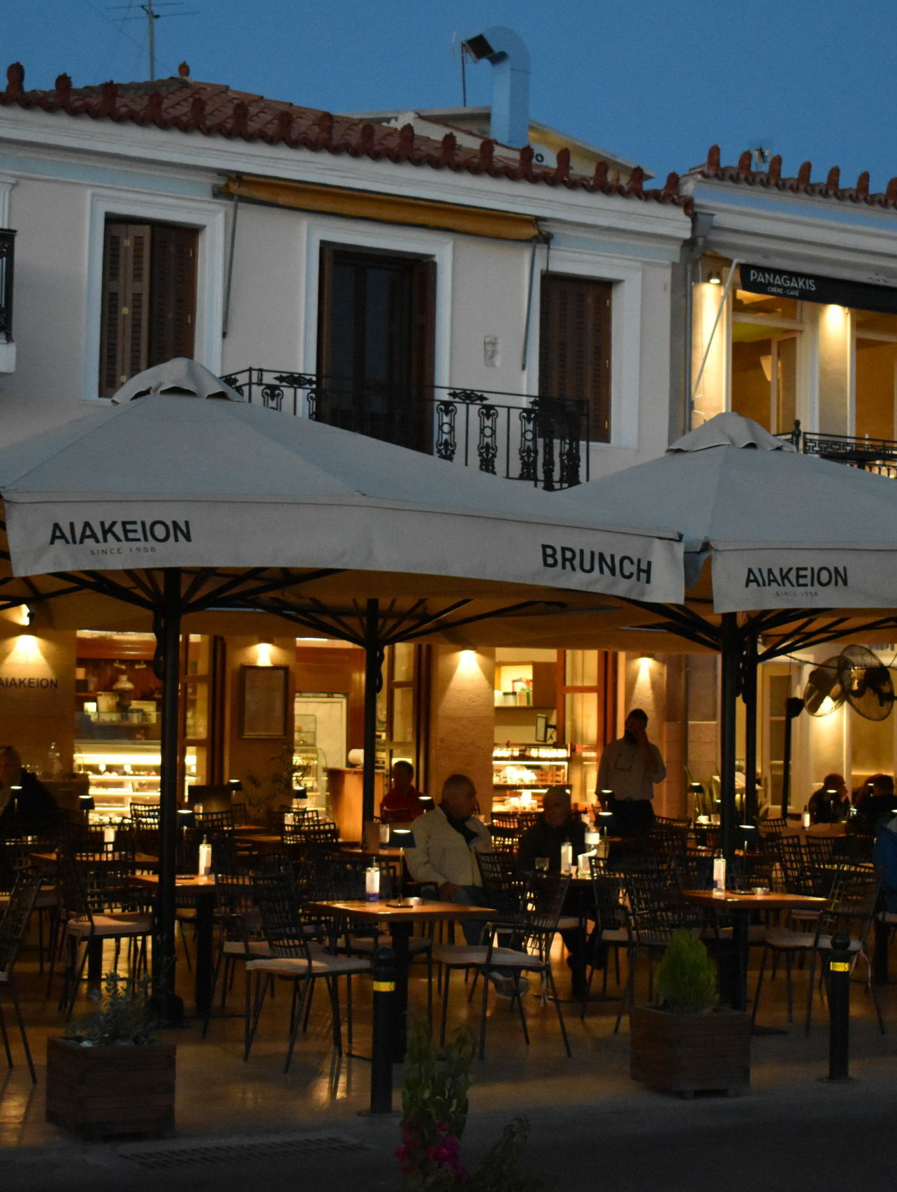 -Λίγο παρακάτω, δύο ακόμη σχεδόν δίδυμα καφενεία ξεχωρίζουν με τη ζωντάνια και τις ζωηρές αποχρώσεις τους: κατακόκκινο το καφενείο της Αναστασίας Γάλαρη, σε έντονο πράσινο αυτό του Κώστα Μοίρα. Χωρίς ίχνος αντιπαλότητας μεταξύ τους, στέκουν δίπλα το ένα στο άλλο, λειτουργώντας αδιαλείπτως εδώ και σχεδόν 60 χρόνια, κάτω από το σκαλιστό μπαλκόνι ενός ακόμη ιστορικού κτηρίου που στέγαζε το Δημαρχείο της Αίγινας.