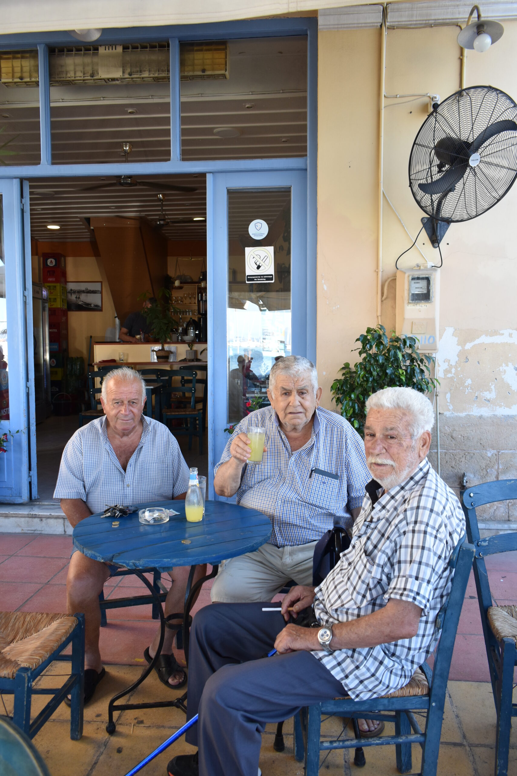 Ούτε ένα ούτε δύο, αλλά τρία είναι τα καλοφροντισμένα καφενεία που θα βρείτε κάνοντας τη βόλτα σας κατά μήκος του λιμανιού και μάλιστα σε ένα από τα πιο γραφικά σημεία του, μπροστά από τους υπαίθριους πάγκους μαναβικής με την ολόφρεσκη πραμάτεια. Ανοιχτά από νωρίς το πρωί, οπότε και γεμίζουν σταδιακά με τους γηραιότερους του νησιού που περνούν για ένα καφέ μετά τα ψώνια στη διπλανή ψαραγορά, ως το βράδυ που παραδίδονται στην κεφάτη νεολαία για ουζάκι ή τσίπουρο και δυο-τρεις τυπικούς μεζέδες, σφύζουν από ζωή αποτελώντας αγαπημένα στέκια, απλά κι ανεπιτήδευτα, με ιστορία που πηγαίνει δεκαετίες πριν. Τα δε διακριτά χρώματα στα οποία είναι βαμμένο το καθένα, τα κάνουν να ξεχωρίζουν με το δικό τους πρωτότυπο τρόπο.