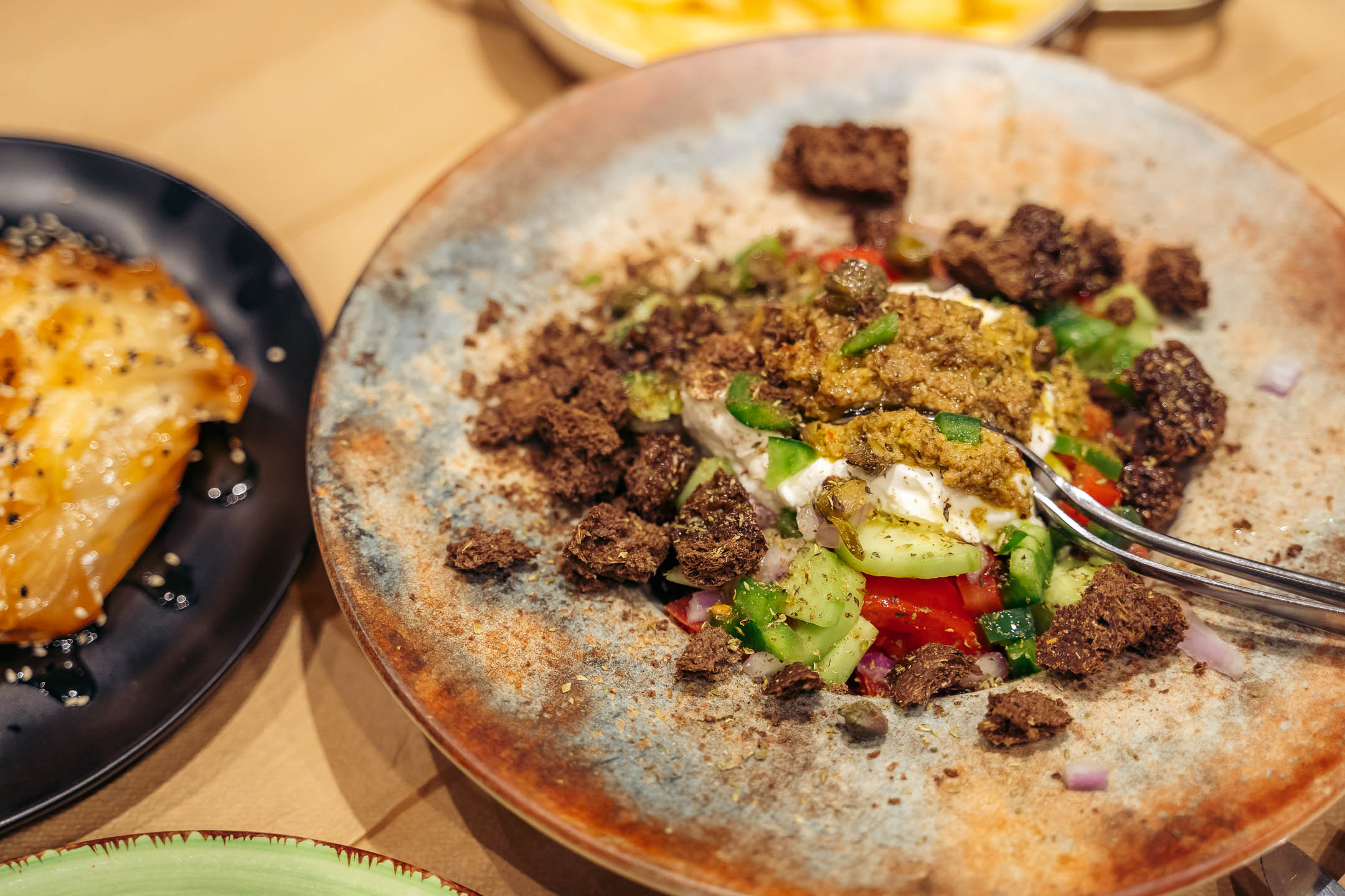 Δοκιμάσαμε αυτή τη σαλάτα, αφού την ανακατέψαμε πολύ καλά: έχει μεστή, γεμάτη γεύση, πλούσια τυρένια υφή και την αναδεικνύει τόσο η νοστιμιά του παξιμαδιού, όσο και το εξαιρετικό παρθένο ελαιόλαδο. Το μελοτύρι που ακολούθησε, η πίτα με τα άγρια χόρτα –περιέχει 4 είδη χόρτων, για την ακρίβεια– αλλά και τα νόστιμα κρεατικά, δημιούργησαν ένα ολοκληρωμένο γεύμα.
