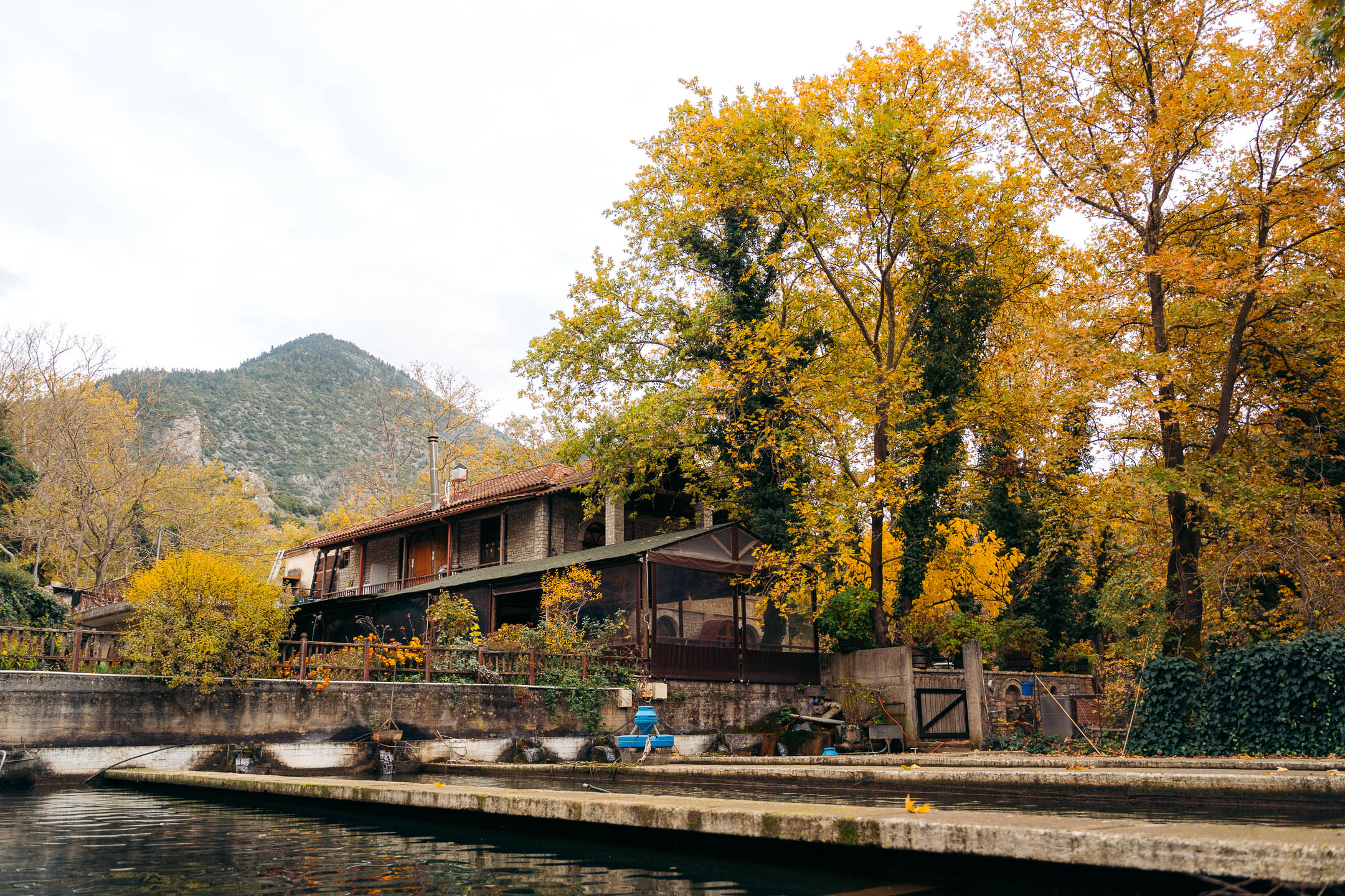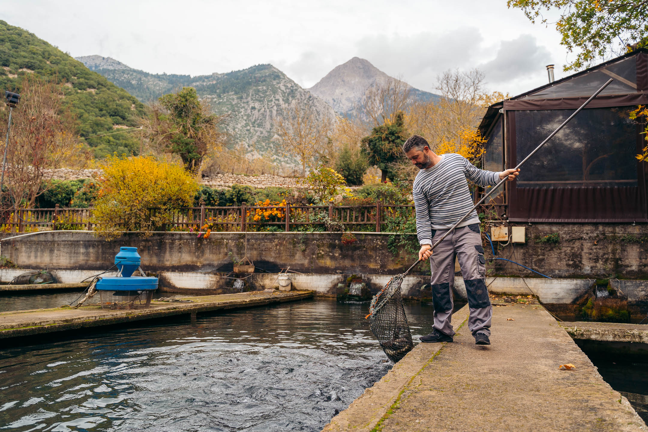 Το εστιατόριο αποτελεί σημείο συνάντησης των επισκεπτών της περιοχής και βρίσκεται σε ένα πανέμορφο σημείο με πλατάνια, δίπλα στα νερά του ποταμού Αροάνιου. Συναντήσαμε εκεί τον Γιώργο και πήγαμε μία βόλτα στο ιχθυοτροφείο. Μας έδειξε τον τρόπο με τον οποίον μεγαλώνει η πέστροφα, μας εξήγησε την αναπαραγωγική της διαδικασία, ενώ μιλήσαμε και για τις δυσκολίες αυτής της δουλειάς, μα και για τις πολλές και όμορφες στιγμές της.