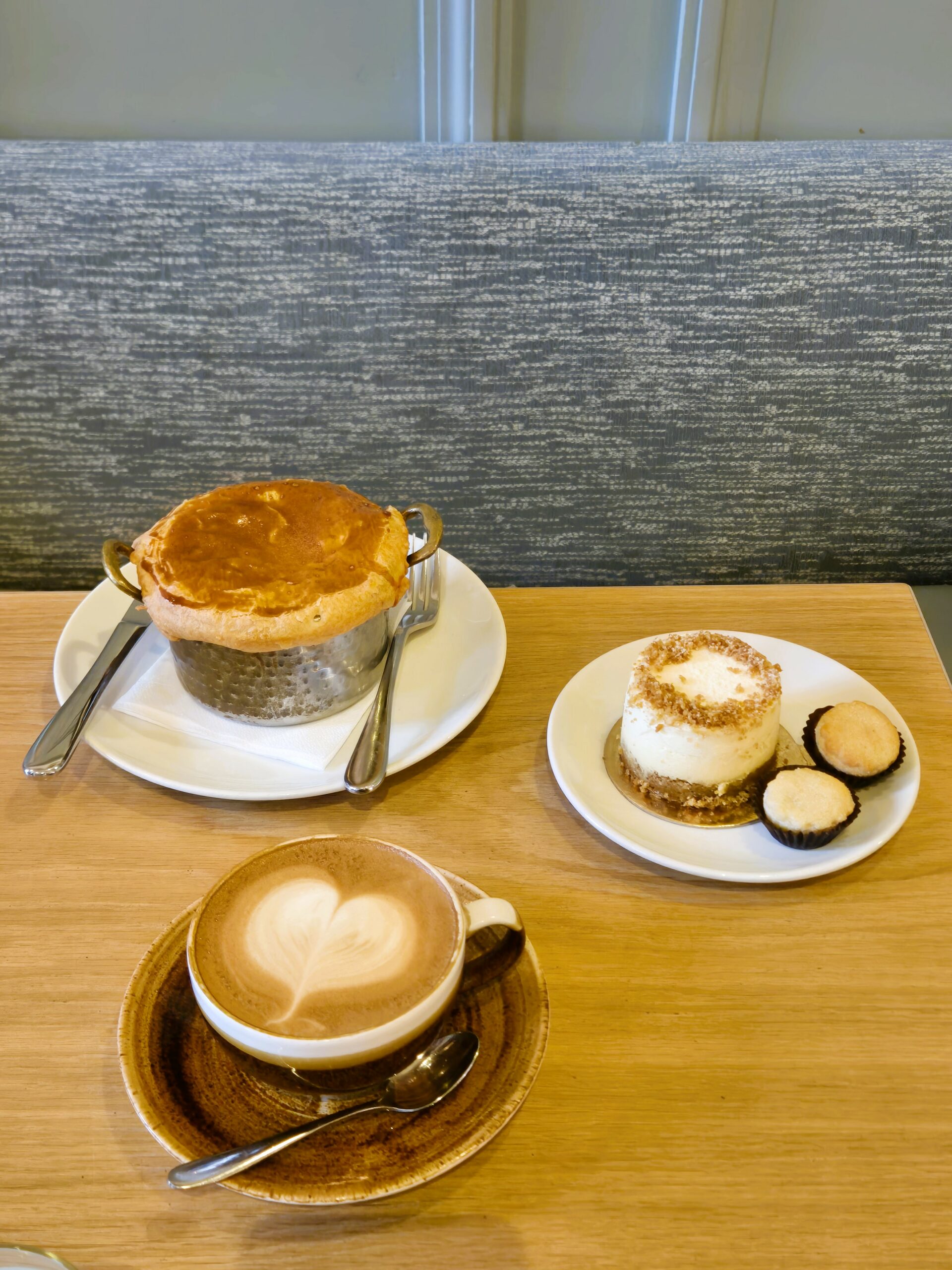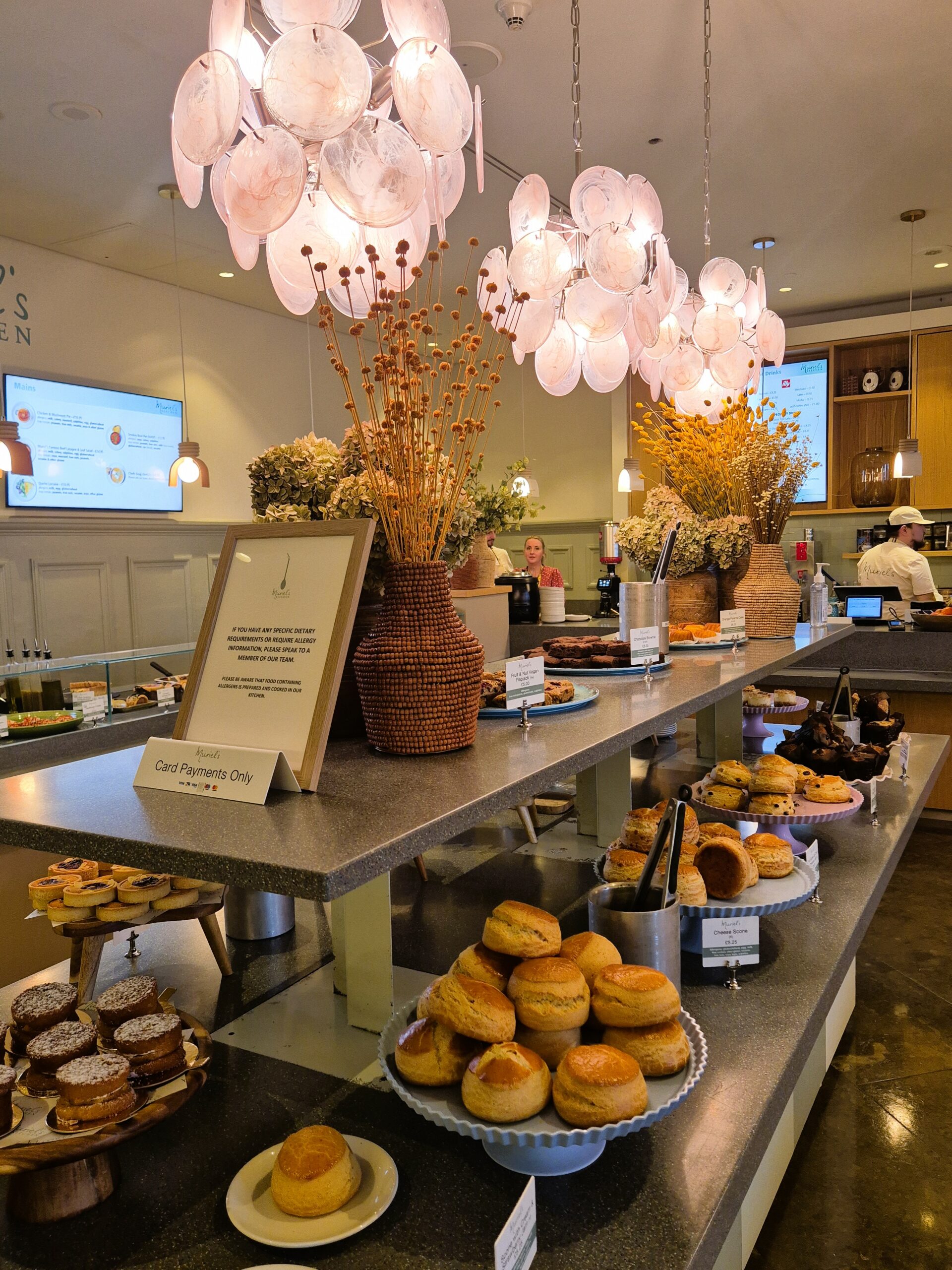 Ο χώρος φωτίζεται από τα παστέλ χρώματα και οι θαμώνες μπαίνουν σε πειρασμό από τις λιχουδιές που παρατάσσονται σε πιατέλες στο μεγάλο πάγκο που αποτελεί επίκεντρο της αίθουσας. Εδώ θα βρείτε τάρτες με πεκάν ή αρωματική κρέμα αμυγδάλου και μαρμελάδα, λαχταριστά μπισκότα σοκολάτας για να βουτήξετε στον καφέ σας, βουτυράτα scones για να συνοδεύσετε το τσάι σας, κέικ σοκολάτας, καραμέλας ή καρότου, γλυκά vegan και χωρίς γλουτένη, αφράτα κρουασάν -γλυκά και αλμυρά- για να ξεκινήσετε τη μέρα σας πριν την επίσκεψη στην πινακοθήκη. Το μεσημέρι η κίνηση βρίσκεται στο απόγειο, καθώς η κουζίνα δε σταματά να ανεφοδιάζει το café με τα περίφημα λαζάνια του Muriel’s, πίτες με πλούσια γέμιση σε ατομικά σκεύη, εποχικές σούπες, κις λορέν και σαλάτες όλο γεύση και φρεσκάδα. Θα καθίσετε σε κάποιο από τα περιμετρικά τραπέζια με τα καναπεδάκια ή στους κοινόχρηστους πάγκους, ώστε να ανταλλάξετε απόψεις με τους άλλους συνδαιτημόνες πάνω στα έργα που σας εντυπωσίασαν.