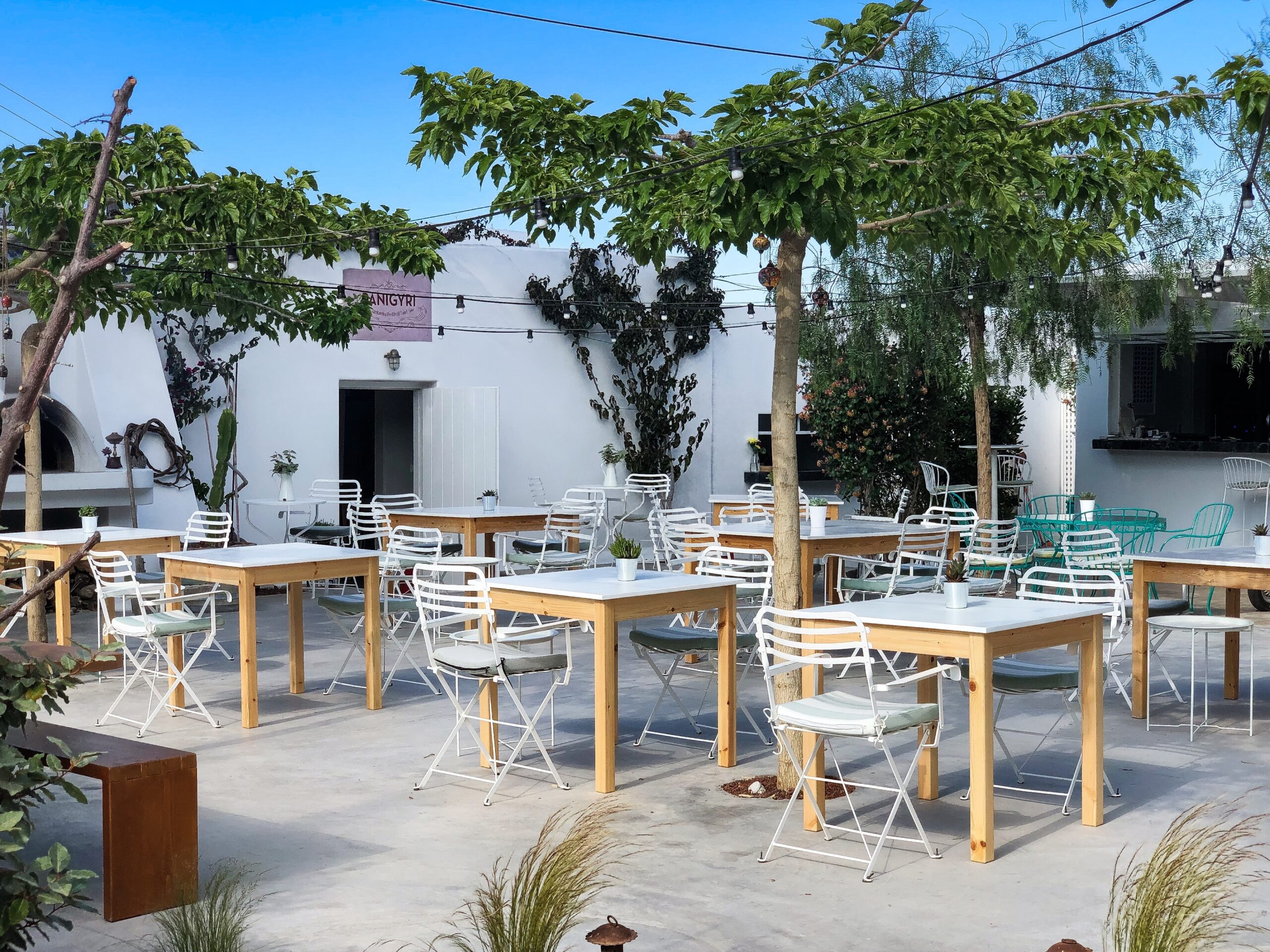 Σε μια όμορφη αυλή στα Φηρά άνοιξε, το 2019, το Panigyri festival food. Σεφ και ιδιοκτήτης ο Φάνης Μαϊκαντής, που, μαζί με την ομάδα του, προσφέρει ελληνική δημιουργική κουζίνα με έμφαση στην καλή πρώτη ύλη και τα τοπικά, εποχιακά προϊόντα. Ο χώρος, προσεγμένος και πολύχρωμος, αποπνέει ξεγνοιασιά, με τα κρεμασμένα φωτάκια, τα όμορφα φυτά και το στιλάτο τροχόσπιτο στο βάθος που εκτελεί χρέη μπαρ. Τα προϊόντα τους προέρχονται από το μποστάνι του εστιατορίου αλλά και από τοπικούς παραγωγούς καθώς και παραγωγούς από την υπόλοιπη Ελλάδα.