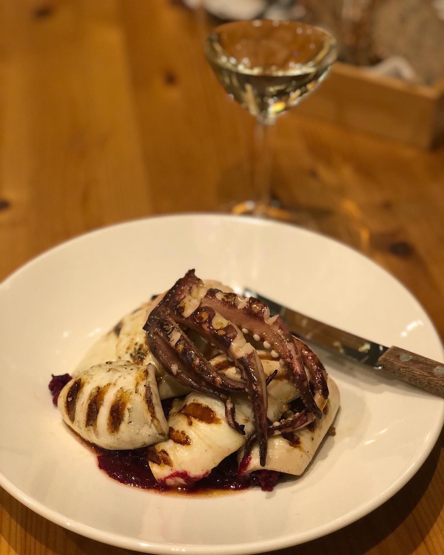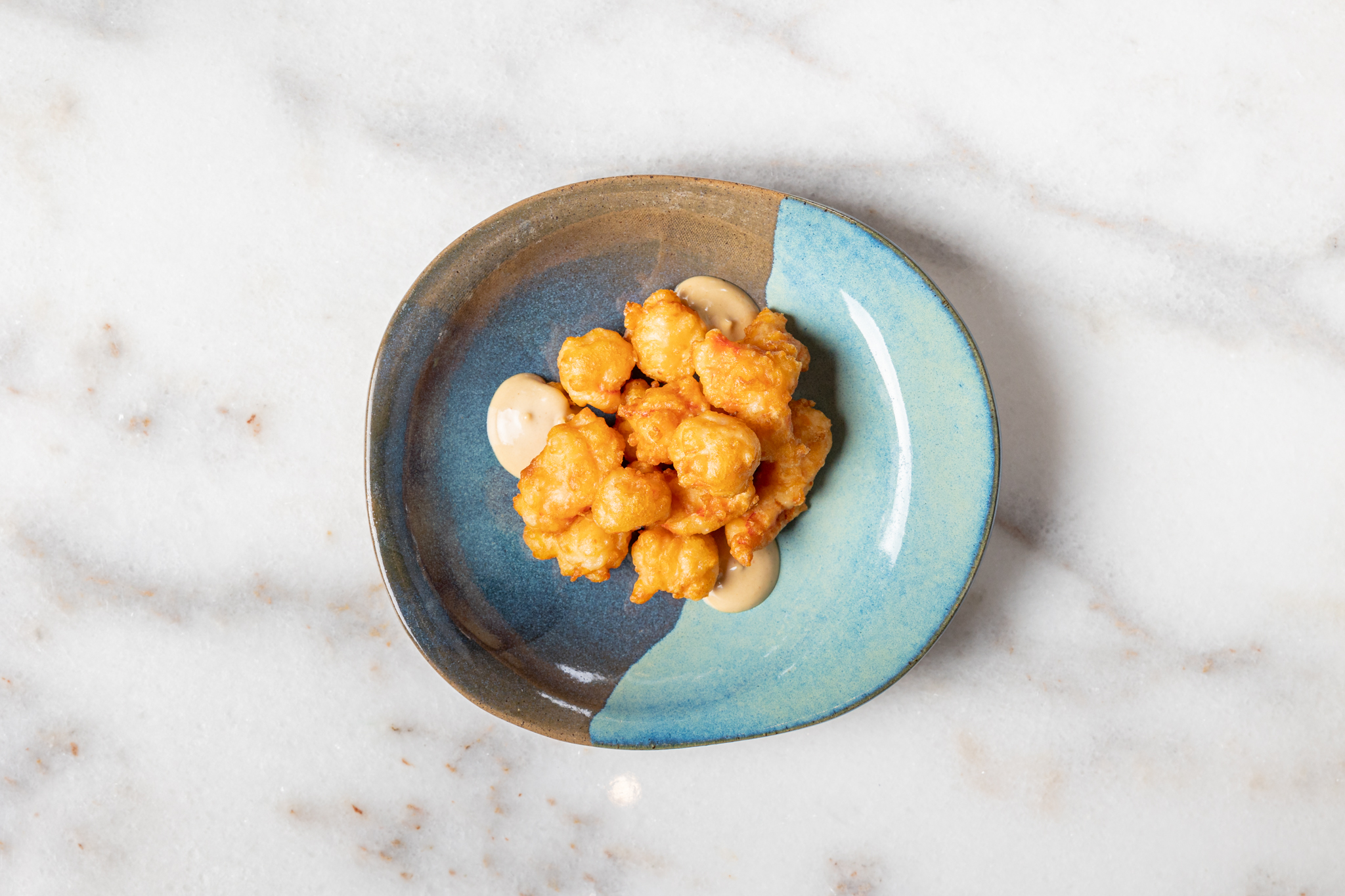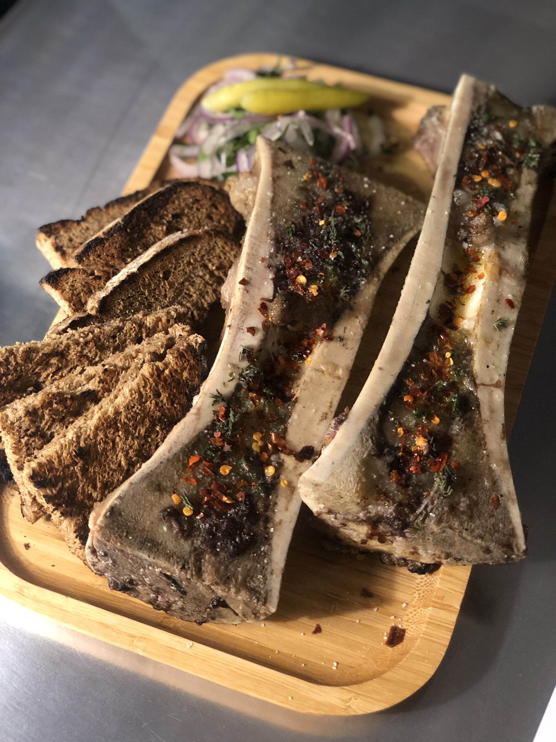 Οστό από μοσχαρίσιο πόδι ψήνεται στην σχάρα και τελειώνει στον φούρνο παίρνοντας μια ελαφριά κρούστα, πασπαλίζεται με μπούκοβο, θυμάρι και τσίλι και σερβίρεται με φρυγανιστό προζυμένιο ψωμί. Εξαίσιο και το σαλατούρι, βασισμένο σε συνταγή από την Κάλυμνο, με ξεψαχνισμένο σαλάχι, ραπανάκι, chives, φρέσκα βότανα, τσίλι, lime και δροσερή σάλτσα άνηθου. Άκρως γευστικό, επίσης, και το ελαφρά τηγανισμένο κουνουπίδι με φύλα κόλιανδρου, σουμάκ, ψιλοκομμένο τσίλι και πικάντικη μαγιονέζα. Η δε ταραμοσαλάτα αποτελεί άψογο παράδειγμα συνδυασμού παραδοσιακού-δημιουργικού – χρησιμοποιείται πούδρα αυγοτάραχου από ξιφία που, με την ελαφρώς καπνιστή γεύση του, εξισορροπεί τα όξινα και αλμυρά στοιχεία και δίνει ένα πιάτο μοναδικής νοστιμιάς.
