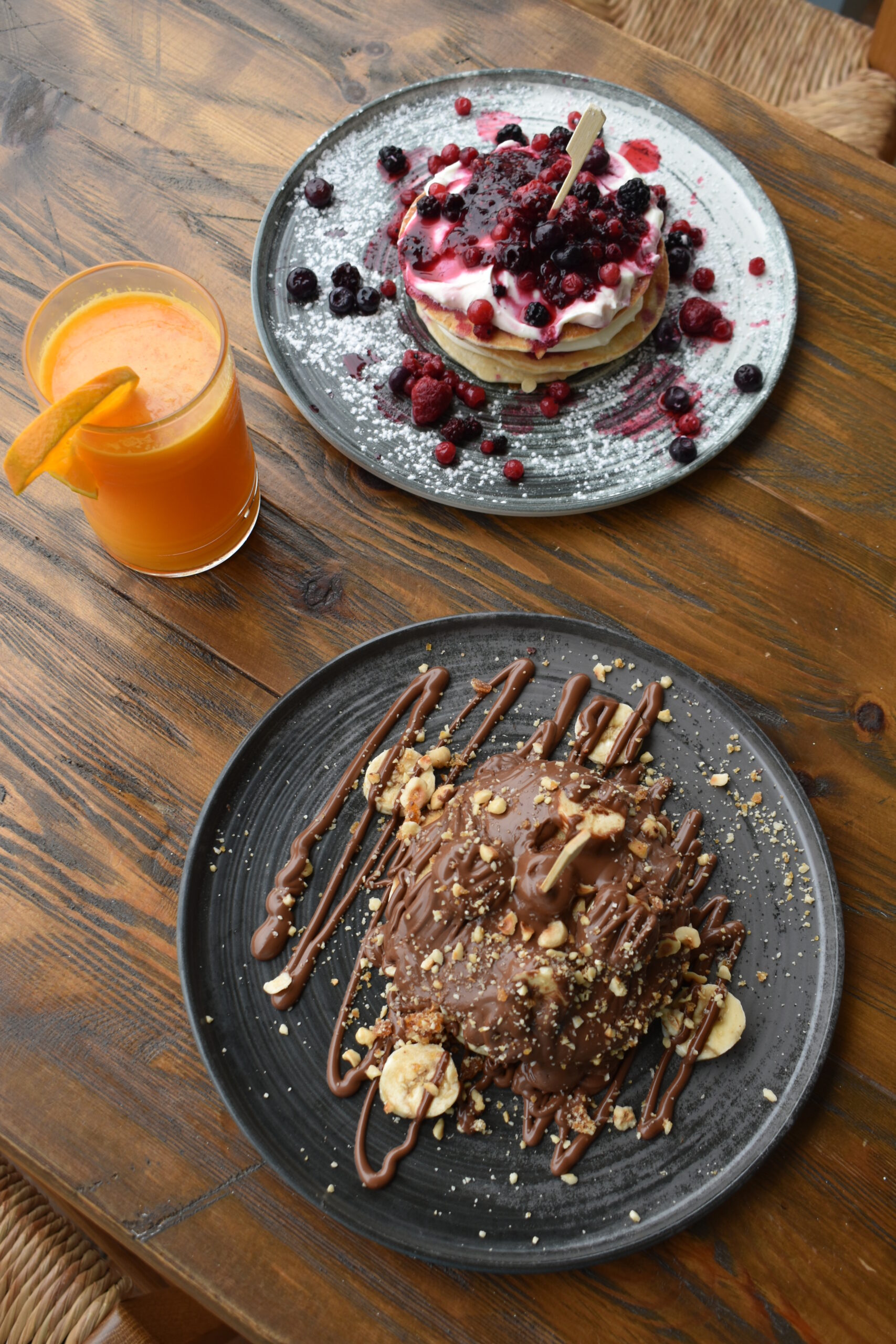 Οι προτάσεις μόνο τρεις, αλλά τόσο νόστιμες που πραγματικά θα δυσκολευτείτε να διαλέξετε, οπότε απλά αποφασίστε αν τη συγκεκριμένη μέρα έχετε διάθεση για σοκολάτα ή κρέμα, μπανάνα ή κόκκινα φρούτα. Η πραλίνα σοκολάτας που χρησιμοποιούν είναι εξαιρετικά γευστική και συνδυάζεται με μια γενναιόδωρη δόση μπανάνας και κροκάν φουντουκιού ή φρούτων του δάσους και μαρμελάδας, ενώ η ελαφριά μους λευκού τυριού ταιριάζει υπέροχα με το coulis κόκκινων φρούτων που απλώνεται πλουσιοπάροχα ανάμεσα και επάνω στα αφράτα pancakes, που με δυσκολία θα μοιραστείτε με την παρέα σας.