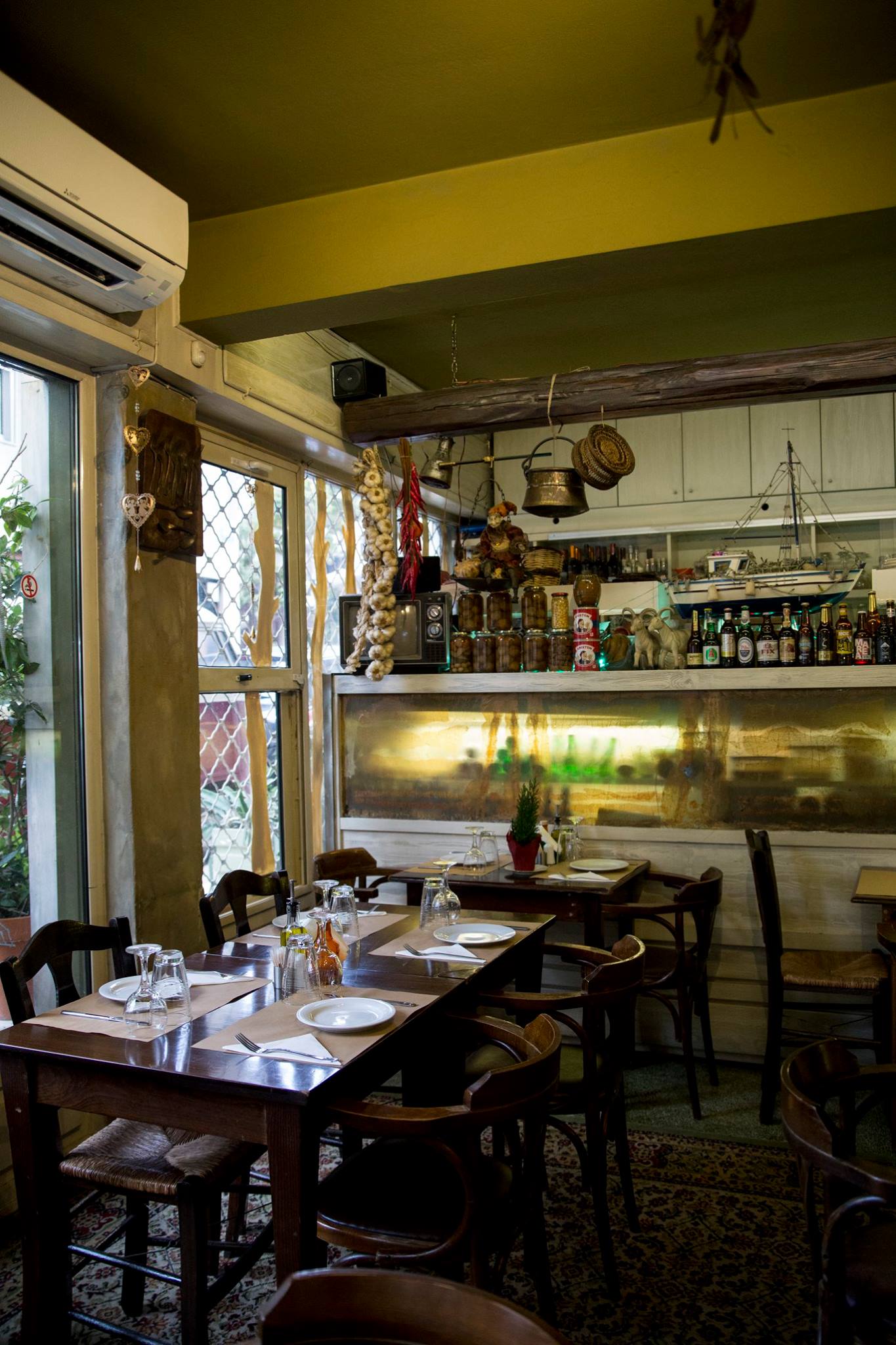 Η λίστα κρασιών, ενημερωμένη και τουλάχιστον δύο αξιόλογες επιλογές για κρασί σε ποτήρι. Η μπάρα, με τις εντυπωσιακές ανθοδέσμες χειμώνα – καλοκαίρι, είναι κατάλληλη και για ένα ωραίο βραδινό ουίσκι, αν έχετε ντέρτια. Η εμβληματική φιγούρα του Μάκη, που περιφέρεται σαν μαέστρος στο μαγαζί, συμπληρώνει την απίθανη ατμόσφαιρα και το κάνει σταθερό στέκι.
