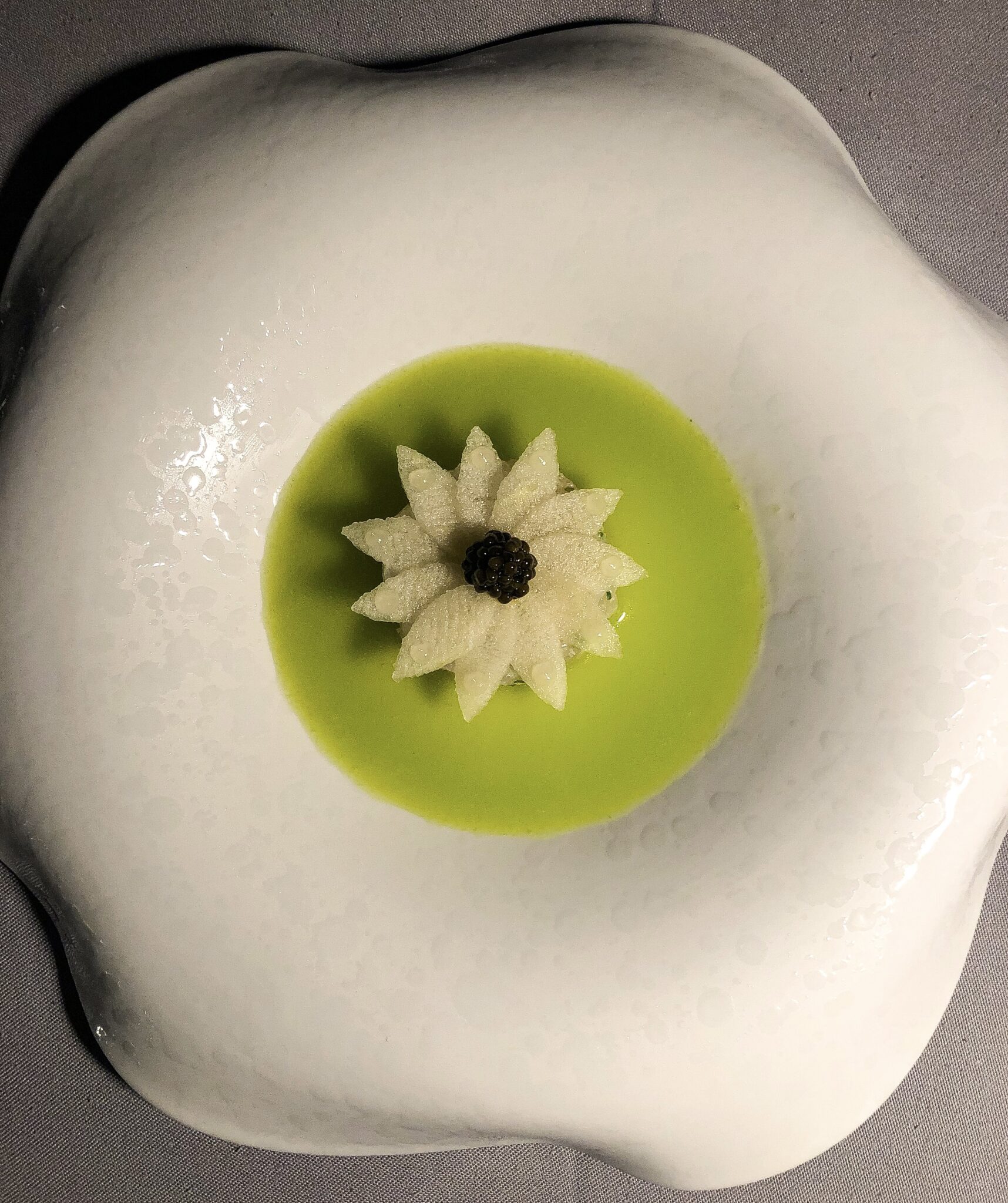 Το μενού γευσιγνωσίας, “Full Moon” 12 σταδίων και το χορτοφαγικό (harvest moon) 9 σταδίων καθώς και το a la carte, εκτελούνται με μοναδική δεξιοτεχνία από τον head chef Βασίλη Ρούσσο και την ομάδα του. Μοναδικής νοστιμιάς οι κόκκινες γαρίδες Μάνης με τις γλυκές νότες από τις υφές καρότου και τις καπνιστές της χειροποίητης πανσέτας, καθώς και το ντελικάτο μπαρμπούνι που ατμίζεται σε «νεκρή ποσειδωνία» (θαλασσινό νερό με φύκια). Ανεπανάληπτες οι λεπτοκομμένες φέτες παλαμίδας που πλέκονται μαγευτικά με κατσούνι (Σαντορινιό αγγούρι) και αέρινο ταραμά, ενώ το τριμμένο αυγοτάραχο, που απλώνεται στην κορυφή, απογειώνει το σύνολο.