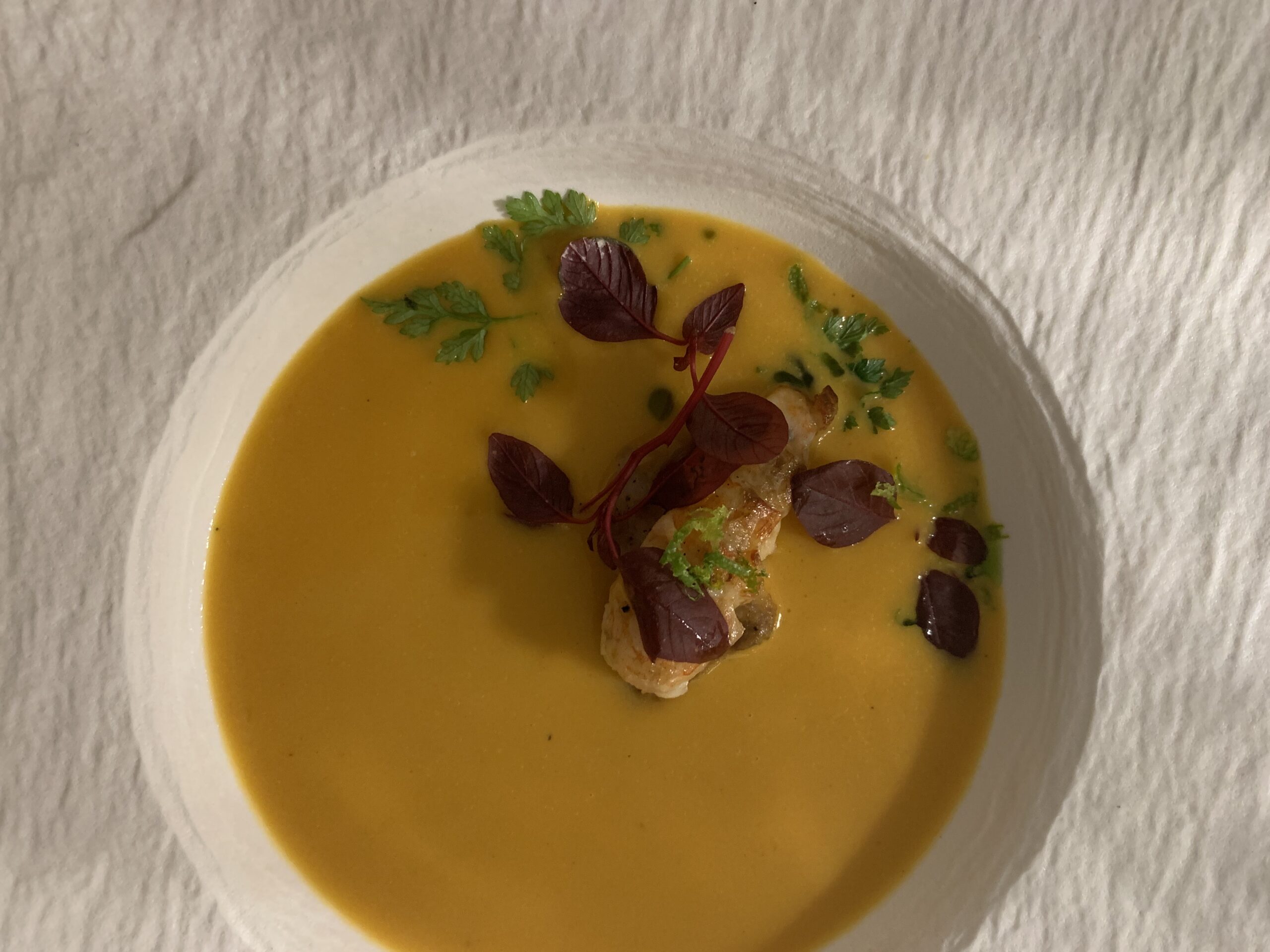 Στο πρόσφατα βραβευμένο με αστέρι Michelin εστιατόριο του Αλέξανδρου Τσιοτίνη συναντάμε μια βελουτέ σούπα καλαμποκιού. Στο CTC απολαμβάνουμε ένα μενού τυφλής γευσιγνωσίας – ένα ταξίδι στις γεύσεις της ελληνικής γαστρονομίας, όπως μας τις αφηγείται ο σεφ, με σαφέστατες όμως επιρροές από την γαλλική κουζίνα. Το “CTC Voyage” ανοίγει με τη βελουτέ καλαμπόκι, αρωματισμένη με αστακό. Τραγανά κομμάτια ψητού καλαμποκιού καθώς και ένας άκρως αρωματικός αφρός από τρούφα και περγαμόντο συμπληρώνουν αυτό το signature dish. Αν προσθέσετε και αστακό, ο οποίος ψήνεται στα κάρβουνα, τότε η σούπα αναβαθμίζεται ακόμα περισσότερο. Στο σύνολο του είναι ένα πιάτο φινετσάτο, πλούσιο σε γεύση και εντάσεις που ανοίγει θριαμβευτικά τη βραδιά.