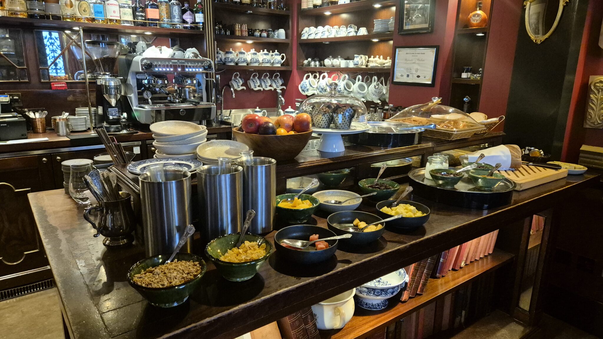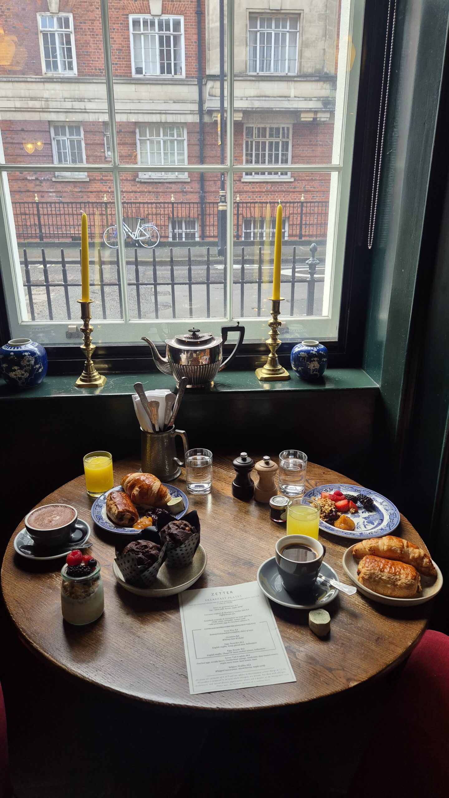 Ακόμη κι αν δεν είστε ένοικος του πολυτελούς boutique ξενοδοχείου The Zetter Townhouse, που απέχει ελάχιστα από το θρυλικό πολυκατάστημα Selfridges, μπορείτε να ξεκινήσετε τη μέρα σας στα ευφάνταστα διακοσμημένα σαλόνια οικείας κλίμακας, με πλουσιότατο πρωινό σε λογικές τιμές. Θα καθίσετε αναπαυτικά δίπλα στα παράθυρα με τις βαριές, βελούδινες κουρτίνες, στους δερμάτινους καναπέδες πλάι στις γεμάτες βιβλιοθήκες, κοντά στο τζάκι που τριζοβολά, μεταξύ έργων ζωγραφικής και ανατολίτικων χαλιών, και θα παραγγείλετε το πλήρες πρωινό προκαθορισμένης τιμής για να χορτάσετε ως το βράδυ: καφές, τσάι ή ζεστή σοκολάτα, κρουασάν και λαχταριστά σοκολατένια muffins, γαλλικό βούτυρο και μαρμελάδες, γιαούρτι, μούσλι, γκρανόλα και φρέσκα φρούτα, ψωμί με επιλεγμένα τυριά και αλλαντικά σε έναν διακριτικό μπουφέ με σερβίτσια εποχής, αλλά κι ένα επιπλέον ζεστό πιάτο για κάθε επισκέπτη, είναι όσα θα απολαύσετε διαβάζοντας τις πρωινές εφημερίδες που περιμένουν στο σαλόνι, σε μια εντελώς αληθοφανή «Old Money» εμπειρία.