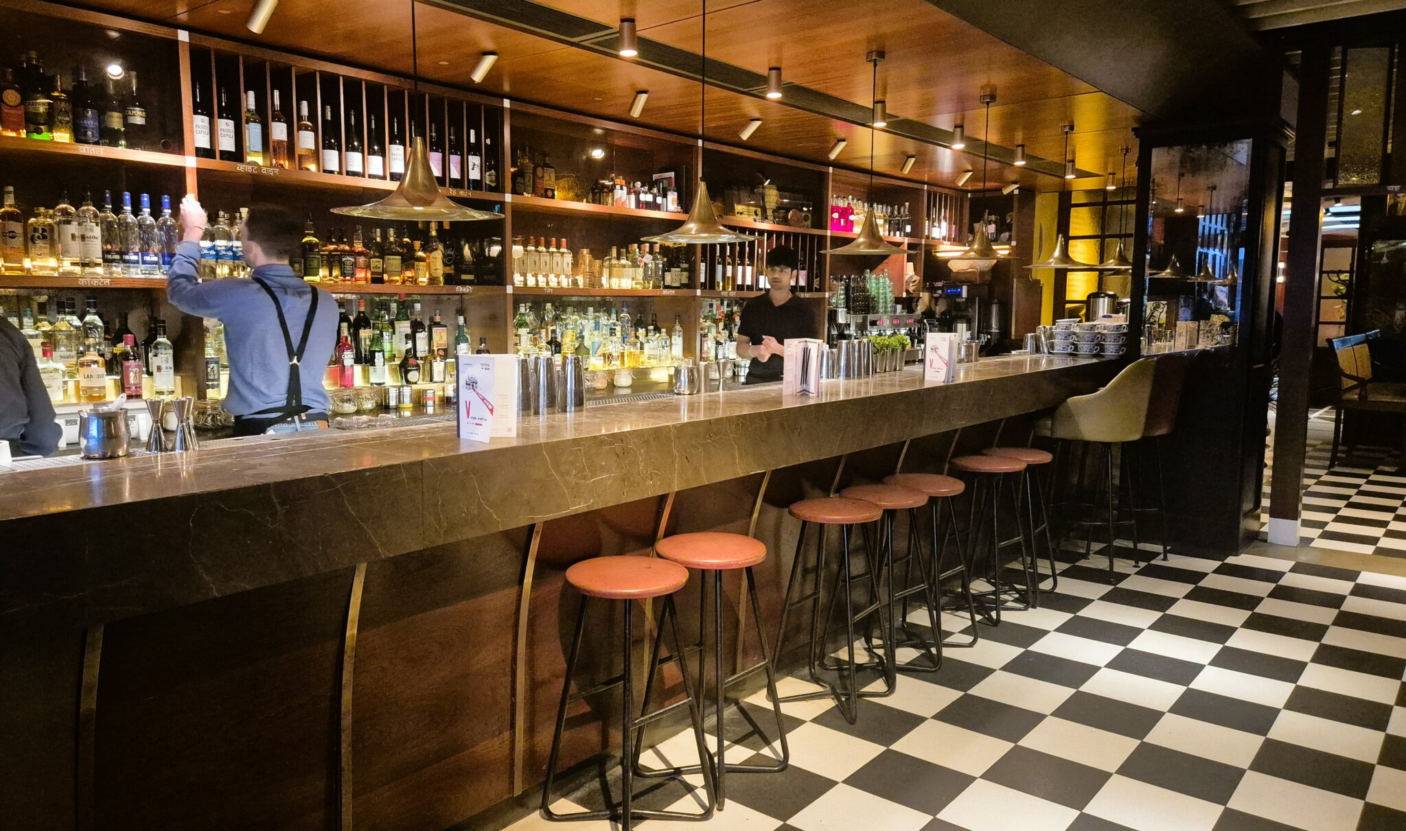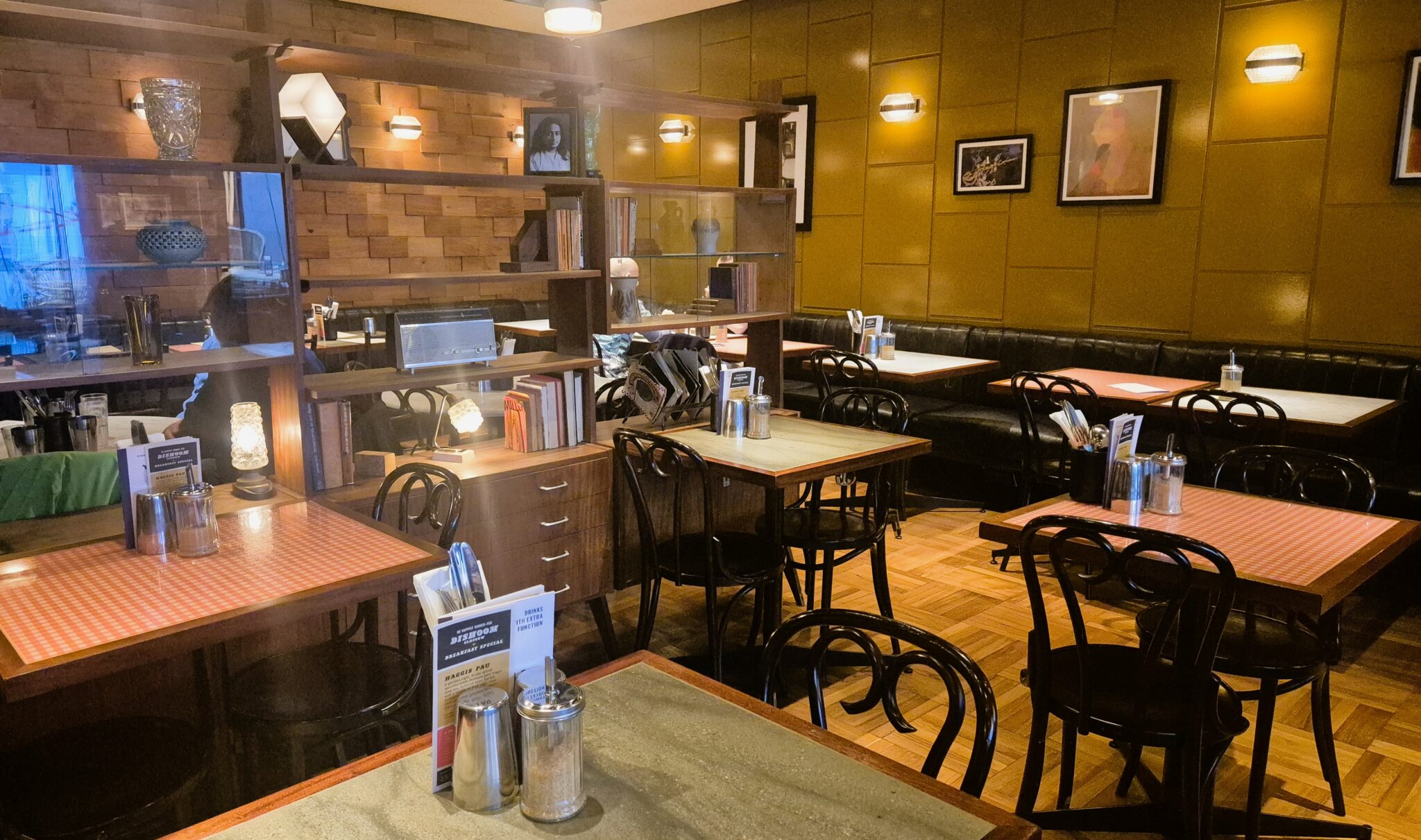 Το ζεστό σκούρο ξύλο κυριαρχεί στους χώρους που διανθίζονται με ρετρό πινελιές: ασπρόμαυρο δάπεδο σκακιέρα μπροστά στη μπάρα, ένα jukebox στη γωνία, ένα παλιό ραδιόφωνο στο σαλόνι, εξώφυλλα vintage βινυλίων, αφίσες ινδικών ταινιών στους τοίχους. Οι δερμάτινες πολυθρόνες με τα πολύχρωμα μαξιλάρια, τα βιβλία στα ράφια και οι παλιές καδραρισμένες φωτογραφίες, συνθέτουν ένα σκηνικό οικειότητας, που επιφυλάσσει την πιο ευχάριστη νότα ελληνικής φιλοξενίας -το φωτεινό χαμόγελο και την εγκάρδια υποδοχή της Νεκταρίας, Assistant Manager του Dishoom Carnaby, που μας μύησε στα μυστικά των ινδικών comfort και street food γεύσεων. Βέβαια οι πιστοί φίλοι της αλυσίδας -όπως και το έγκριτο Time Out London που σταθερά περιλαμβάνει το Dishoom στις top λίστες του- ορκίζονται στο όνομα των θεσπέσιων naan για πρωινό.