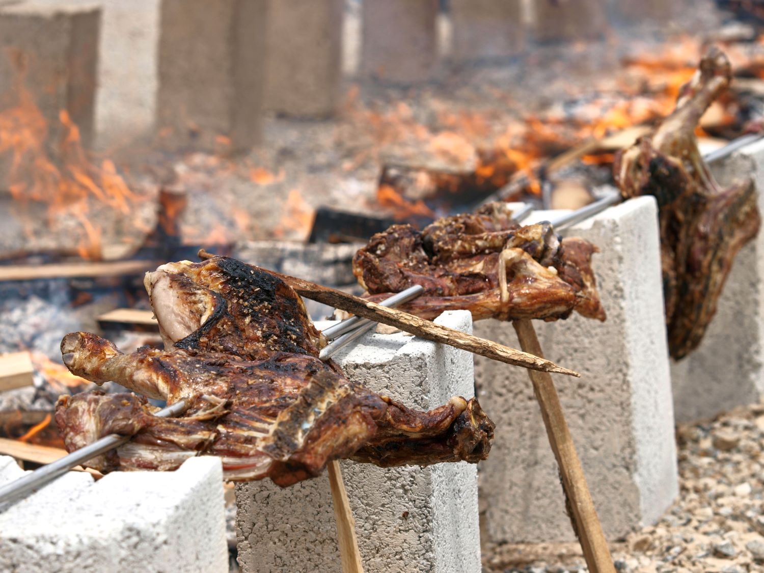 Τα κρέατα δεν προέρχονται από το κυνήγι, αλλά, εδώ και 14.000 χρόνια, μετά την Αγροτική Επανάσταση, είναι εκτροφής. Ευτυχώς, γιατί τα σφάγια που μπαίνουν αντίκρυ στη ζωντανή φωτιά πρέπει να είναι παχιά, και να έχουν λίπος να κάψουν για να μην στεγνώσουν ή καούν τα ίδια. Γι’ αυτό προτιμούν αρνί ή «κωλοπετσωμένο ζυγούρι χρονιάρικο». Όλα αρχίζουν από τον τεμαχισμό του σφαχτού, περίπου στη μέση, αφήνοντας τρία πλευρά προς τη μεριά των νεφρών, όντως προς τα μεριά. Αλλιώς σουβλίζεται το μπροστάρι και αλλιώς το μερί. Για να έχουν ομοιόμορφο πάχος και να ψηθούν σωστά, όλα τα τεταρτημόρια του αρνιού ανοίγονται.
