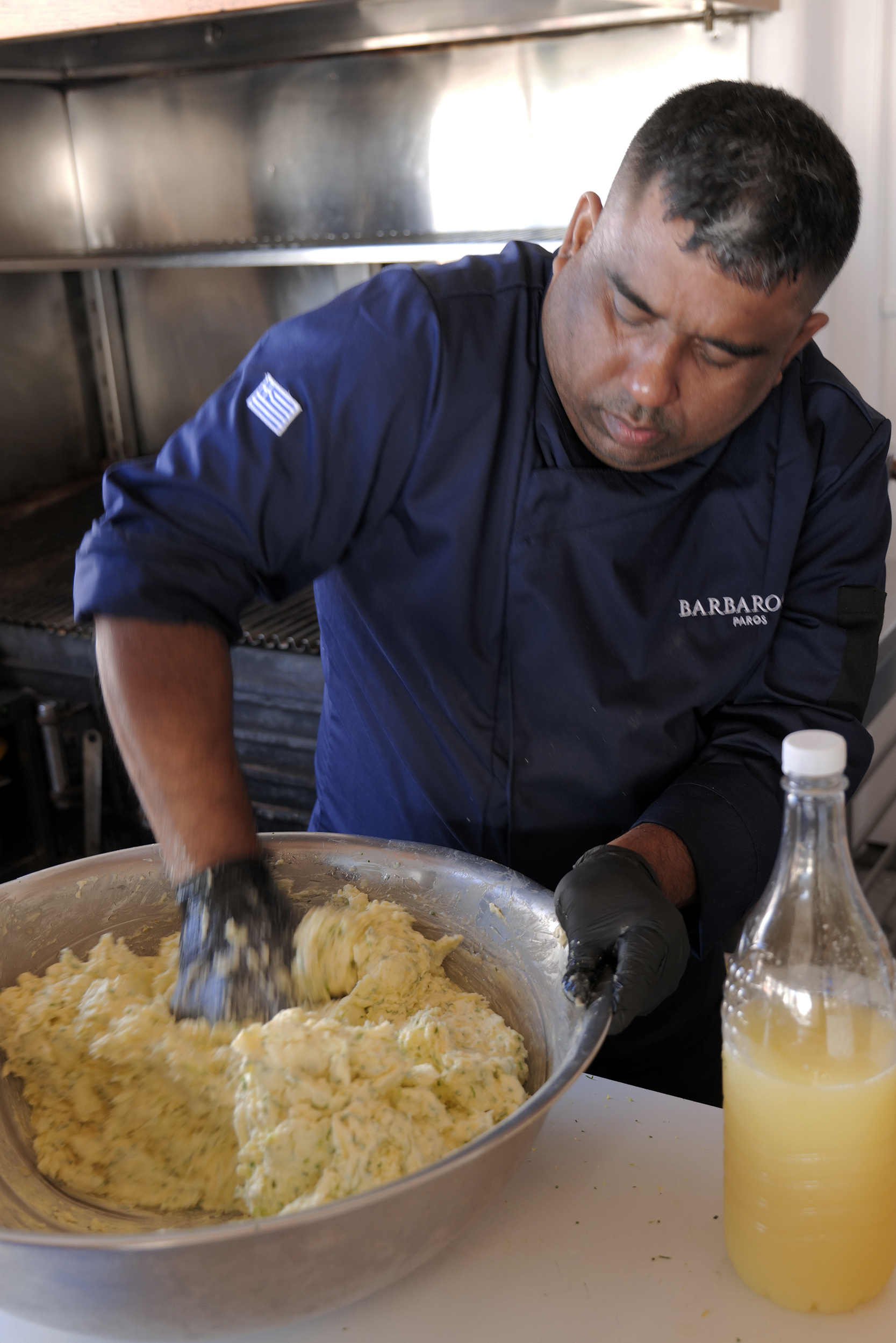 Ζητώ την άδεια να μπω στην κουζίνα, όπου συναντώ τον Θανάση Κακαρά, executive chef του εστιατορίου, να καθοδηγεί με μαεστρία αλλά και με παροιμιώδη ηρεμία τους συνεργάτες του στην μακρόστενη κουζίνα, μια ηρεμία αταίριαστη στο άγχος που μπορεί να προκαλέσει το άνοιγμα ενός εστιατορίου με τη φήμη του “Barbarossa”.
