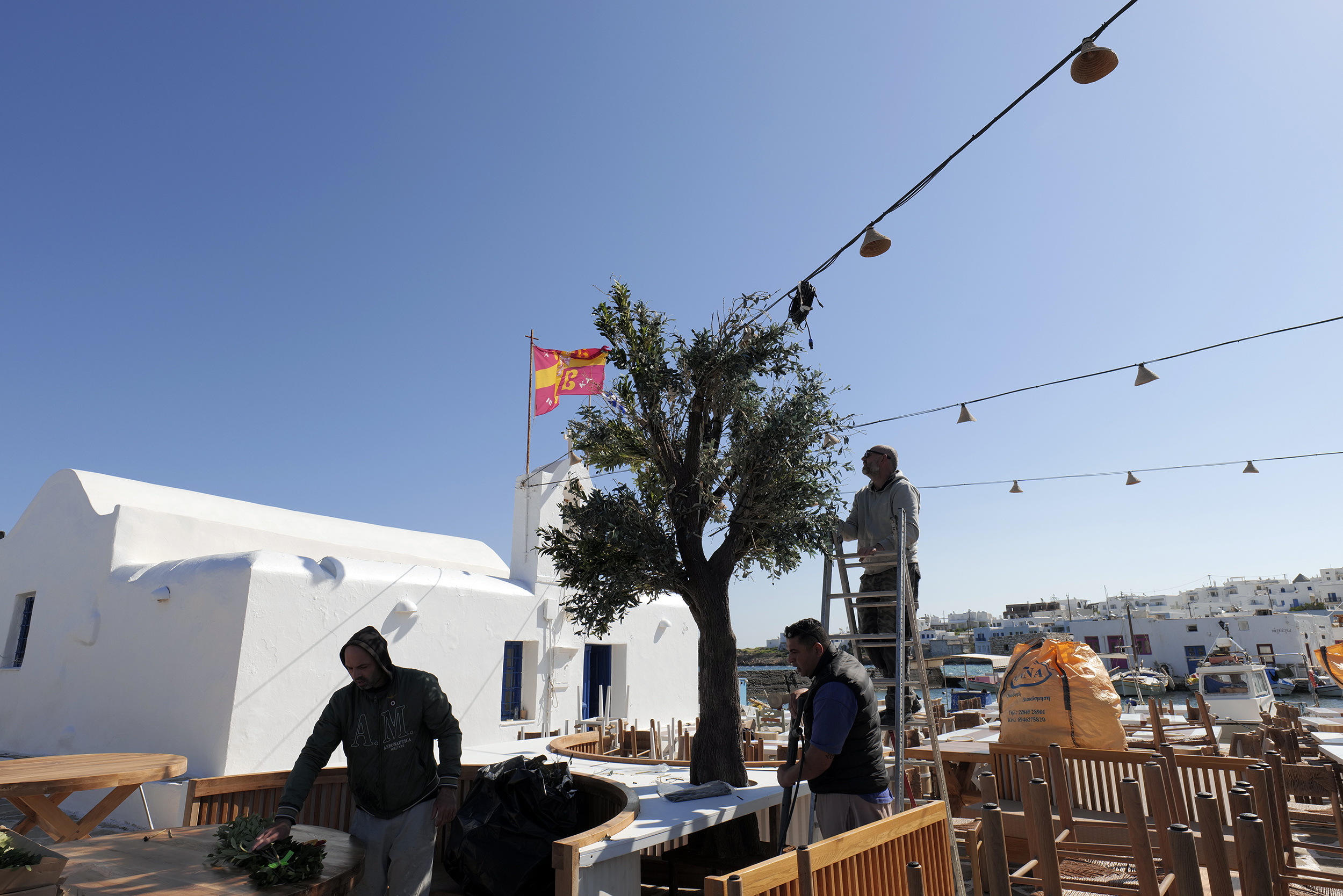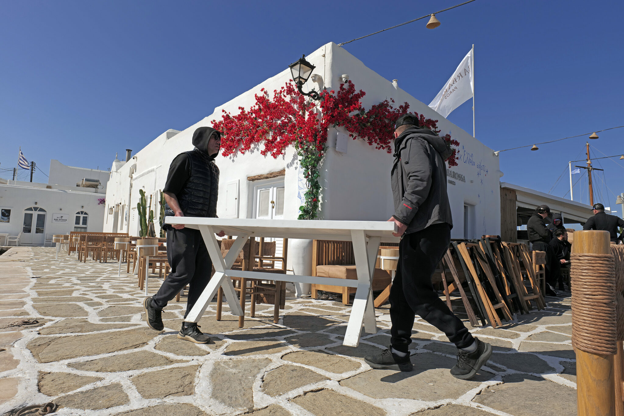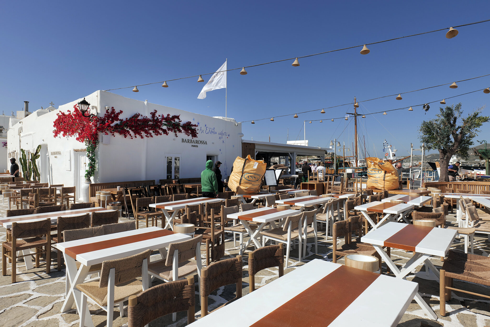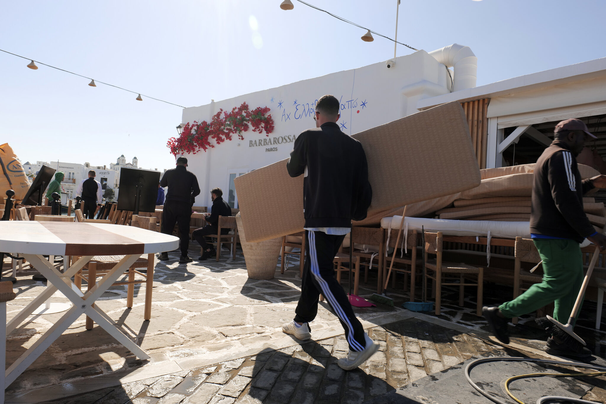 Πάγκοι μεταφέρονται στα σωστά σημεία, αρχίζουν να στοιχίζονται. Οι καρέκλες και τα τραπέζια, ποιότητας εφάμιλλης της φήμης του “Barbarossa”, βρίσκουν τη θέση τους για όλη την επερχόμενη καλοκαιρινή σεζόν. Παράλληλα με τα πιεστικά μηχανήματα τα οποία καθαρίζουν αποτελεσματικά κάθε γωνιά του εξωτερικού χώρου, ένας υπάλληλος της τοπικής αρχής, ασβεστώνει ευλαβικά το παρεκκλήσι κάνοντάς το να λάμπει, όπως ακριβώς αξίζει σε αυτή τη γωνιά του χάρτη, στο κέντρο των Κυκλάδων.