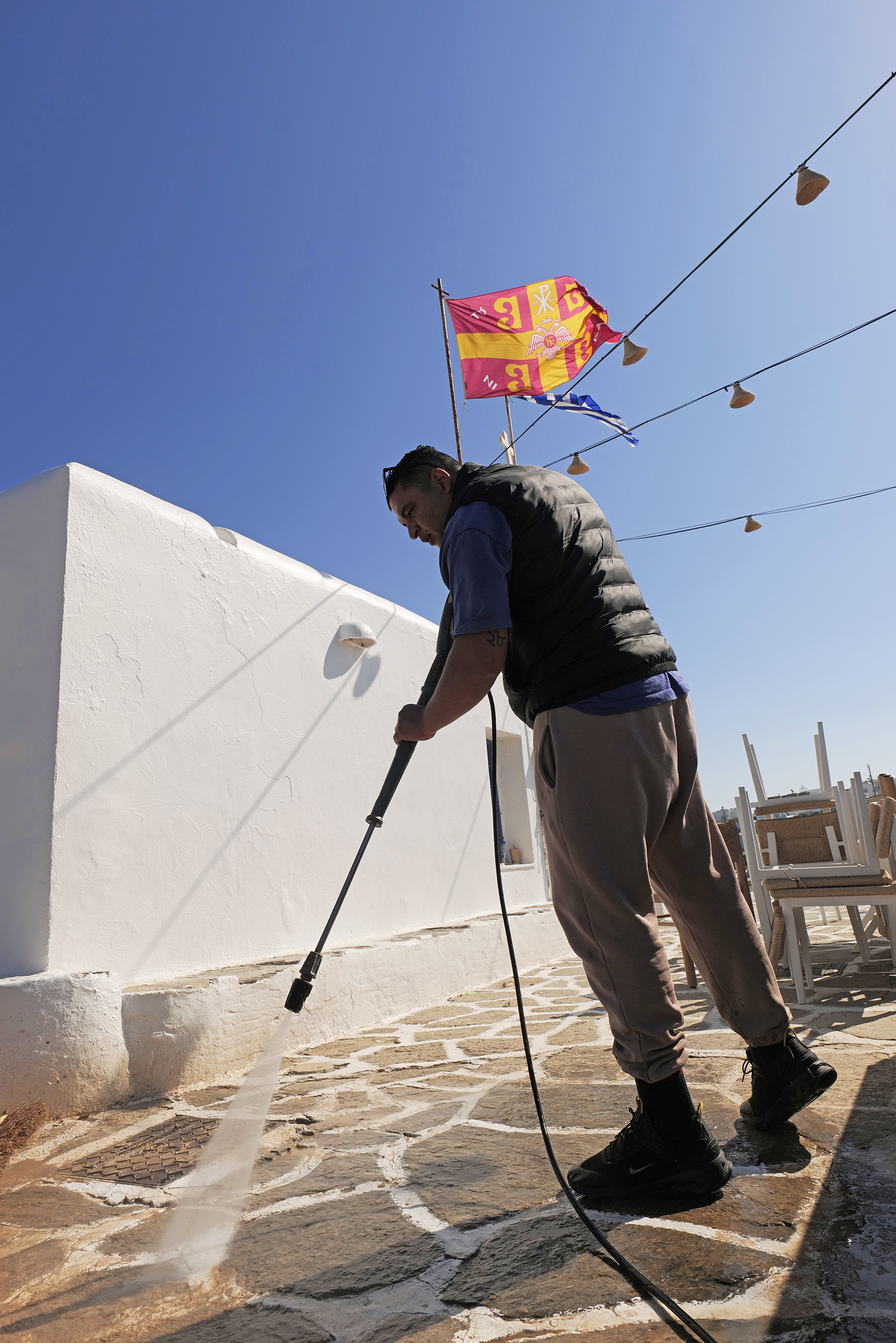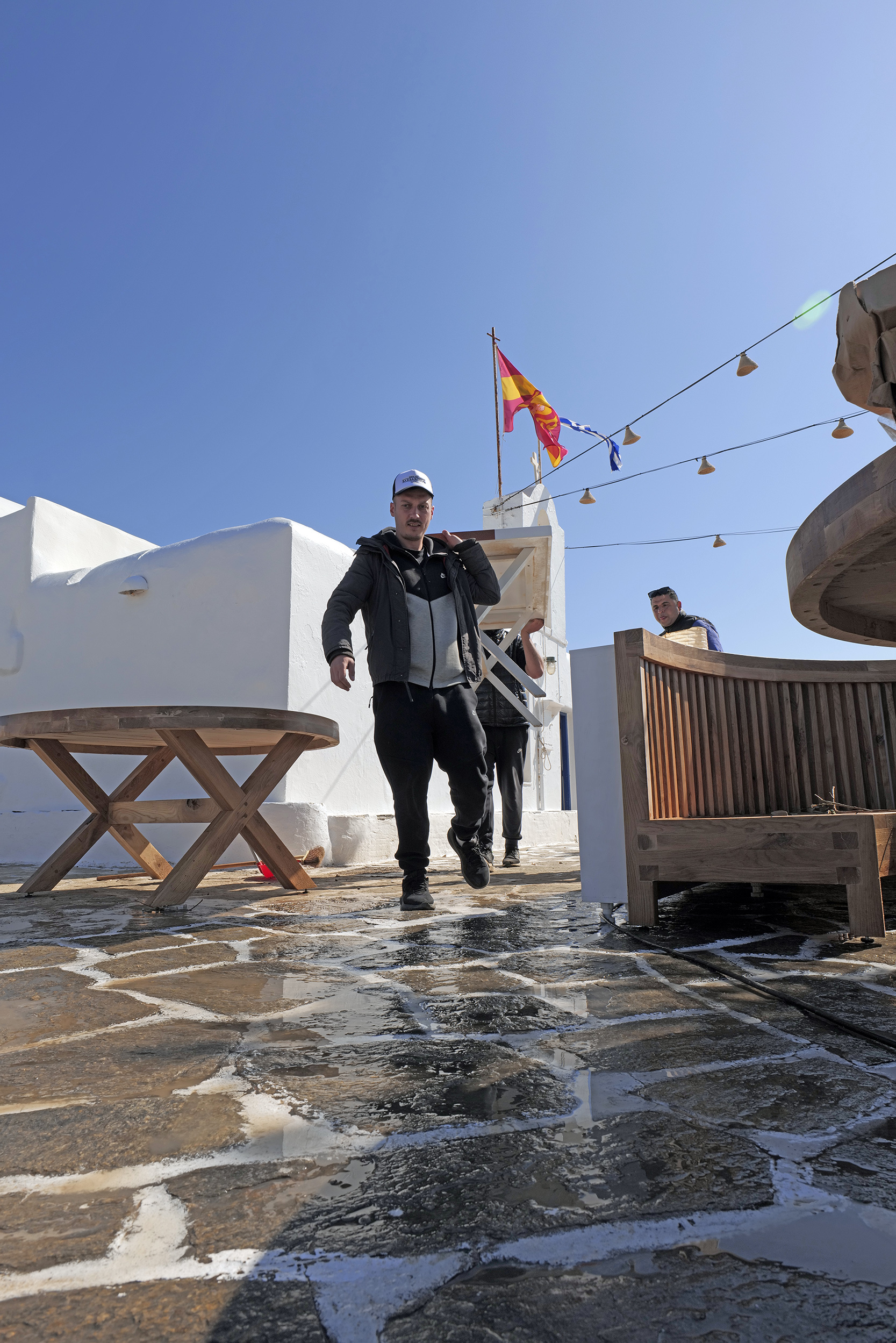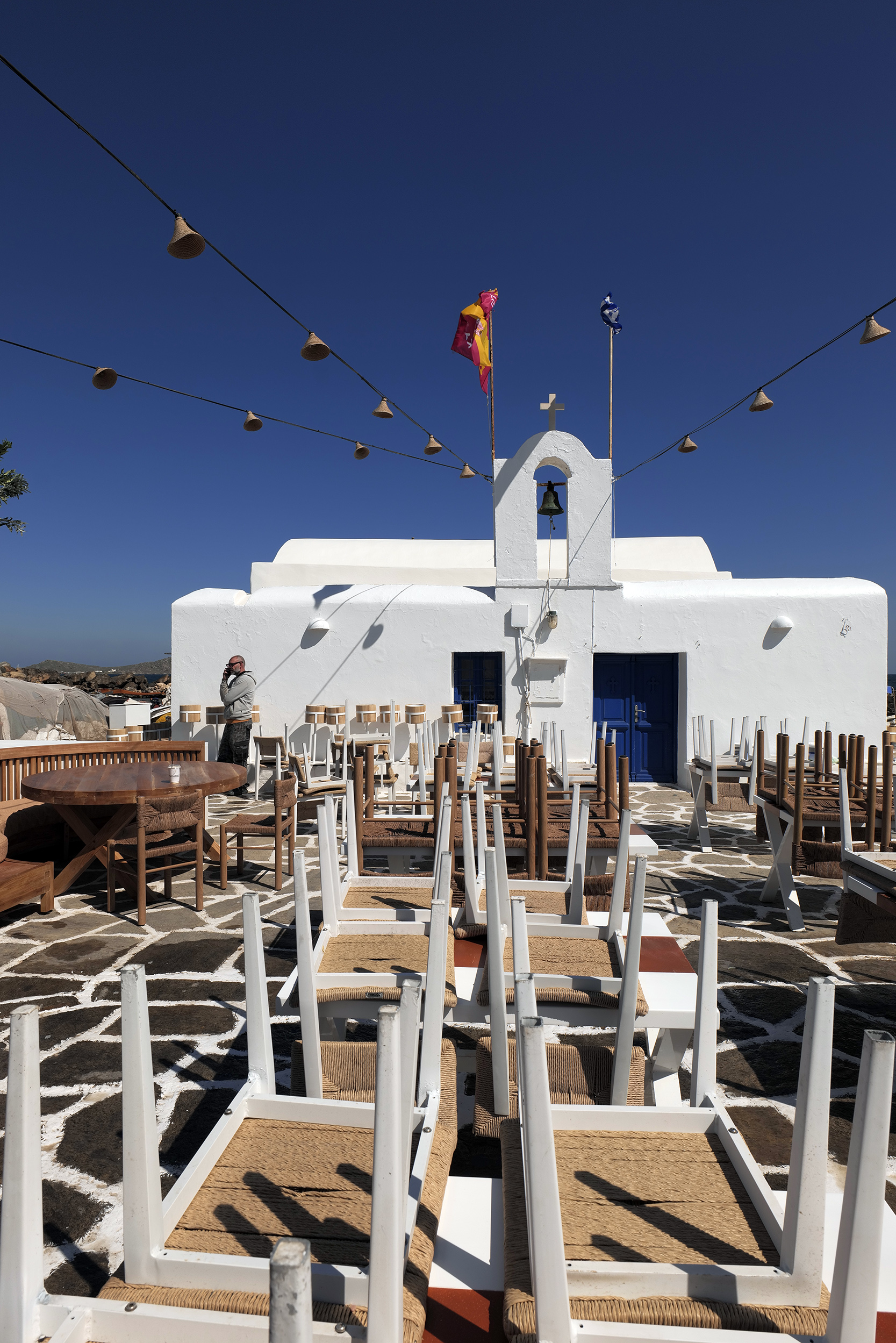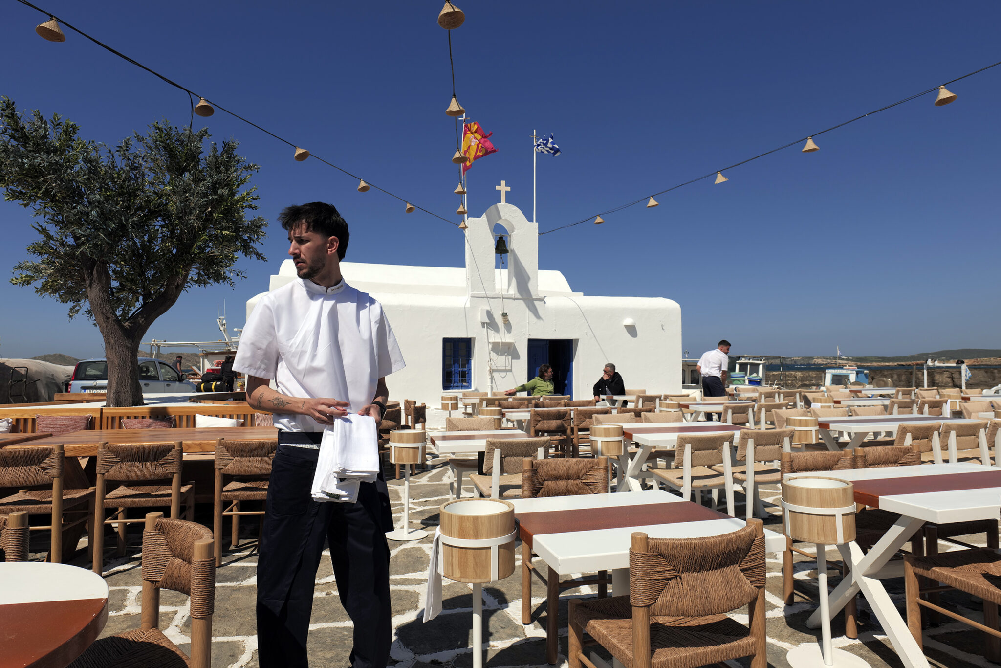 Πάγκοι μεταφέρονται στα σωστά σημεία, αρχίζουν να στοιχίζονται. Οι καρέκλες και τα τραπέζια, ποιότητας εφάμιλλης της φήμης του “Barbarossa”, βρίσκουν τη θέση τους για όλη την επερχόμενη καλοκαιρινή σεζόν. Παράλληλα με τα πιεστικά μηχανήματα τα οποία καθαρίζουν αποτελεσματικά κάθε γωνιά του εξωτερικού χώρου, ένας υπάλληλος της τοπικής αρχής, ασβεστώνει ευλαβικά το παρεκκλήσι κάνοντάς το να λάμπει, όπως ακριβώς αξίζει σε αυτή τη γωνιά του χάρτη, στο κέντρο των Κυκλάδων.