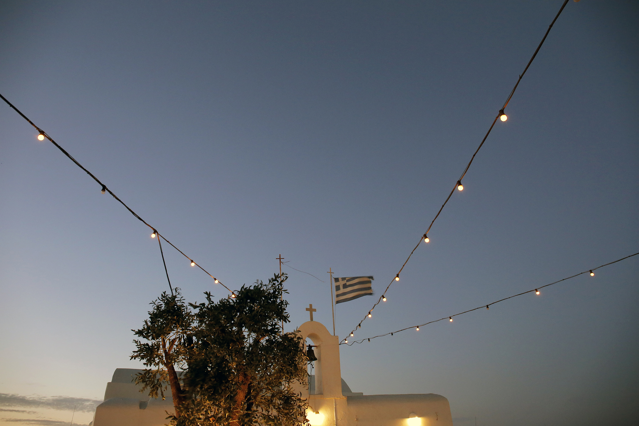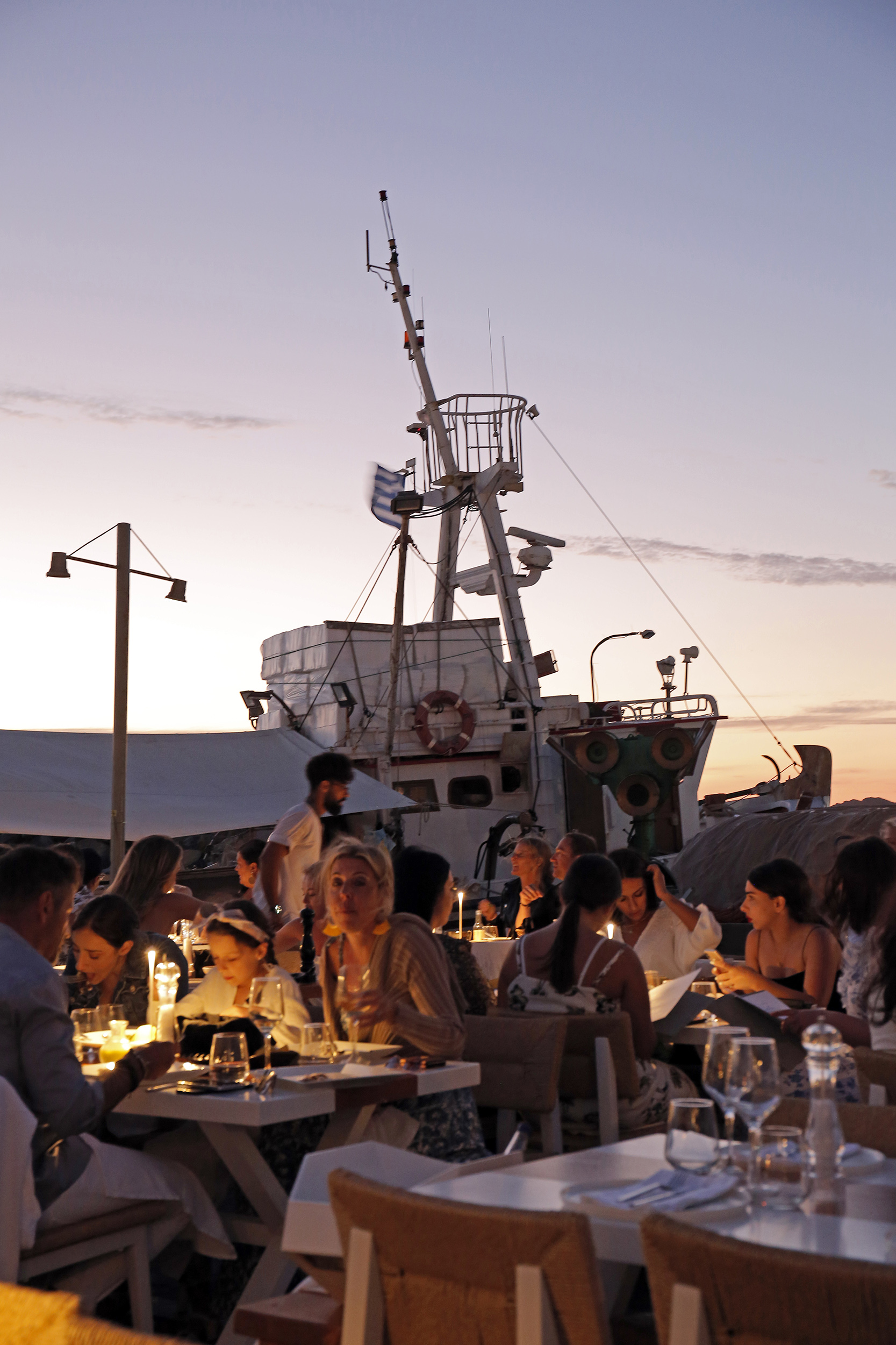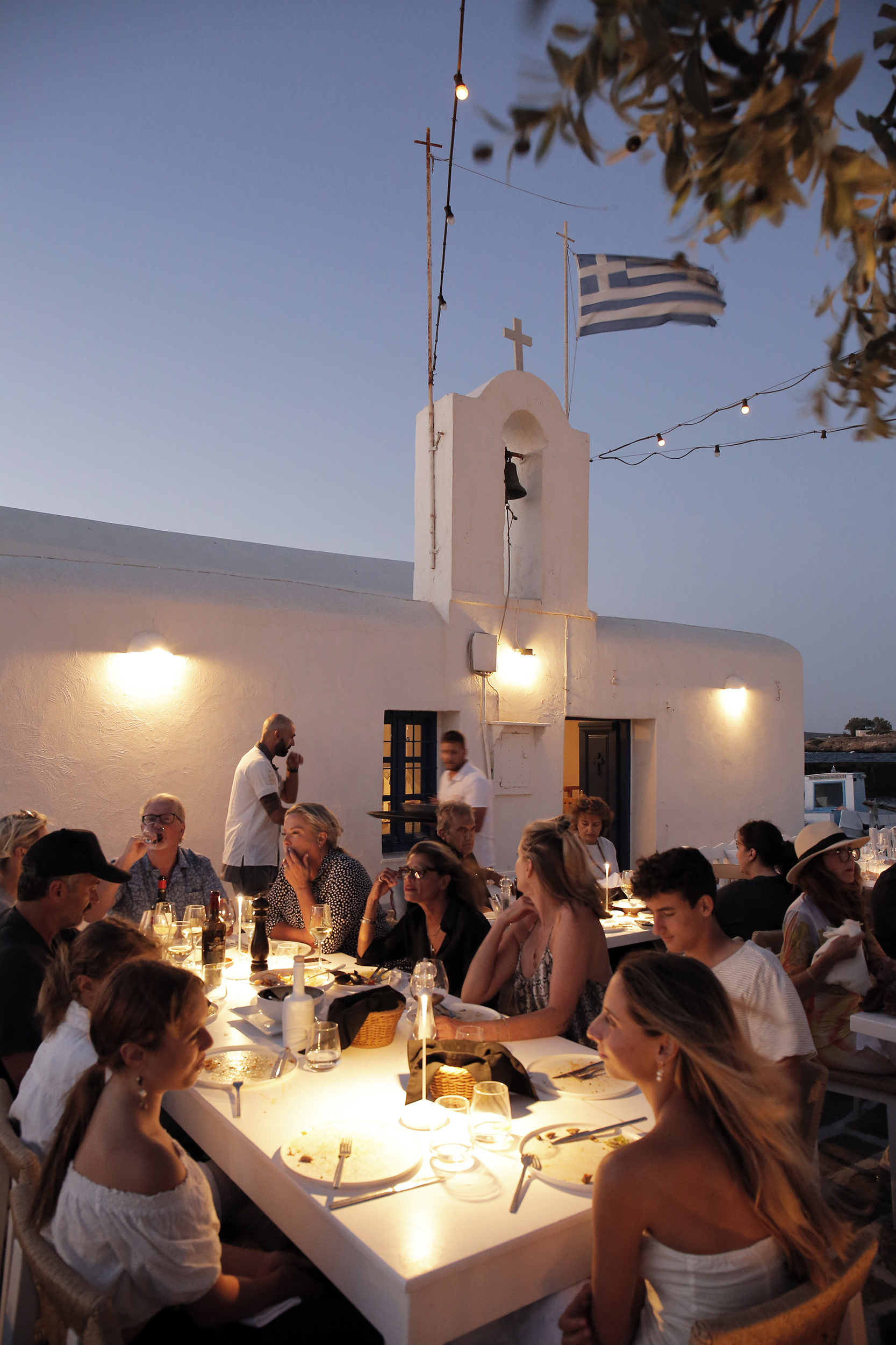 Οι δουλειές προετοιμασίας τελείωσαν. Το προσωπικό, ντυμένο με τις καλαίσθητες στολές, στέκεται πανέτοιμο στο πόστο του, ο εξωτερικός χώρος, τέλεια στρωμένος πια, μοιράζεται το φως και τα χρώματα του ηλιοβασιλέματος, το μωβ-πορτοκαλί του ουρανού, με τις λάμπες που συνδέουν τις γωνιές της πλατείας μεταξύ τους.