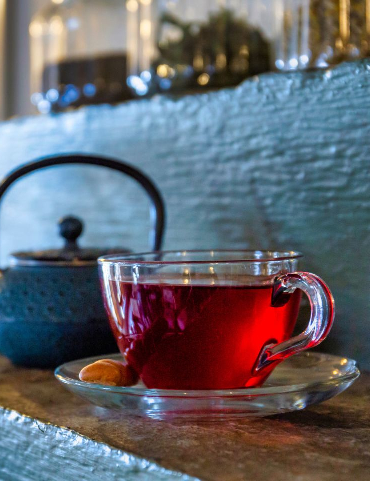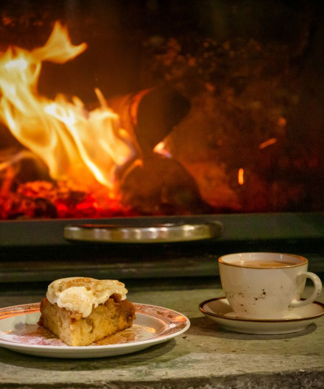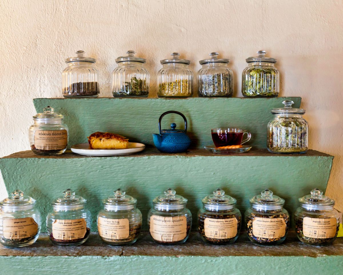 Προκειμένου να διαλέξετε από τη μεγάλη ποικιλία τσαγιών, θα τα βρείτε σε γυάλινα βάζα με πλήρη περιγραφή τους πάνω στο τζάκι. Πολύ ταιριαστό με την εποχή το κόκκινο τσάι «Φθινοπωρινά Χρώματα» περιέχει μήλο, αμύγδαλο και κάρδαμο και δίνει μια αίσθηση ζεστασιάς με το τζίντζερ και το μαύρο πιπέρι, όπως και το «Κόκκινο δάσος» με αγριοτριαντάφυλλο, κόκκινα φραγκοστάφυλλα, ολόκληρα βατόμουρα και σαμπούκο που απαντάται συχνά στο Πήλιο. Στα γλυκά επικρατούν οι παραδοσιακές συνταγές με πρωταγωνιστή το πληθωρικό γαλακτομπούρεκο, ενώ εκτός από το κλασσικό γλυκό του κουταλιού φιρίκι, υπάρχει νοστιμότατο μαυροκέρασο και καρυδάκι, όλα από τις πηλιορείτικες πλαγιές.