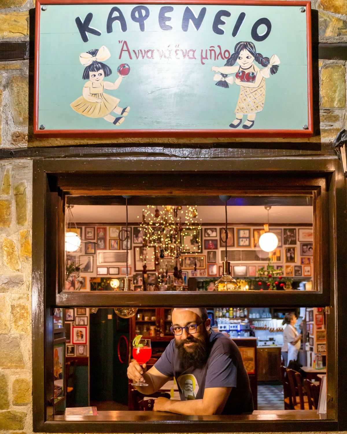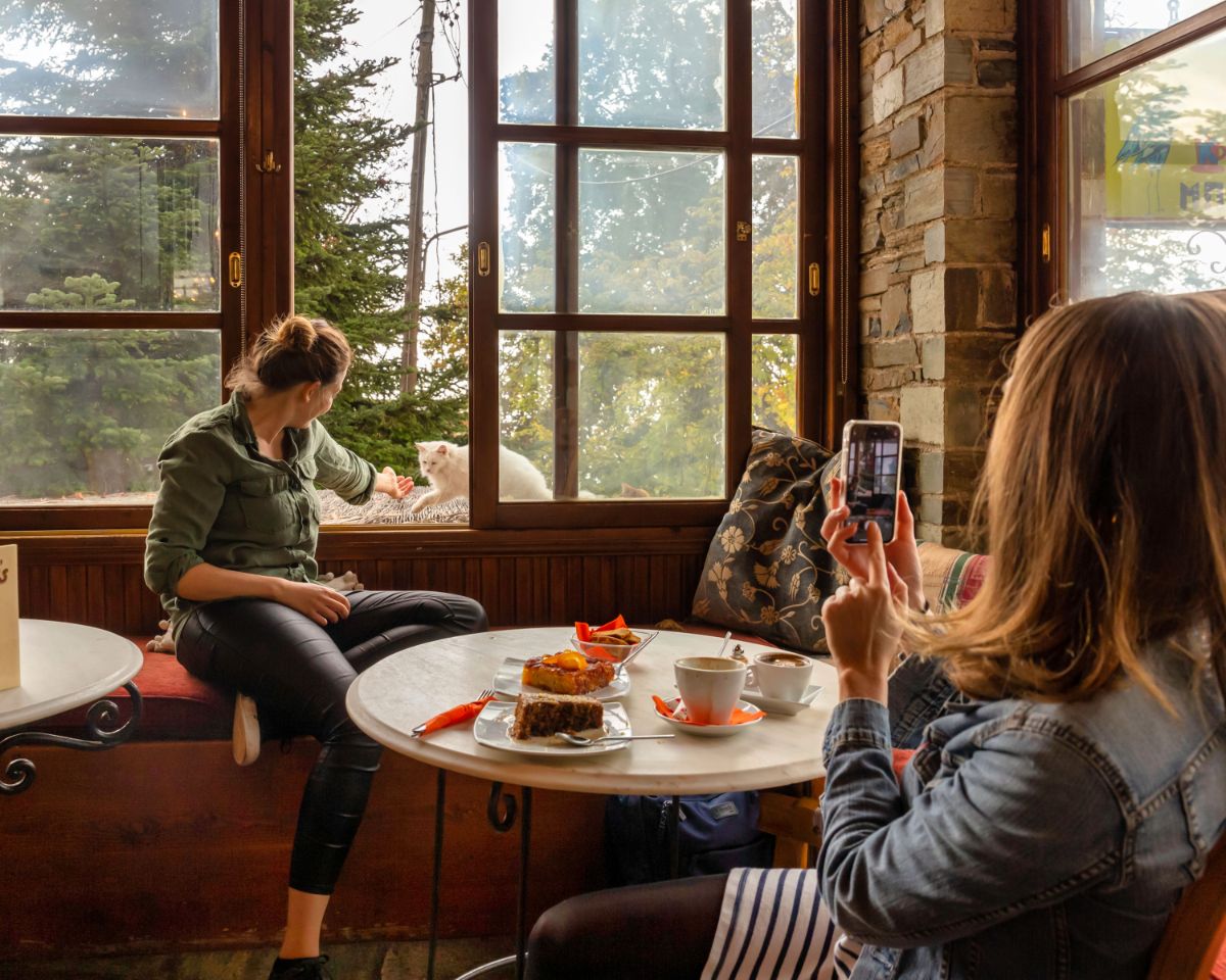 Ο Γιώργος και η Θάλεια, το νεαρό ζευγάρι των ιδιοκτητών, θα σας υποδεχθούν με ζεστό χαμόγελο, ενώ καθώς θα πίνετε τον καφέ σας δίπλα στο παράθυρο με θέα στο εντυπωσιακό αρχοντικό Μπλάνα, η μασκότ του μαγαζιού, η ολόλευκη Χιονάτη, θα σας νιαουρίζει για να της ανοίξετε να μπει.