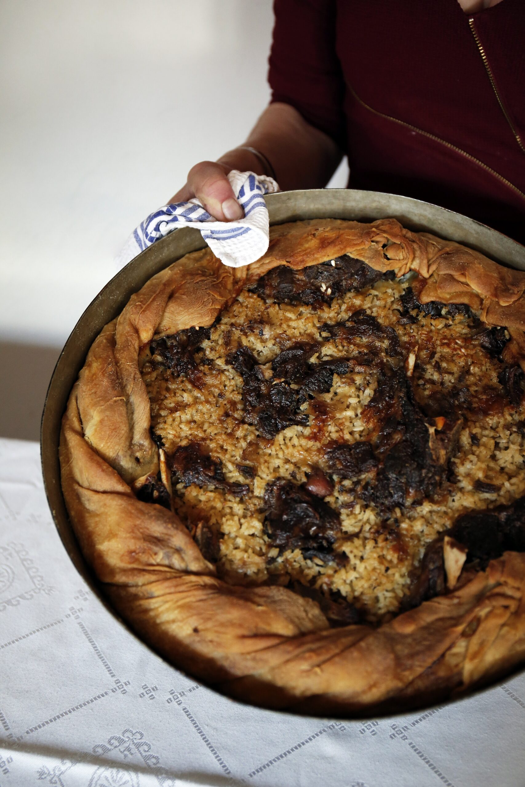 Τα ιδιαίτερα χαρακτηριστικά της είναι δύο. Από τη μια, το ρύζι που με κάθε ομολογία σπάνια θα συναντήσετε σε μια πίτα και, από την άλλη, το ιδιαίτερο δίπλωμά της –ολόκληρη τέχνη– που προσδίδει στην πίτα μια καλλιτεχνική έως και αφηρημένη οπτική. Μια πίτα πραγματικό έργο τέχνης. Ουσιαστικά, η πίτα αποτελεί έναν συνδυασμό κρεατόπιτας που συνοδεύεται από ρύζι ψημένο σε ζωμό μέσα στον φούρνο. Τα κομμάτια του κρέατος τοποθετούνται προσεκτικά στην άκρη της πίτας και καλύπτονται από την ζύμη, ενώ το ρύζι τοποθετείται στο κέντρο. Όλα μαζί ψήνονται στον φούρνο και σερβίρονται σε ένα λαχταριστο κομμάτι.