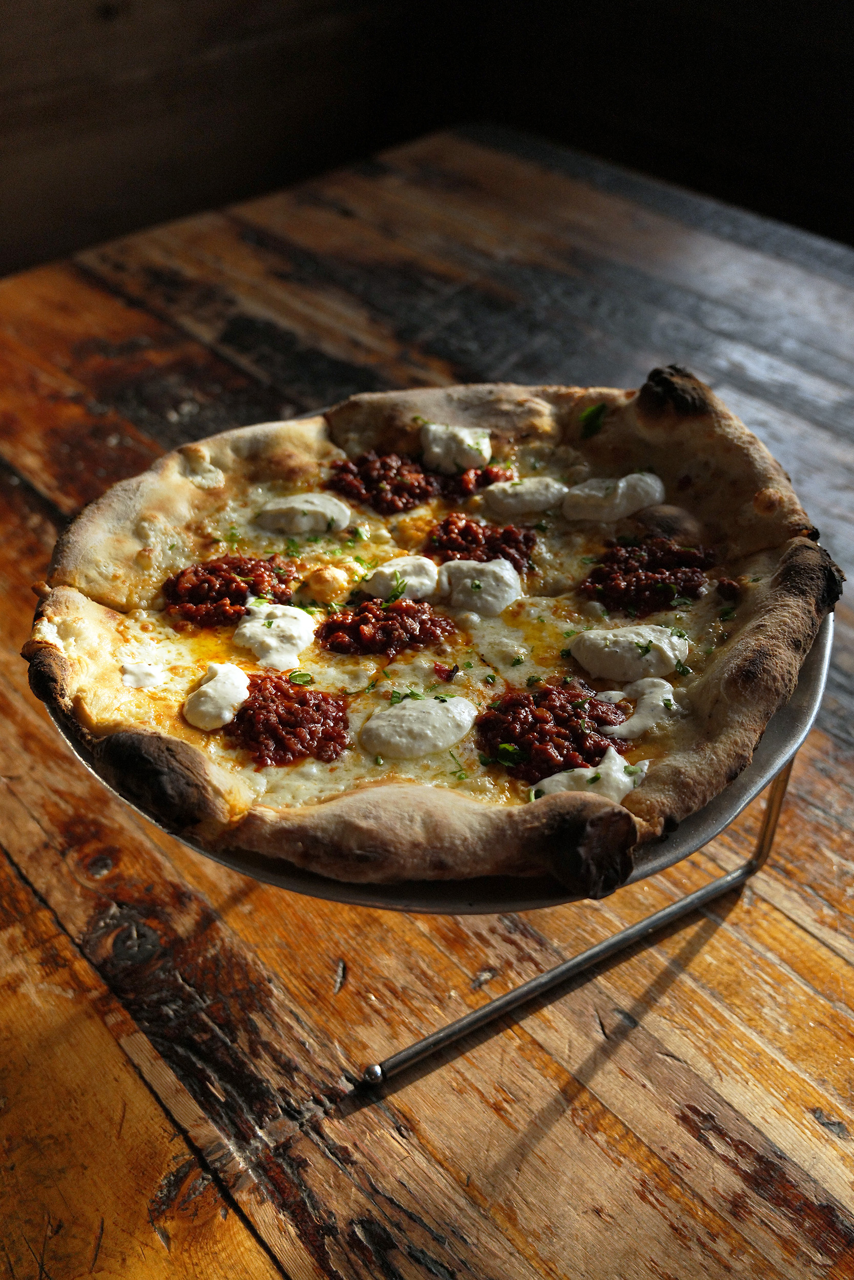 Και, μιλώντας για αυτή τη σάλτσα…Ο Matt χρησιμοποιεί μια μίξη από τις καλύτερες καλιφορνέζικες και σιτσιλιάνικες τομάτες για να φτιάξει τον βασικό λόγο για τον οποίο παρασύρθηκα και εγώ. Αυτήν την απίθανη, απλοϊκά μοιρασμένη αρωματικά και γευστικά, πασπαλισμένη μόνο με λίγο αλάτι και τίποτα άλλο, σάλτσα τομάτας. Η πίτσα φιλοξενεί μόνο αυτήν την εκδοχή της αλλά, άλλα πιάτα, όπως τα απίθανα κεφτεδάκια του, έχουν μια λίγο πειραγμένη εκδοχή, πασπαλισμένη με αρωματικά βότανα, ή η σάλτσα για τις μελιτζάνες στον ξυλόφουρνο, η οποία έχει αρωματιστεί με το απαραίτητο ψιλοκομμένο σκόρδο και λευκό κρεμμύδι. Το πολύ καλό ελαιόλαδο σε κάθε μαγείρεμα τελειοποιεί τη σπιτική αίσθηση και την ονειρική γεύση.