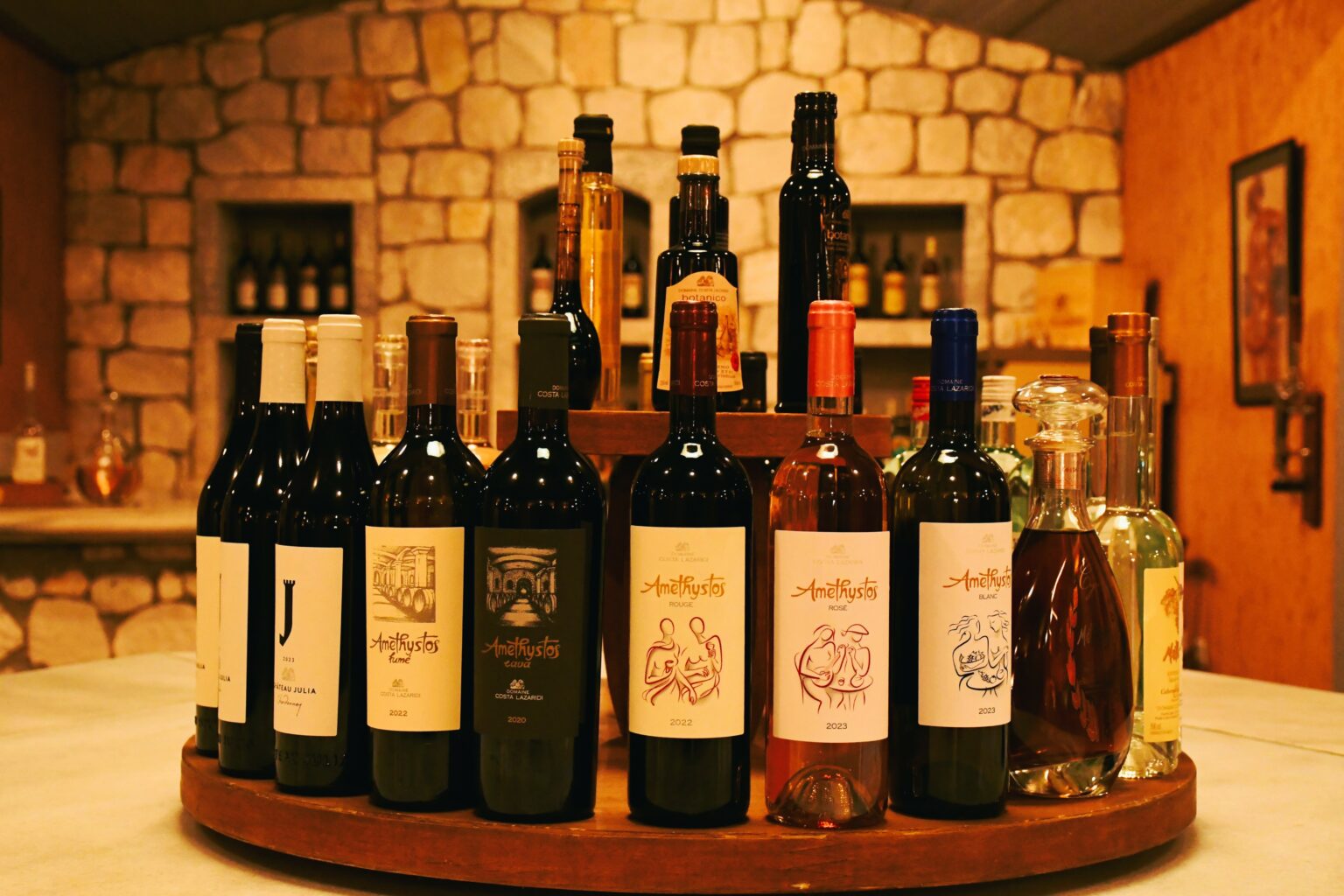 Ακολούθησε η εποχή της οινοποίησης και της εμφιάλωσης με απόλυτο σεβασμό στην παράδοση, σε συνδυασμό -πάντα- με τις σύγχρονες τεχνολογίες και την επιστημονική γνώση. Οι αμπελώνες του Domaine Costa Lazaridi εκτείνονται σε μια έκταση περίπου 2.800 στρεμμάτων, όπου καλλιεργούνται ελληνικές και διεθνείς ποικιλίες, όπως Ασύρτικο, Μαλαγουζιά, Merlot και Cabernet Sauvignon κ.α. Το κλίμα της περιοχής, με τις ιδανικές συνθήκες θερμοκρασίας και εδάφους, ευνοεί την παραγωγή οίνων υψηλής ποιότητας. Το οινοποιείο παράγει μια πλούσια γκάμα κρασιών, συμπεριλαμβανομένων των εμβληματικών σειρών «Amethystos», «Chateau Julia», «Οινότρια Γη».