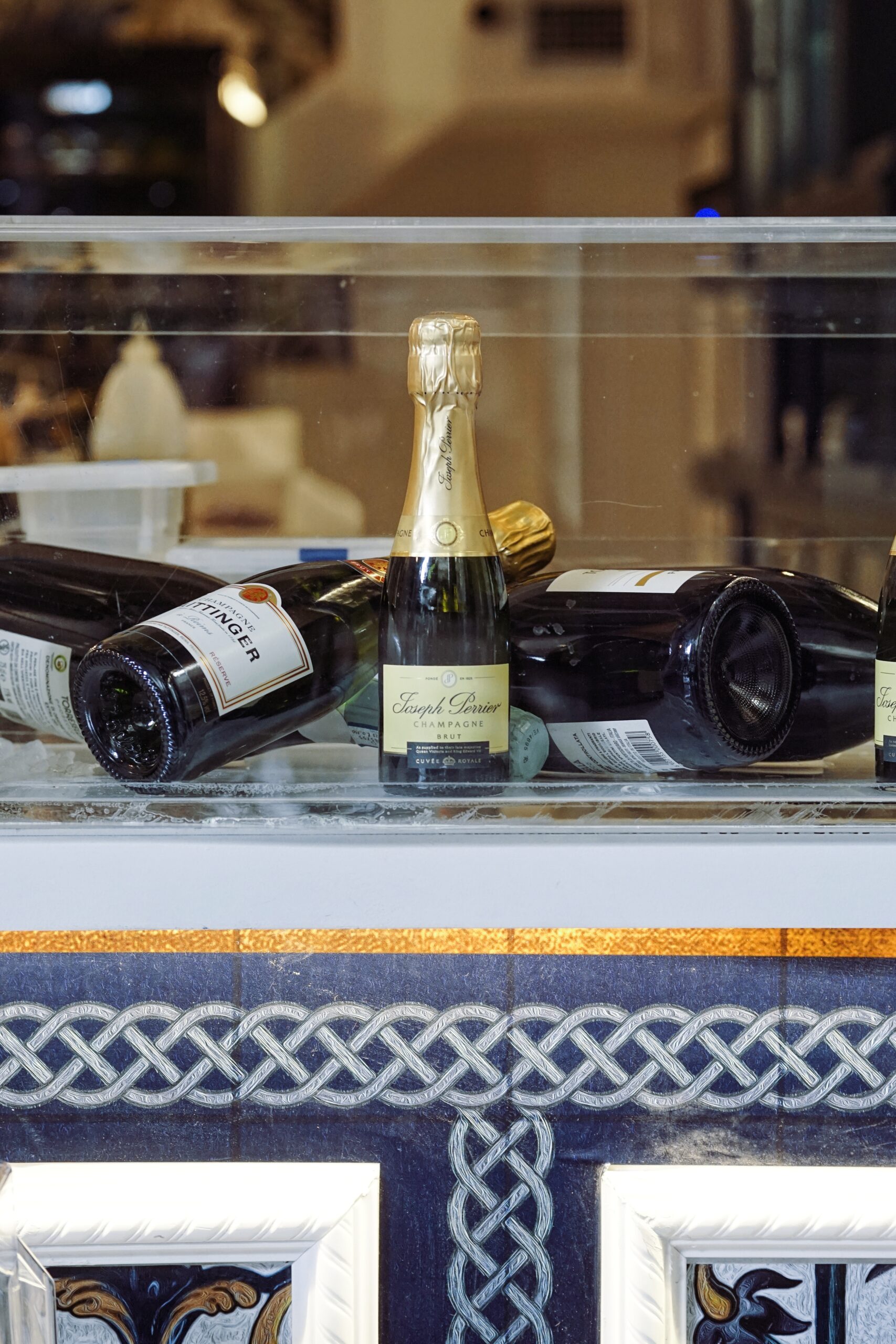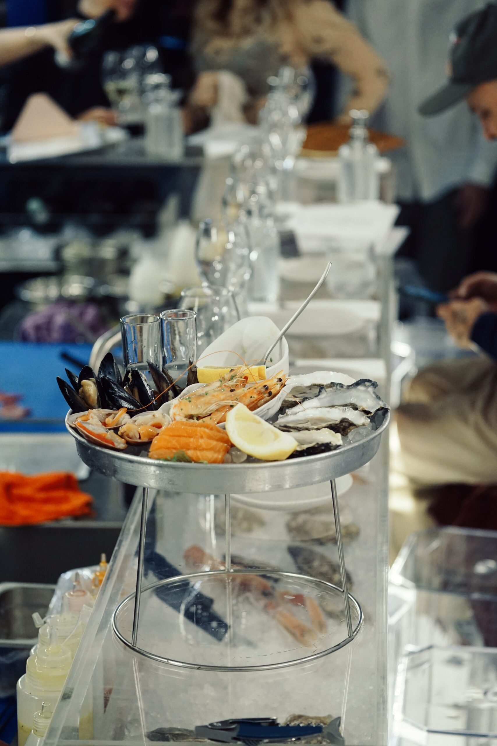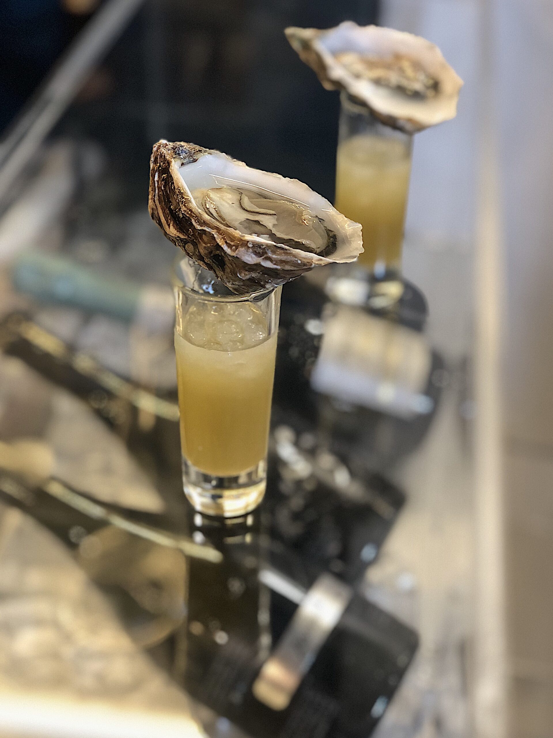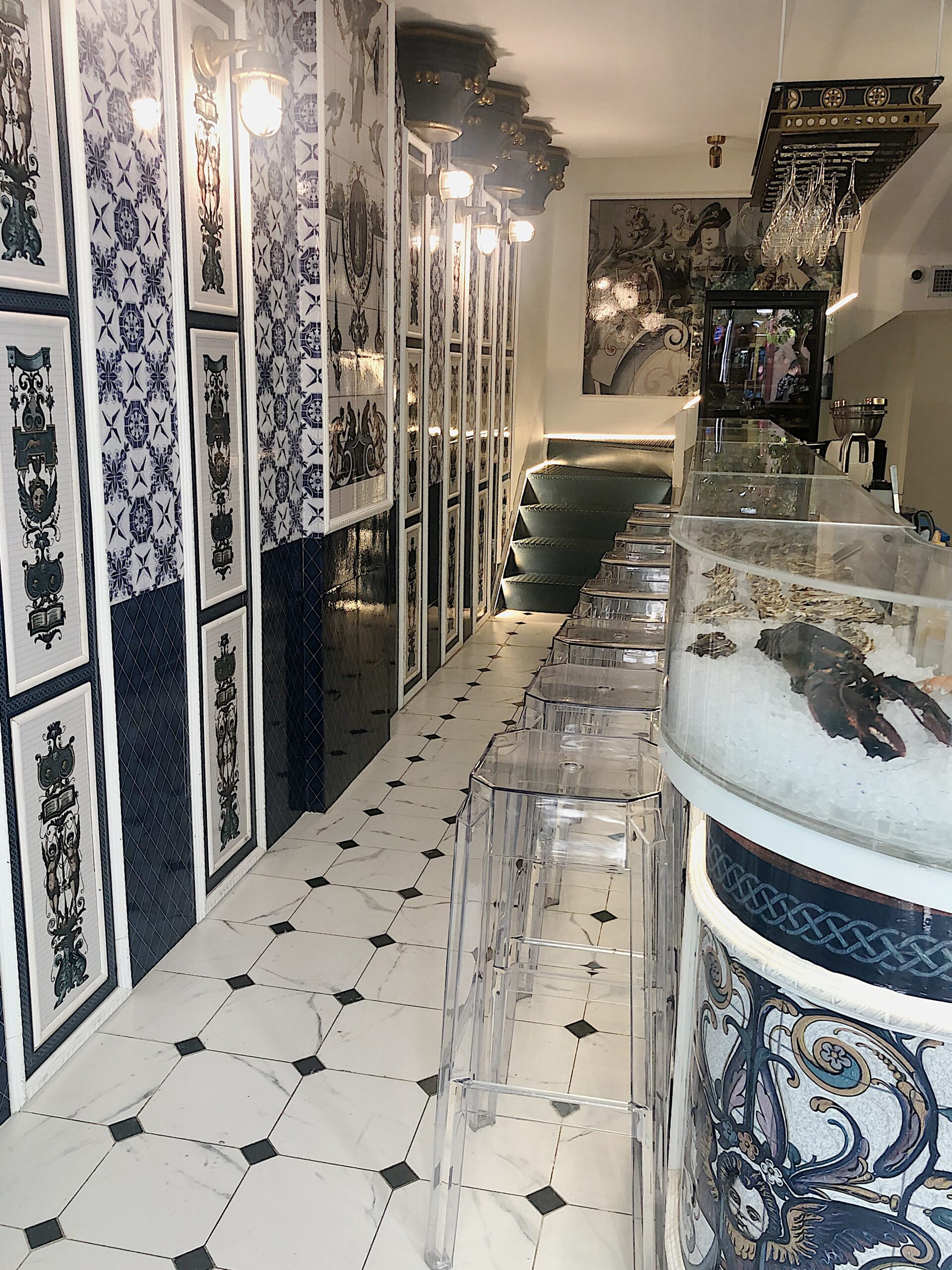 Την ασυνήθιστη και γεμάτη χαρακτήρα αισθητική του χώρου συμπληρώνει η γυάλινη μπάρα του μπαρ, που επιτρέπει σε λογής θαλασσινά και οστρακοειδή αλλά και σε σαμπάνιες να φιγουράρουν. Το ανοιχτό, δε, μπαρ κάνει τους μαέστρους της κουζίνες και τους θαμώνες μια παρέα. «Τα παιδιά δουλεύουν μπροστά στη μπαρ και είναι αυτοί οι host. Τα πάντα φτιάχνονται μπροστά στον πελάτη για να υπάρχει και το αίσθημα της ασφάλειας που απαιτεί το συγκεκριμένο προϊόν».
