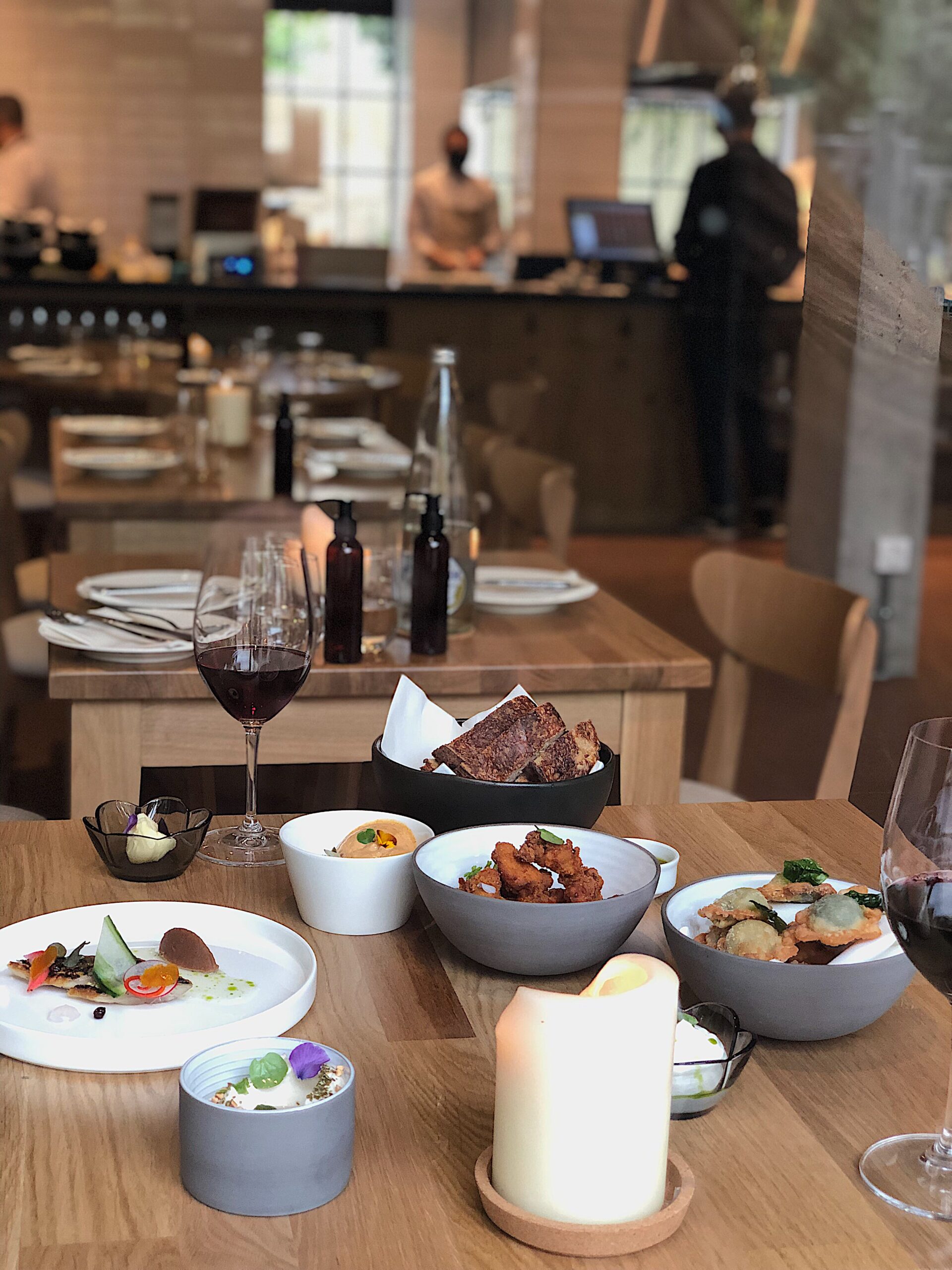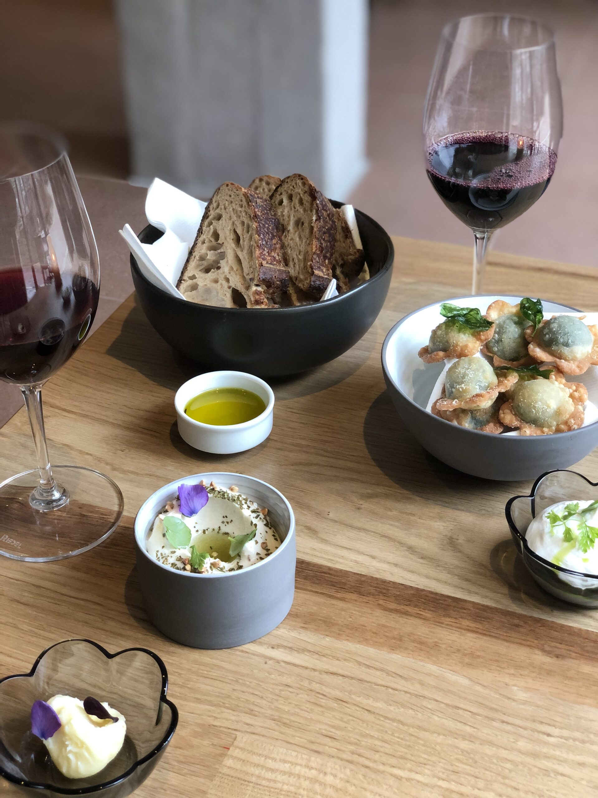 Στο εστιατόριο κάνουν το δικό τους προζυμένιο ψωμί 48ωρης ωρίμασης, με προζύμι 4 ετών που το λένε Καποδίστρια – ένα από τα πρώτα στοιχεία που φανερώνουν την Κερκυραϊκή καταγωγή του σεφ. Το βούτυρο από ξινή κρέμα – πραγματικά μεγάλη νοστιμιά – που έρχεται συνοδεία του ψωμιού, είναι επίσης δικό τους, ενώ σε ένα μικρό dip φέρνουν και ένα εξαιρετικό αγουρέλαιο από τη Μάνη. Σειρά στον κατάλογο θα πάρουν σε λίγο καιρό και τα χειροποίητα αλλαντικά. Τα μικρά χρυσαφένια σπανακοπιτάκια σε σχήμα ραβιόλι με την πληθωρική γέμιση έρχονται παρέα με ένα δροσερό και μεστό γιαούρτι, που παράγεται και αυτό στο εστιατόριο. Τα τραγανά bites κουνελιού, από μια μικρή βιολογική φάρμα στο Ρέθυμνο, σερβίρονται με μαγιονέζα σπετσιερικό – ένα μείγμα 12 μπαχαρικών, με γλυκές και καπνιστές νότες, που χρησιμοποιούν για την παστιτσάδα στην Κέρκυρα, καθώς και χειροποίητες πίκλες λαχανικών που προσθέτουν ένα όξινο στοιχείο στο πιάτο.