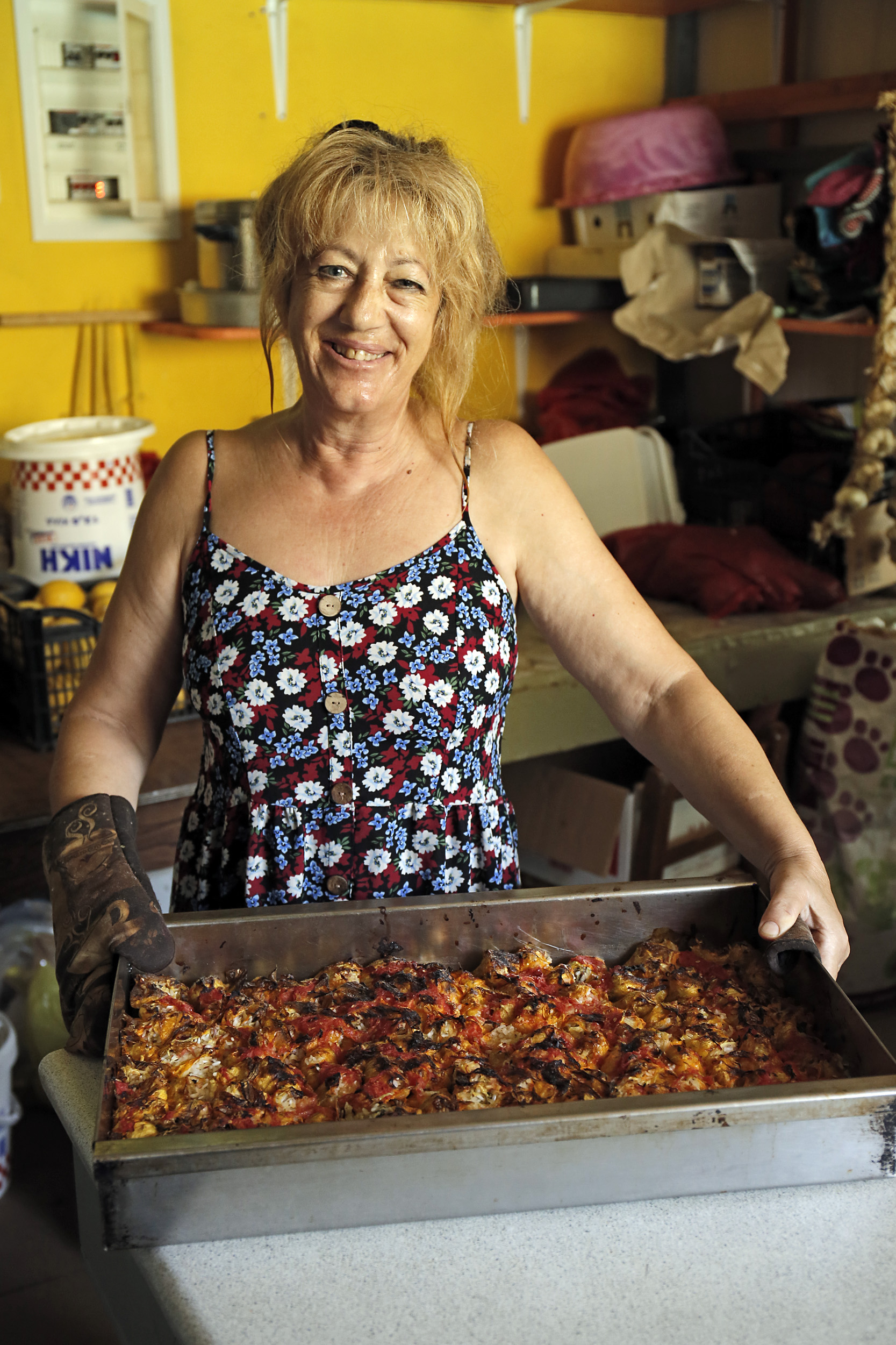 Από νωρίς το μεσημέρι καταλαμβάνονται τα πρώτα τραπέζια στο αίθριο και στα μπαλκονάκια, η έντονη κινητικότητα στην κουζίνα βγάζει μια θετική ενέργεια αλλά και πεντανόστιμες γεύσεις. Περί τα 12 ταψιά και τις 12 κατσαρόλες ετοιμάζονται καθημερινά, μου λέει η κυρία Ελένη Χιώτη, πρόεδρος του συνεταιρισμού αλλά και της γενικής επίβλεψης της κουζίνας, καθώς πλάθει τους λαχανοντολμάδες. Αλλά και ψητά, κρέας, ψάρια καθώς και μεζεδάκια απαρτίζουν το πολύ πλούσιο μενού καθημερινά χωρίς να περισσεύει τίποτα στο τέλος της ημέρας. Μεγάλα σουξέ είναι οι λαχανοντολμάδες, οι κεφτέδες, τα σουτζουκάκια αλλά και τα παπουτσάκια χωρίς να προσπερνούν γευστικά τα υπόλοιπα φαγητά τους. Ένα τηλέφωνο πριν πάτε για μια κράτηση, δεν είναι ποτέ κακή ιδέα.