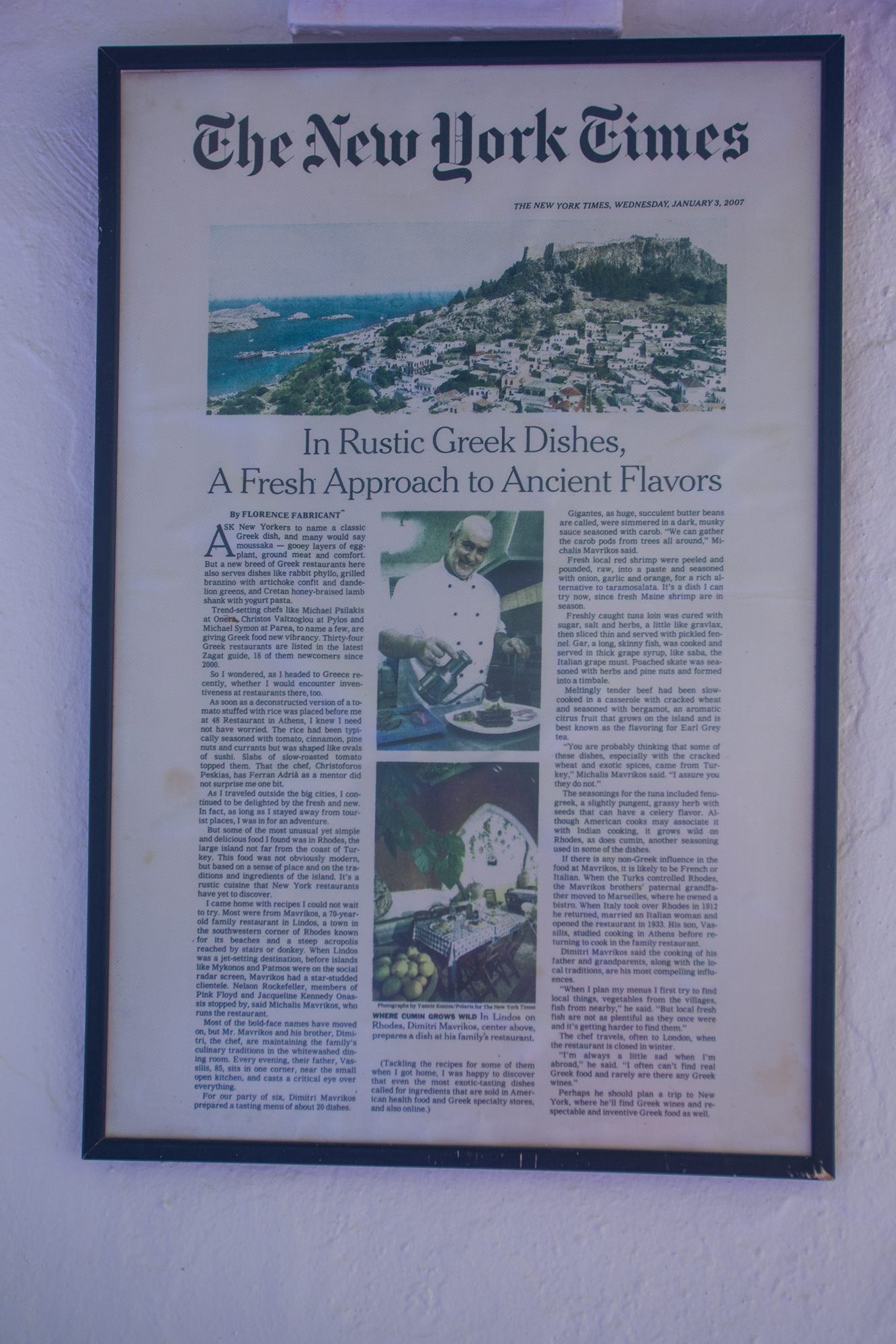 Ο χώρος του εστιατορίου τους είναι στην ουσία μια μεγάλη βοτσαλόστρωτη αυλή, με τις λευκές τυπικά ροδίτικες αψίδες της και τις πυκνές κληματαριές της για σκιερή «οροφή». Τα τραπέζια της, στρωμένα με ολόλευκα τραπεζομάντιλα και οι ξύλινες πτυσσόμενες καρέκλες κήπου, μαζί με τις δεκάδες φωτογραφίες στους τοίχους «μιλούν» υπαινικτικά για την ιστορία των ογδόντα οκτώ χρόνων τους –υπολογίζω μόνο όσα βρίσκεται το εστιατόριο σε αυτή την ίδια θέση, στην είσοδο της Λίνδου, χωρίς να λαμβάνω υπόψη πως ο παππούς Μαυρίκος πρωτάνοιξε το ομώνυμο εστιατόριο, το 1912, σε άλλη θέση.