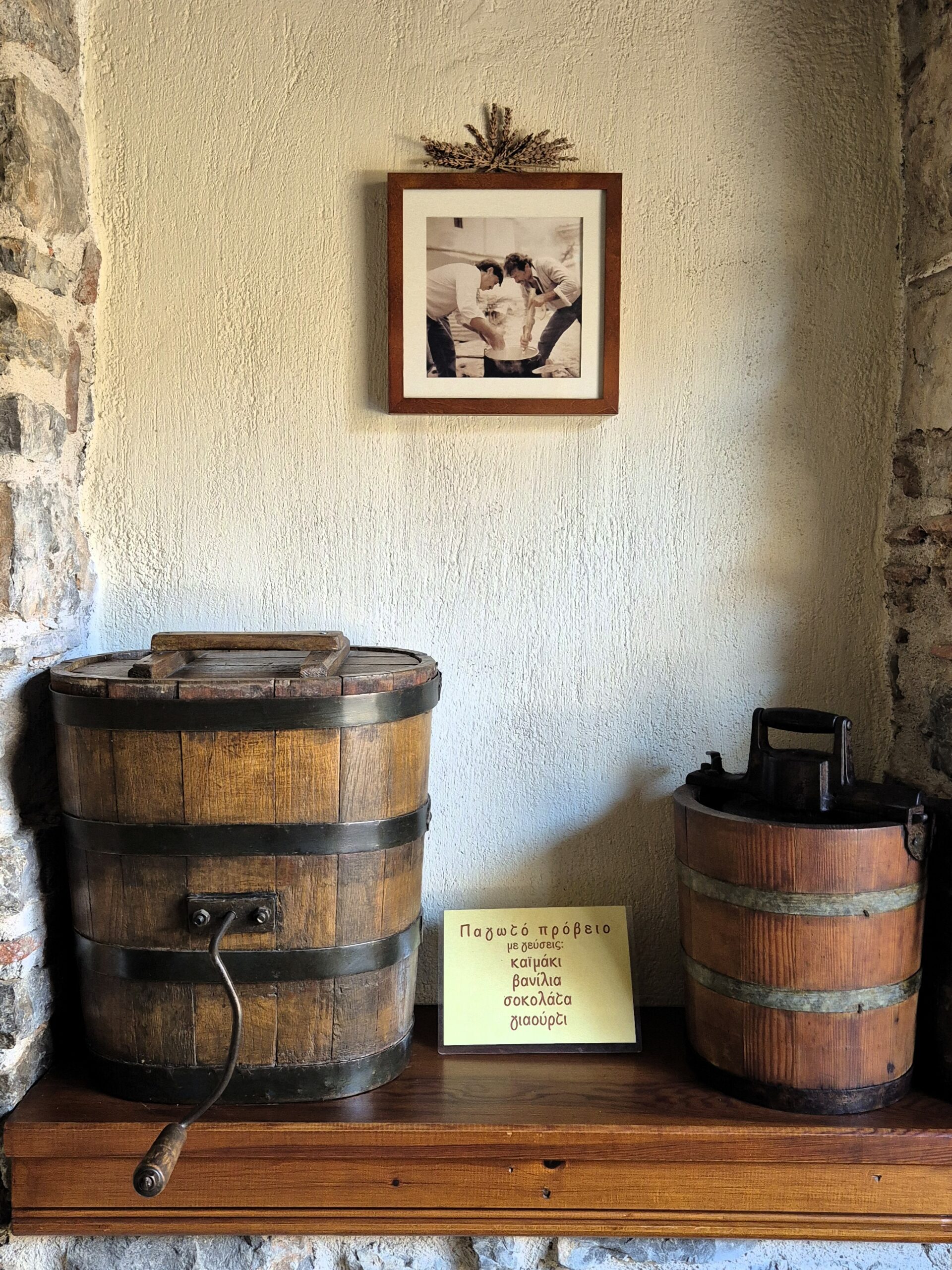 Ανάμεσα στις ξύλινες καρδάρες και τα πλεγμένα στο χέρι καλάθια με τις χυλοπίτες, τον τραχανά και το τσάι του βουνού που συλλέγεται φυσικά στις πλαγιές του Παρνασσού, η αναρτημένη λίστα των προϊόντων αναφέρει μεταξύ των υπόλοιπων ποιοτικών γεύσεων, το πρόβειο παγωτό. Φτιαγμένο στο χέρι, από αγνά υλικά, χωρίς πρόσθετα και σε τρεις μόνο γεύσεις –καϊμάκι, κρέμα και γιαούρτι, καμιά φορά και σοκολάτα «όταν το ζητά ο εγγονός», μας εκμυστηρεύεται η ευγενική τυροκόμος- προσφέρεται μόνο συσκευασμένο και μοιράζεται την ίδια εξαιρετική ποιότητα και γνήσια γεύση που αποτελούν χαρακτηριστικό και αδιαπραγμάτευτη αξία του Τυροκομείου Τυροβόλη.