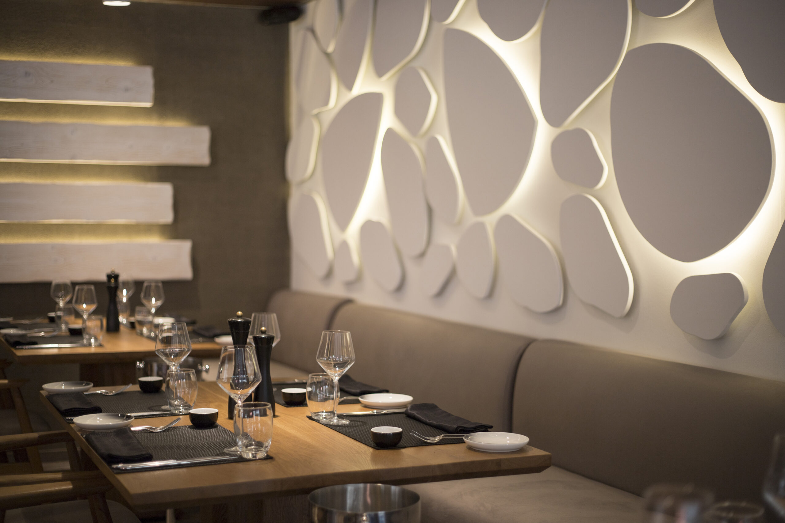 Το πλακάκι στη σάλα θυμίζει λέπια ψαριού και το σχέδιό του αναπαράγεται και στα σουβέρ. Καναπέδες στο μπλε της θάλασσας, στους τοίχους γλυπτοί γλάροι «επιβλέπουν» τα τραπέζια κάτω από τα φωτιστικά που θυμίζουν φινιστρίνια. Μπροστά από το εστιατόριο, ένας ευρύχωρος χώρος προστατευμένος με γυάλινους ανεμοθραύστες σε αφήνει να φας και να πιεις με οποιοδήποτε καιρό, κοιτάζοντας στον απέναντι τοίχο την απεικόνιση της θρυλικής μάχης του ψαρά και του σιδερά του Γαλατικού χωριού με όπλα τα ψάρια, από κάποια διάσημη περιπέτεια του Οβελίξ.
