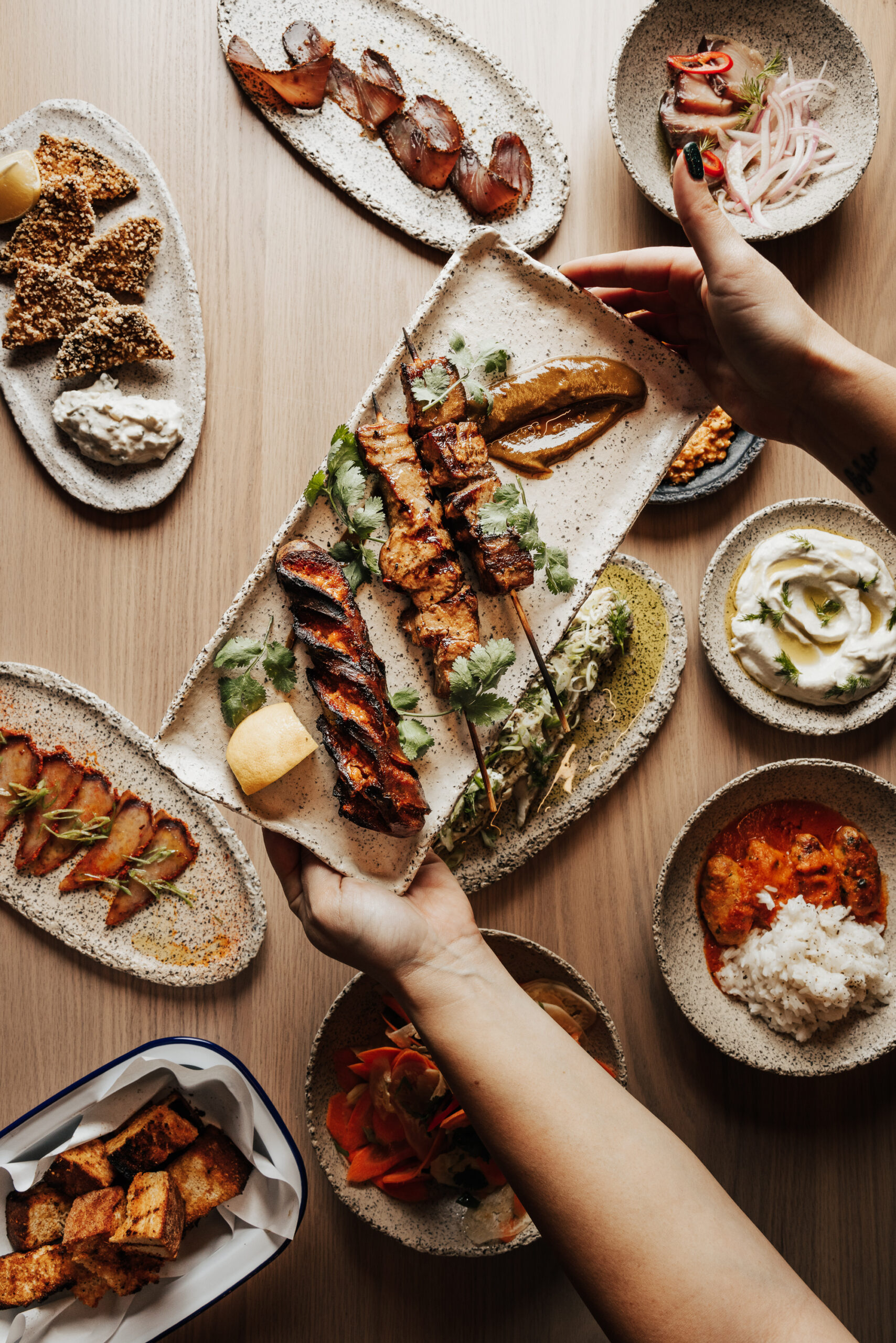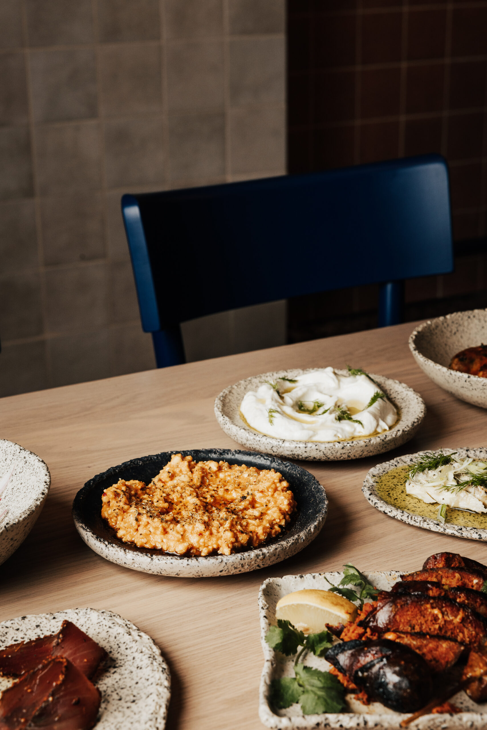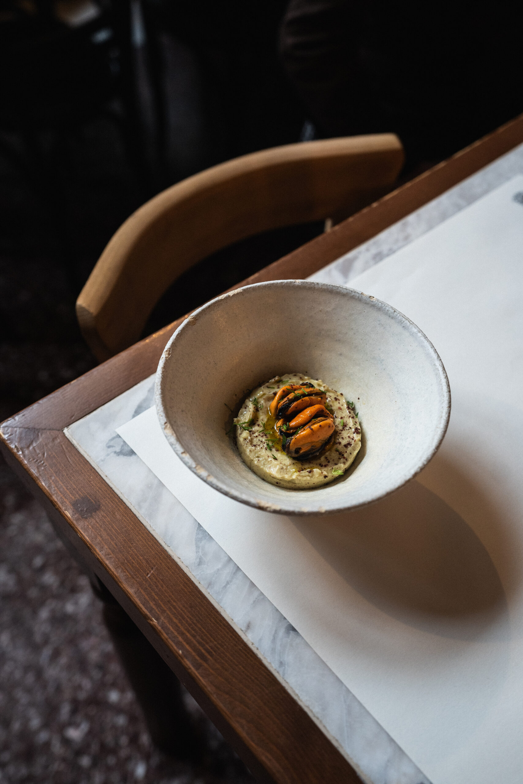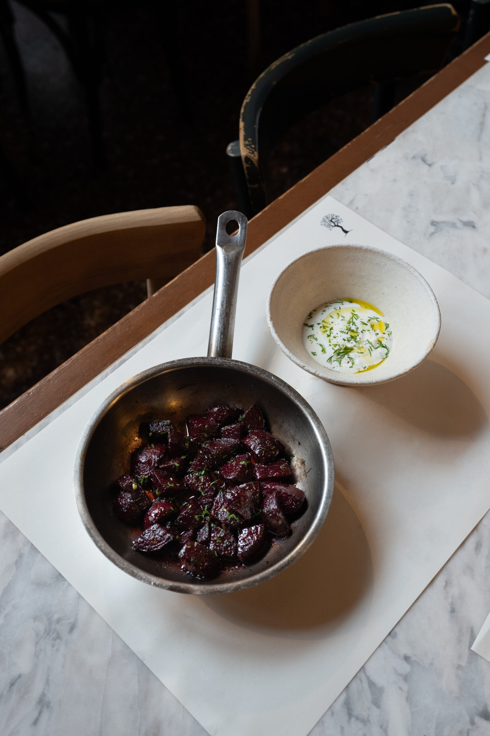 Την μέρα που πήγαμε είχε Λευκό ταραμά με καπνιστά μύδια αρωματισμένα με δεντρολίβανο. Μας άρεσε ο κόκκος του ψωμιού όπως τον έπιανε το δόντι ενώ τα μύδια δεν τα χορταίναμε. Εύσαρκα και ζουμερά σβησμένα με ξύδι από ξινόμαυρο, έφτιαχναν πολυεπίπεδες αρμονίες με την αλμυρότητα του ταραμά. Διάλειμμα από τη θάλασσα με ένα πιάτο της χειμωνιάτικης γης. Παντζάρι στο τηγάνι με συνοδεία ντιπ από αιγοπρόβειο γιαούρτι, σκόρδο και άνηθο παντζάρι στο τηγάνι με συνοδεία deep από αιγοπρόβειο γιαούρτι σκόρδο και άνηθο -κλασικό, καλοφτιαγμένο με σπιτική αίσθηση. Πίσω στη θάλασσα, η Σουπιά στη σχάρα με πρασοσέλινο αυγολέμονο. Άλλο ένα πεντανόστιμο πιάτο όπου η σουπιά τρυφερή χωρίς να λιώνει ανεβάζει ένταση στο πρασοσέλινο με τις νότες του καπνού από τη σχάρα. Άλλο ένα πιάτο που ενθουσίασε ορισμένους από την παρέα ήταν το Κεμπάπ τόνου πάνω σε flatbread με τσιπς από αγκινάρα Ιερουσαλήμ (topinambur) και συνοδεία ρώσικη σαλάτα.