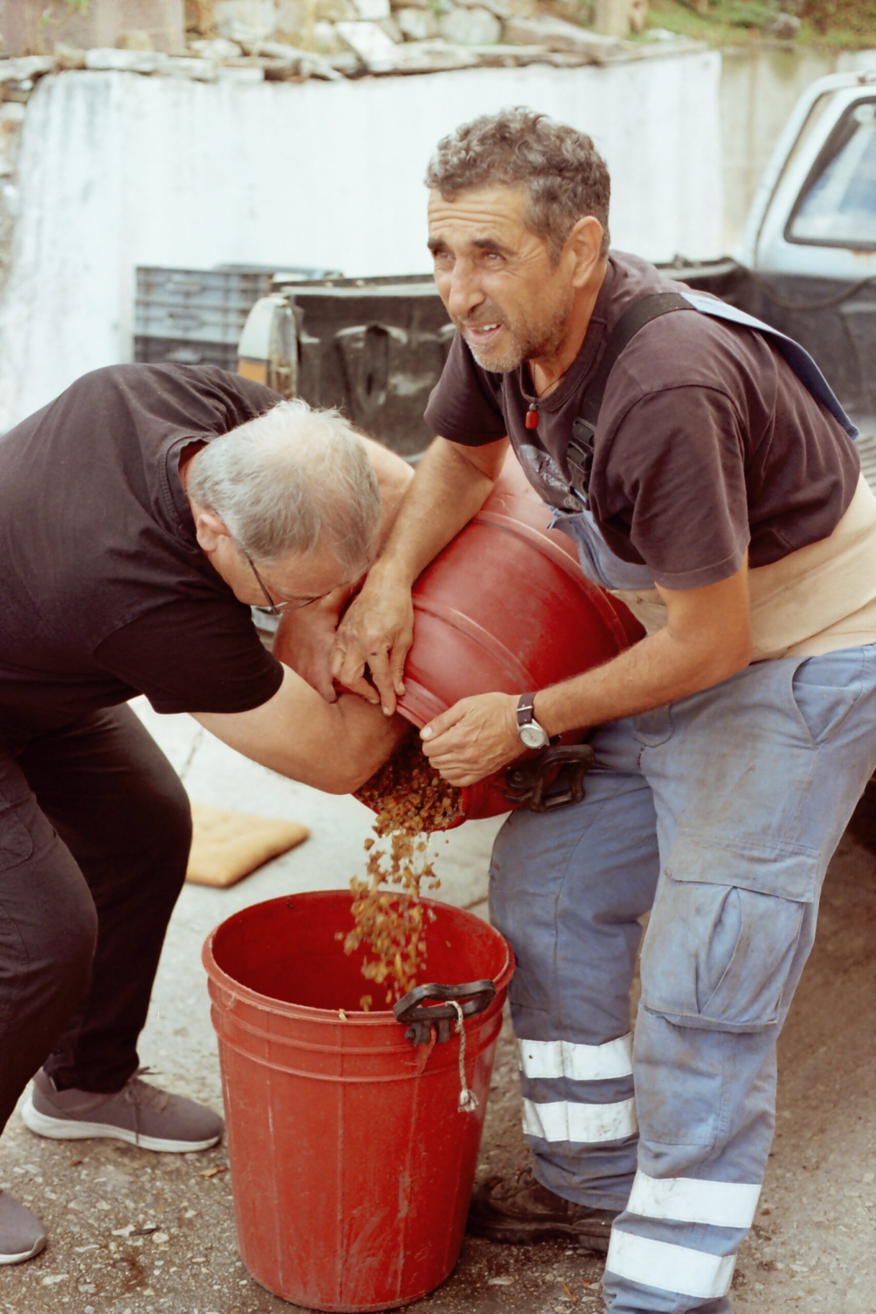Ο καζανιέρης Φώτης Ματθαίου με έδρα την Υδρούσσα στα δυτικά του νησιού, τριγυρνάει μες στα καζάνια απ’ όταν μπορεί να θυμηθεί τον εαυτό του. «Από παιδιά μες στ’ αμπέλια και τα καζάνια μεγαλώσαμε. Αυτή είναι η ζωή μας. Πάντα, θυμάμαι, περιμέναμε πως και πως να έρθει η εποχή αυτή των καζανιών, να έρθουμε όλοι κοντά, να βρεθεί μαζί το χωριό, οι φίλοι, οι παρέες». Και πράγματι, όταν με υποδέχτηκε στο καζάνι του, αισθάνθηκα αυτή την παρεΐστικη διάθεση που περιέγραφε να διαποτίζει τον χώρο με μια γλυκιά ζεστασιά.